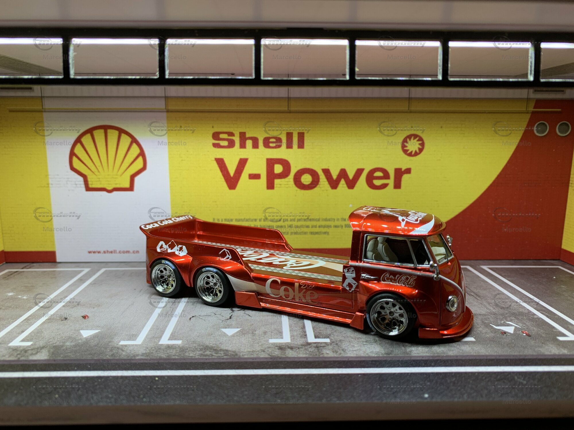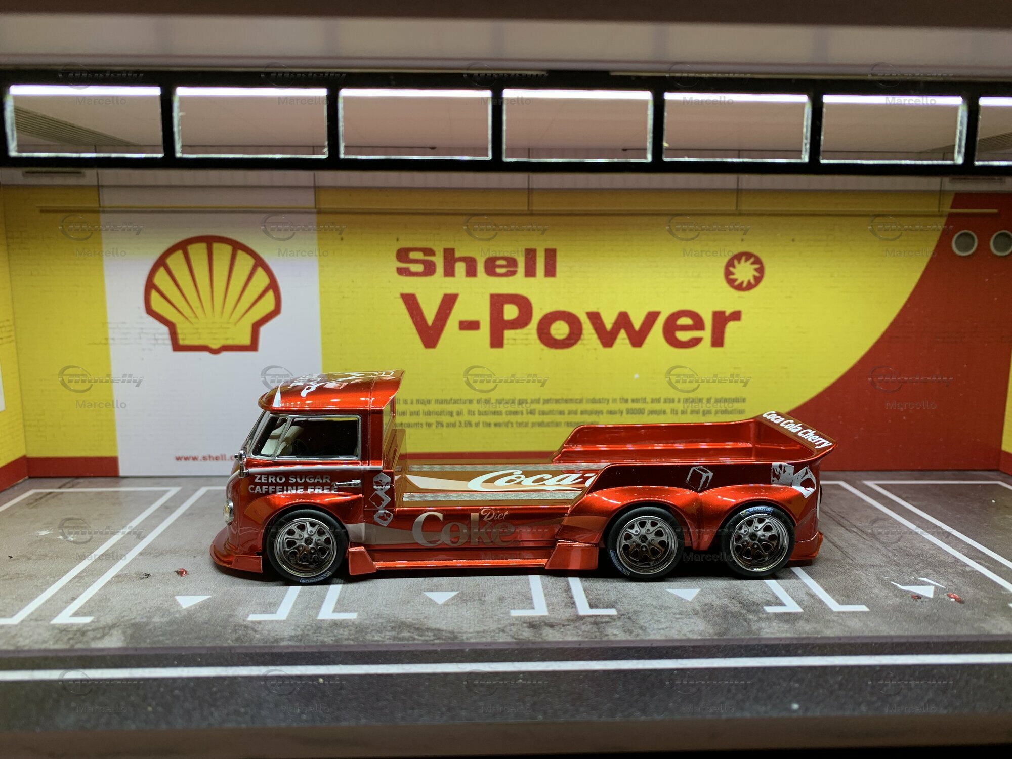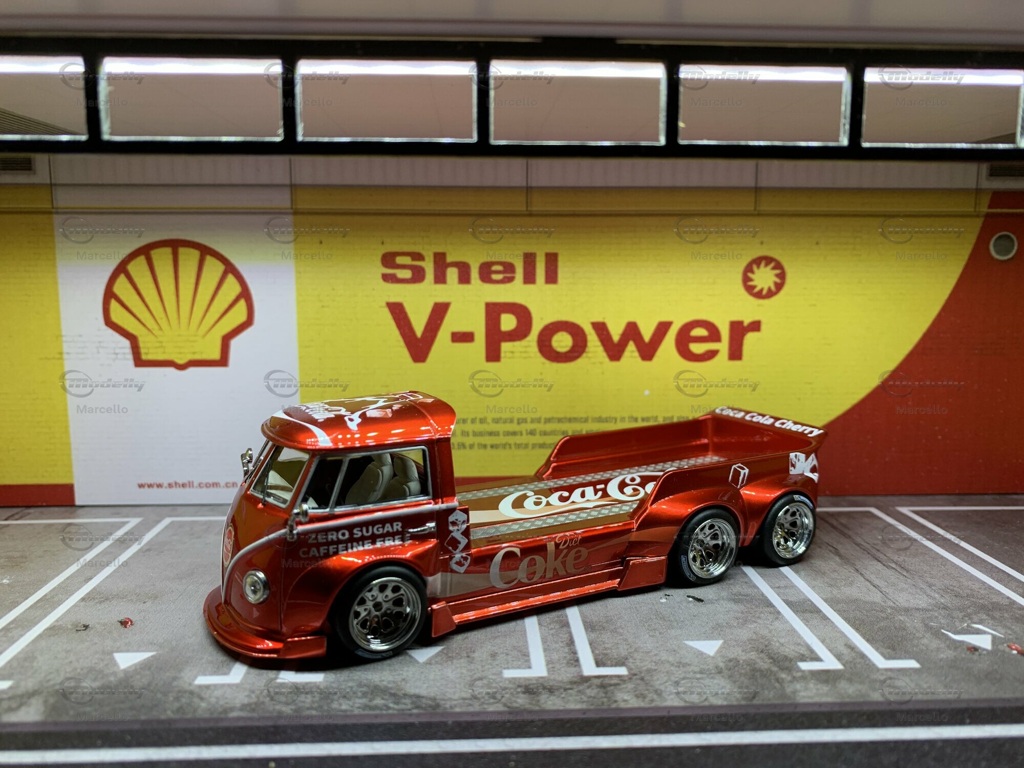 The model we’re checking out here, made by Liberty64, is crafted with tons of attention to detail. It's a limited edition, with only 999 pieces made. This baby is made from diecast material, known for being tough and high-quality. The standout feature is the vibrant red paint with a smooth metallic finish, bringing the Coca-Cola Cherry theme into focus. The Coca-Cola logos, mixed with zero-sugar ads and cherry motifs, give this model a cool, collectible vibe. The fine-spoked wheels and flawless finish make it a true highlight for any collection.