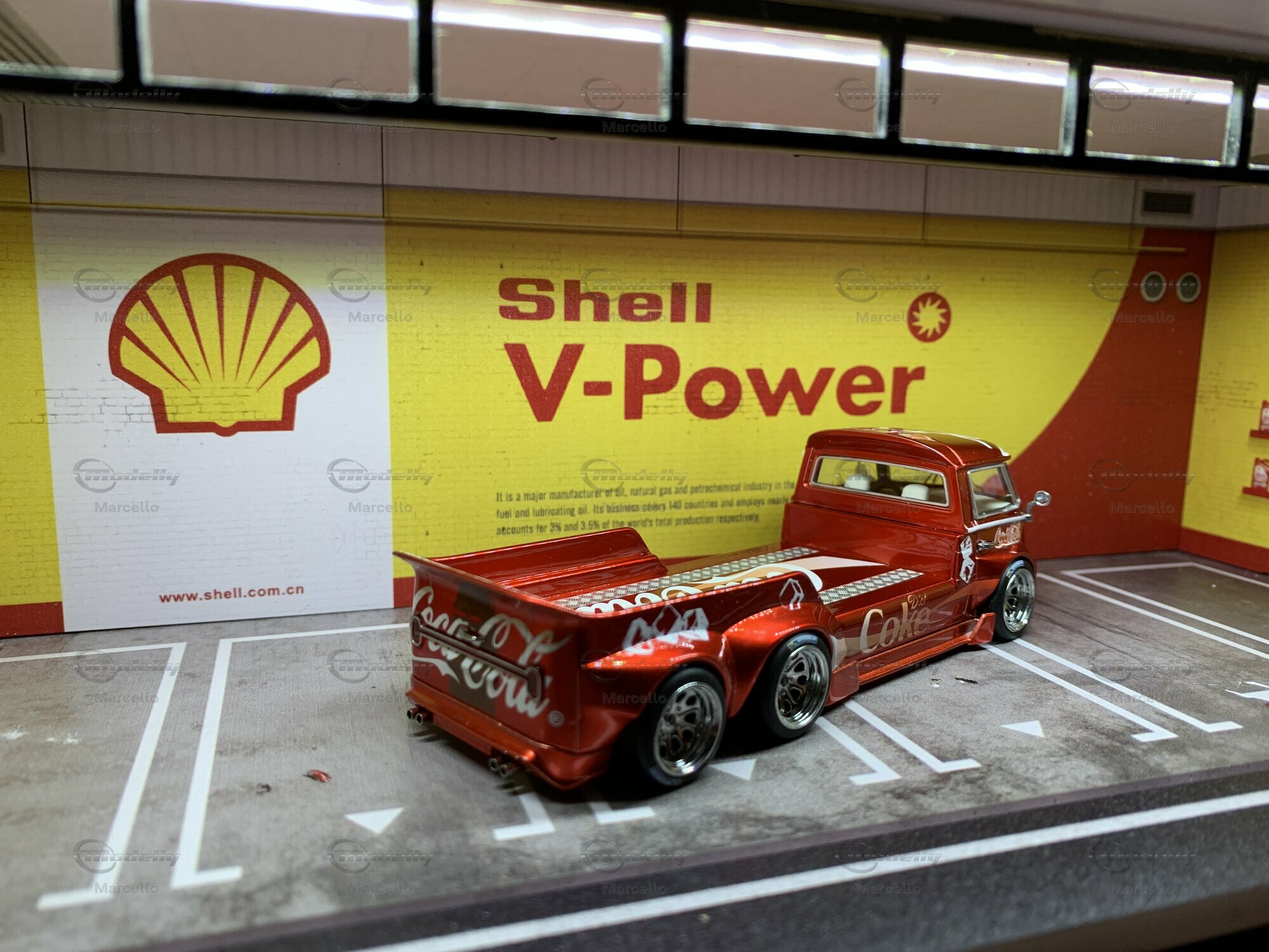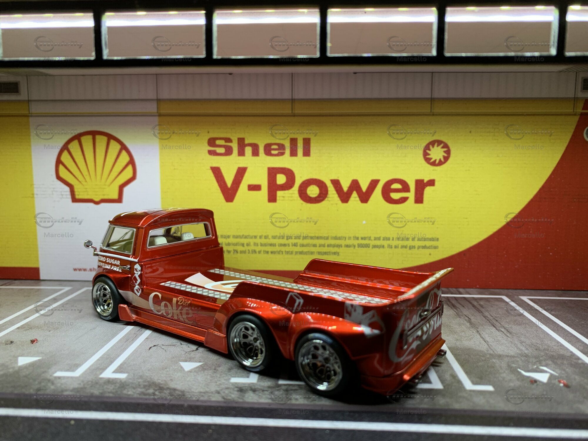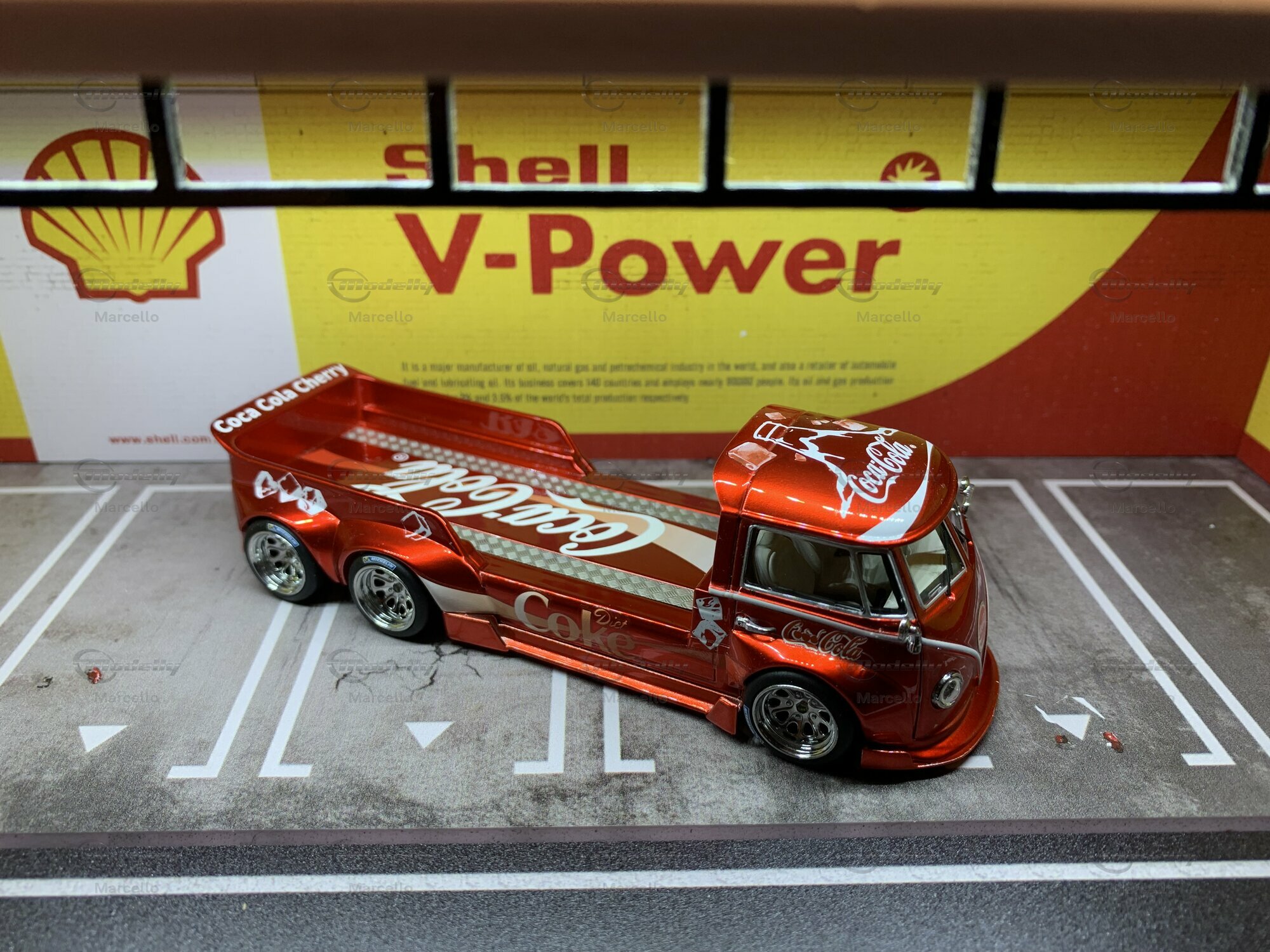 The model we’re checking out here, made by Liberty64, is crafted with tons of attention to detail. It's a limited edition, with only 999 pieces made. This baby is made from diecast material, known for being tough and high-quality. The standout feature is the vibrant red paint with a smooth metallic finish, bringing the Coca-Cola Cherry theme into focus. The Coca-Cola logos, mixed with zero-sugar ads and cherry motifs, give this model a cool, collectible vibe. The fine-spoked wheels and flawless finish make it a true highlight for any collection.