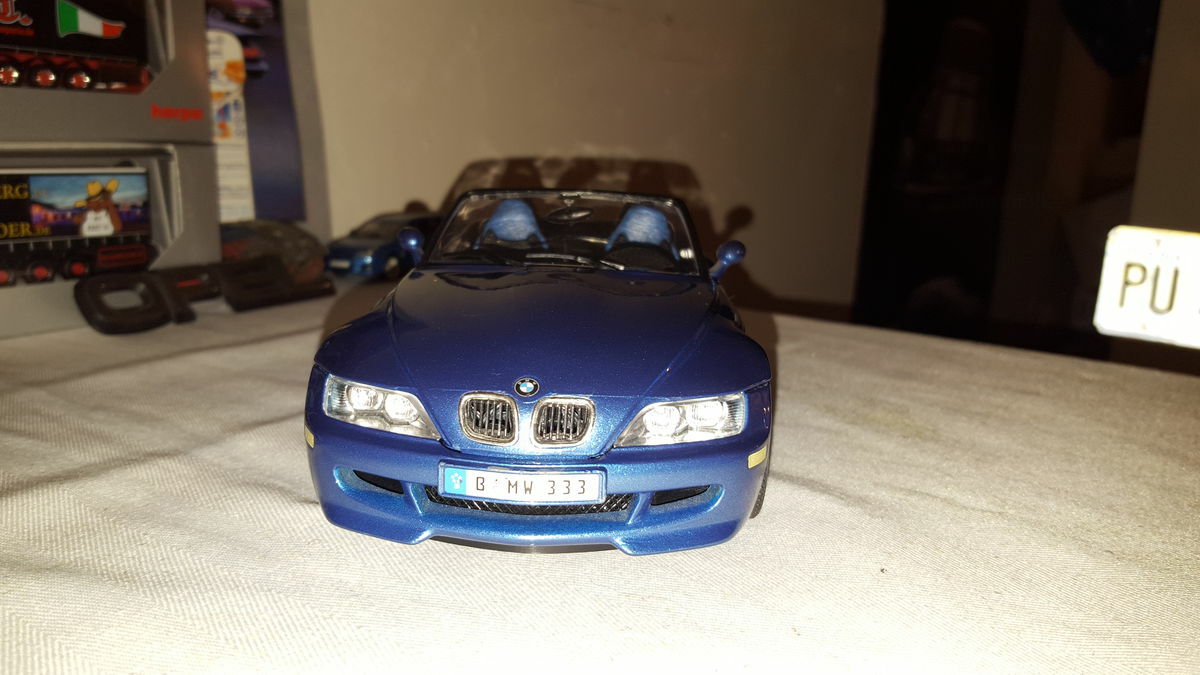 The scale model in 1/18, made by Bburago, reflects the essence of the BMW Z3 M Coupè. The miniature was crafted from various materials that significantly contribute to the accuracy of this replica. The version shown in the photos presents a lovingly customized edition, not representing the original model produced by Bburago. The model's paint job stands out with an intense blue color, complemented by metallic accents and true-to-life badges. This detailed and realistic exterior finish excellently captures the elegance and sportiness of the original.