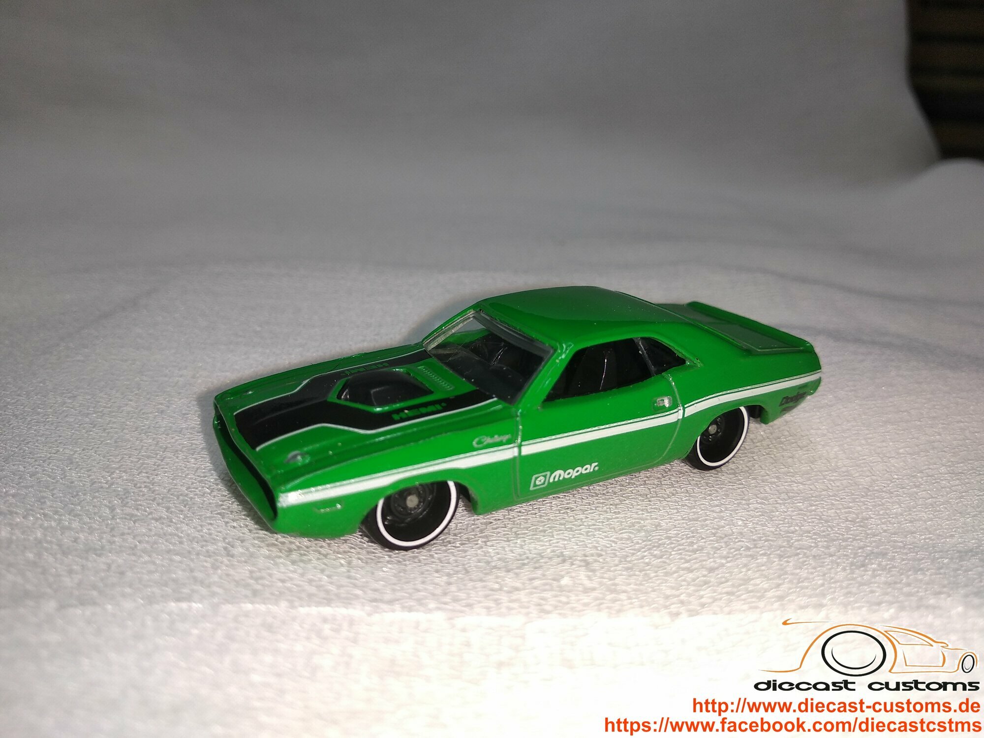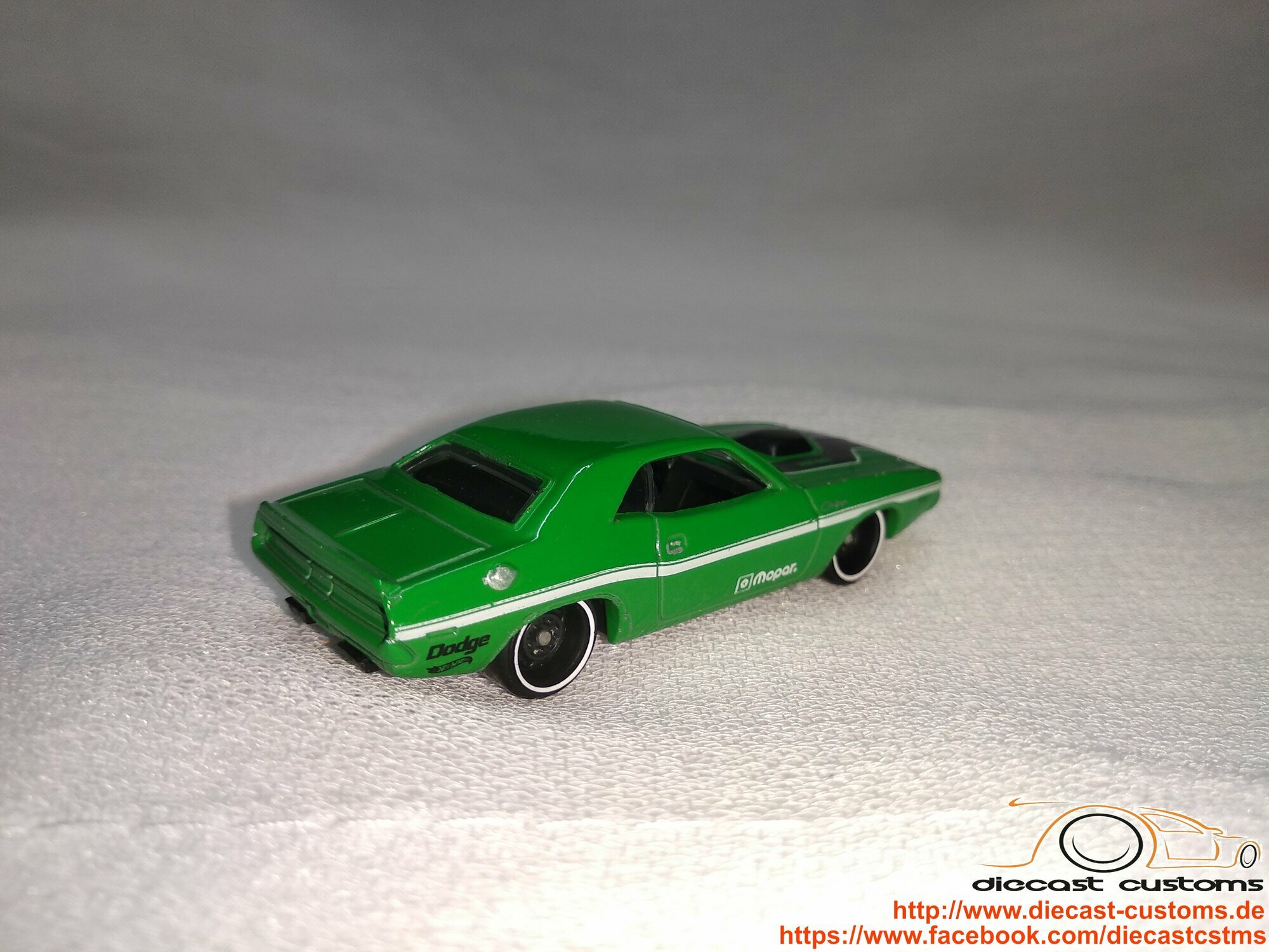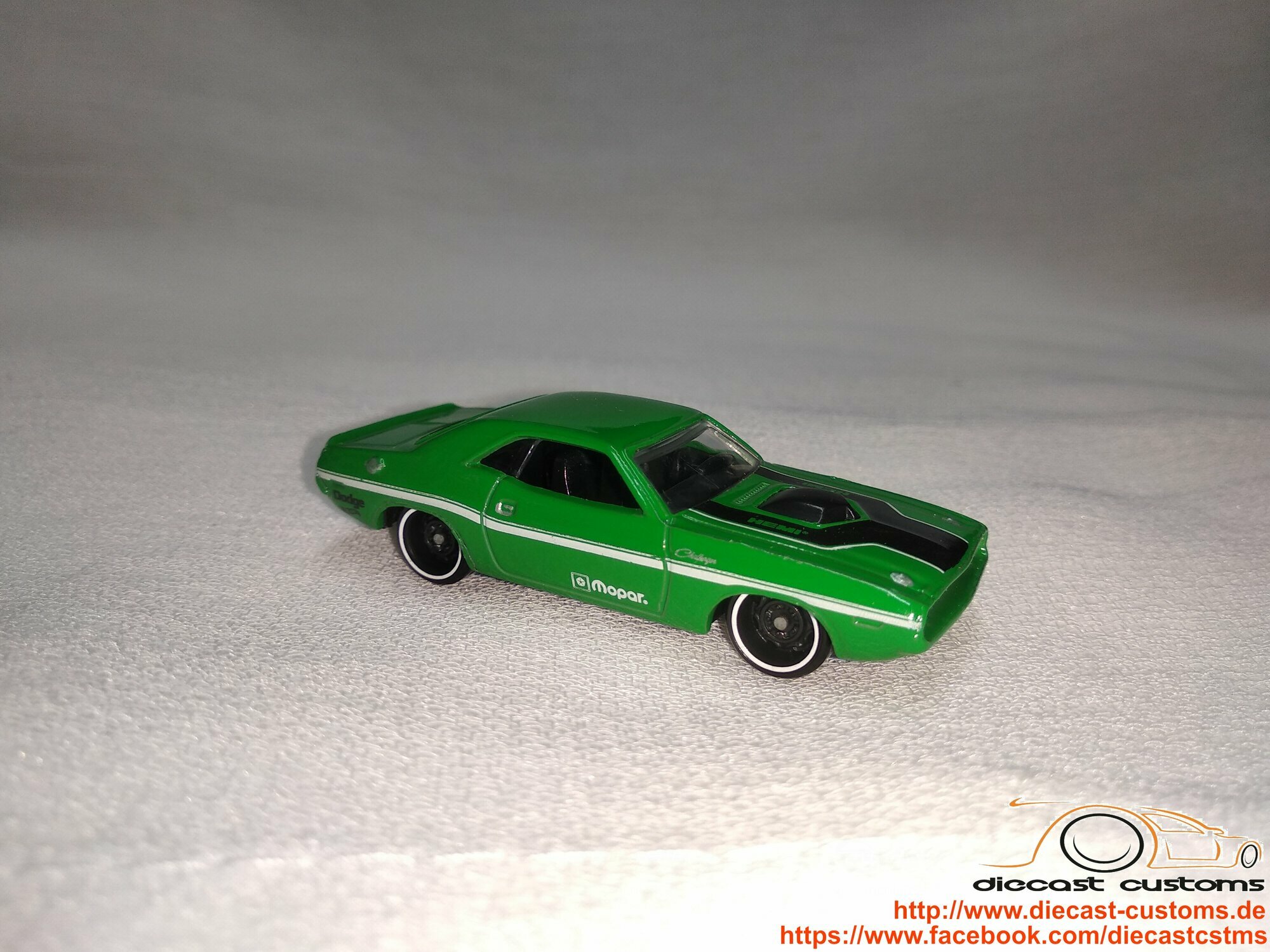 The Hot Wheels 1/64 scale miniature showcased here is a gem for collectors. Made of diecast, this miniature offers remarkable detail and quality. This model depicts the Challenger in a striking green paint with black racing stripes and the Mopar logo on the side, emphasizing the vehicle's performance heritage. The white stripes on the sides, the hood design, and the characteristic proportions contribute to an authentic representation. The wheels are also a highlight and add to the overall appeal of the model.