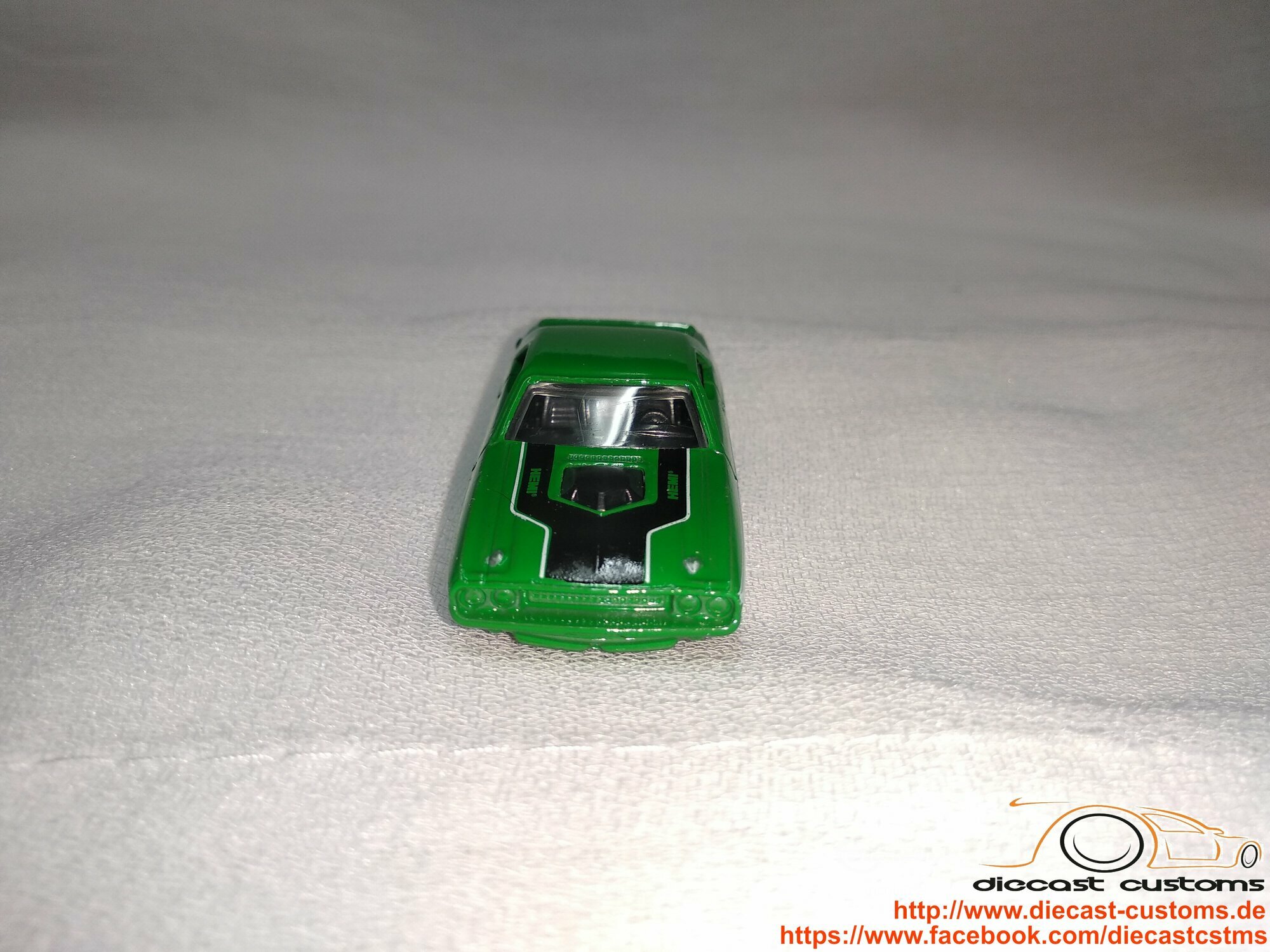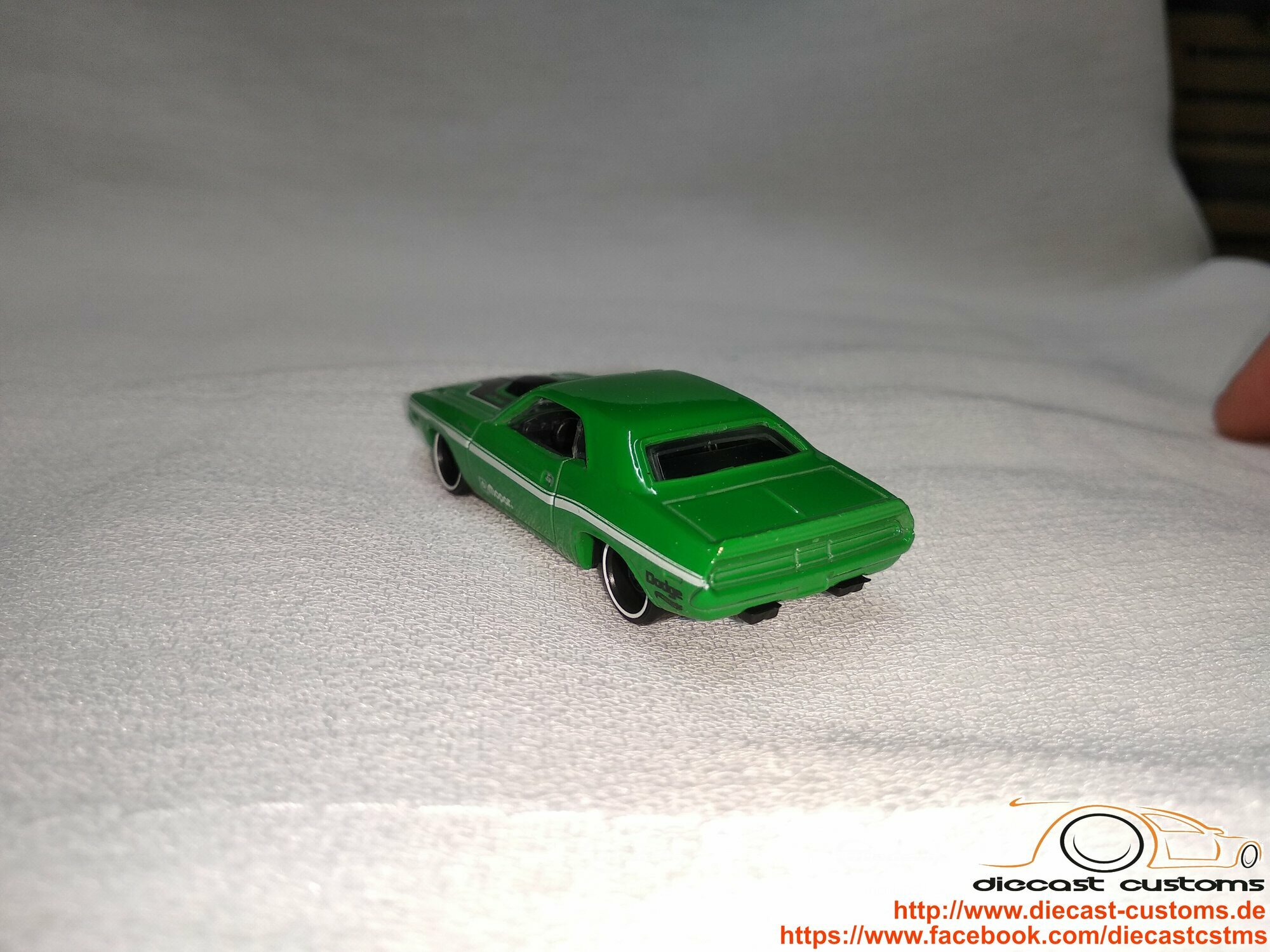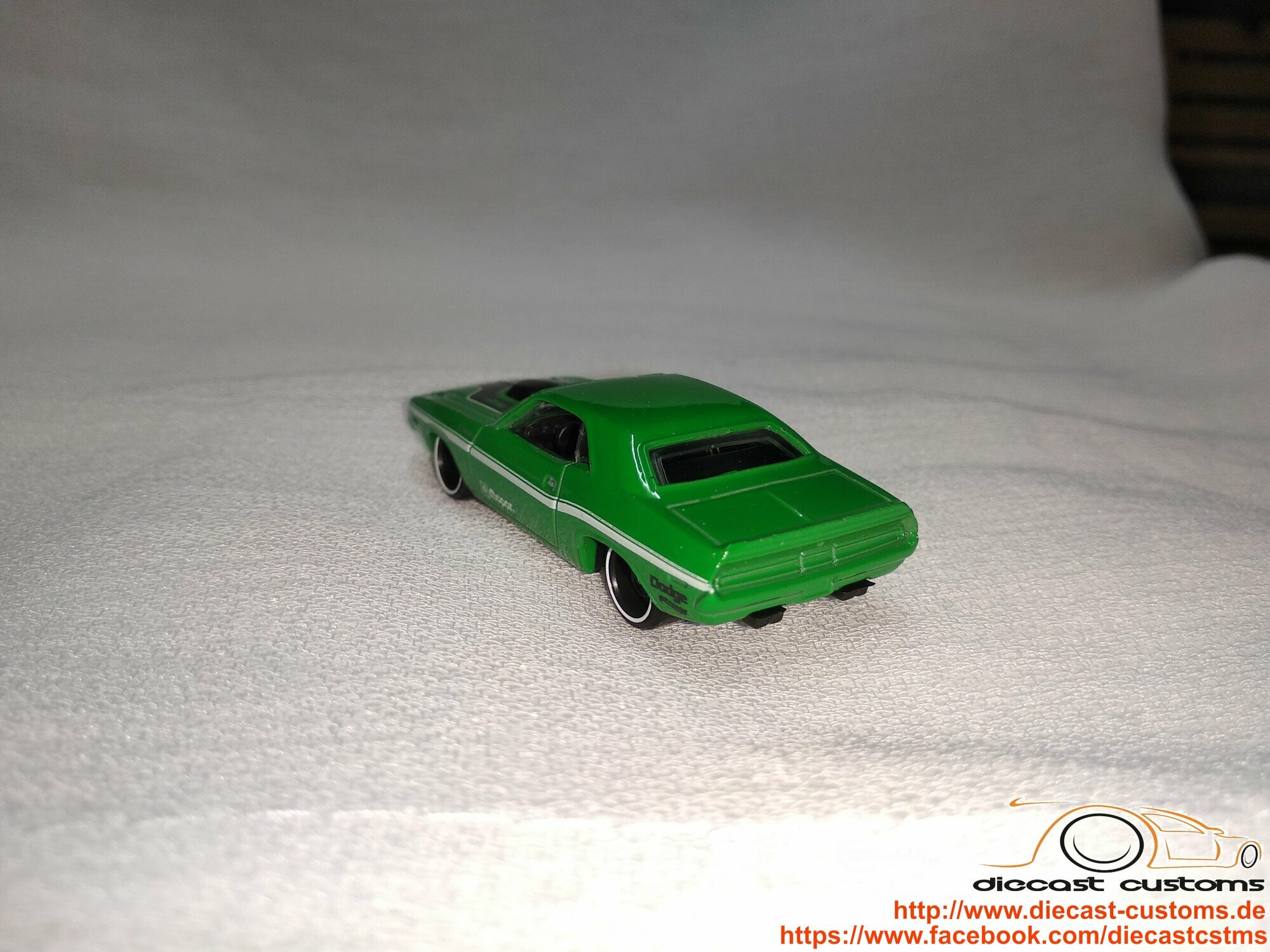 The Hot Wheels 1/64 scale miniature showcased here is a gem for collectors. Made of diecast, this miniature offers remarkable detail and quality. This model depicts the Challenger in a striking green paint with black racing stripes and the Mopar logo on the side, emphasizing the vehicle's performance heritage. The white stripes on the sides, the hood design, and the characteristic proportions contribute to an authentic representation. The wheels are also a highlight and add to the overall appeal of the model.