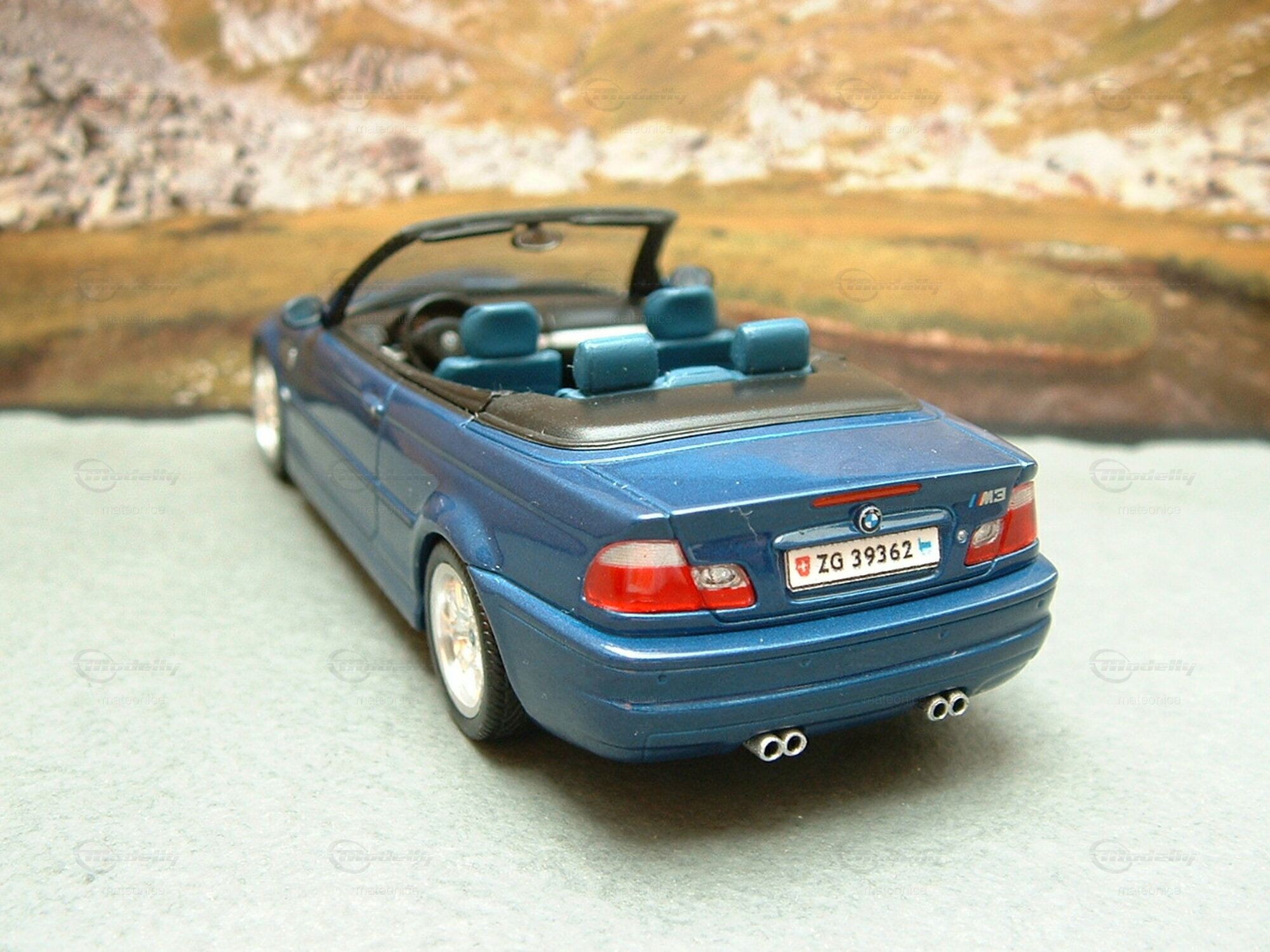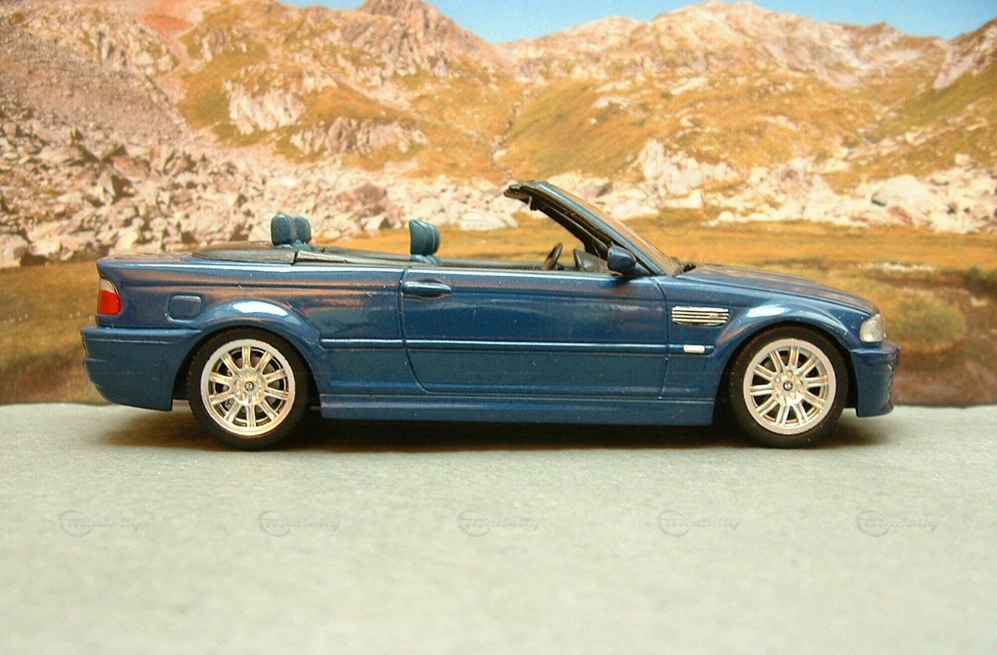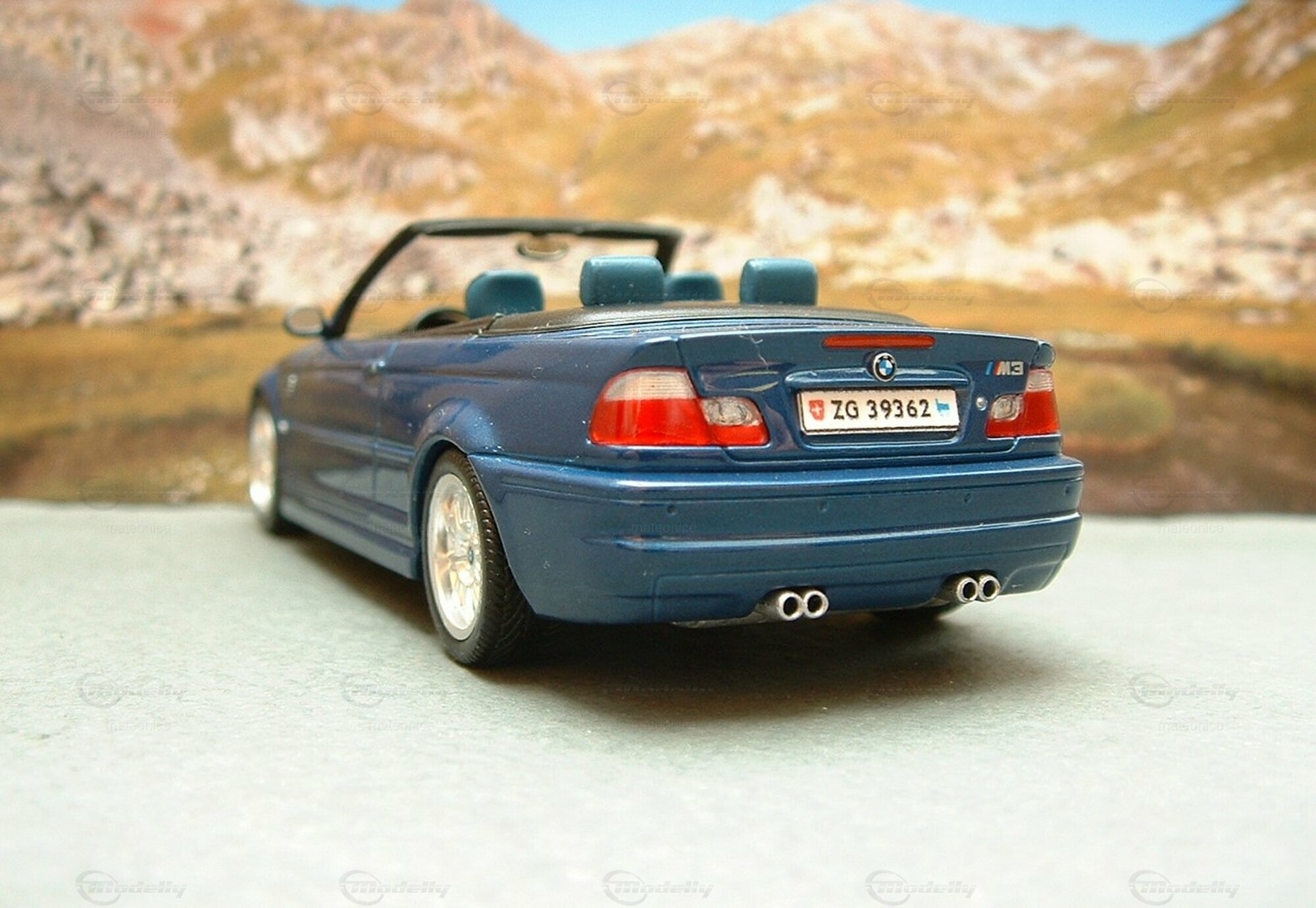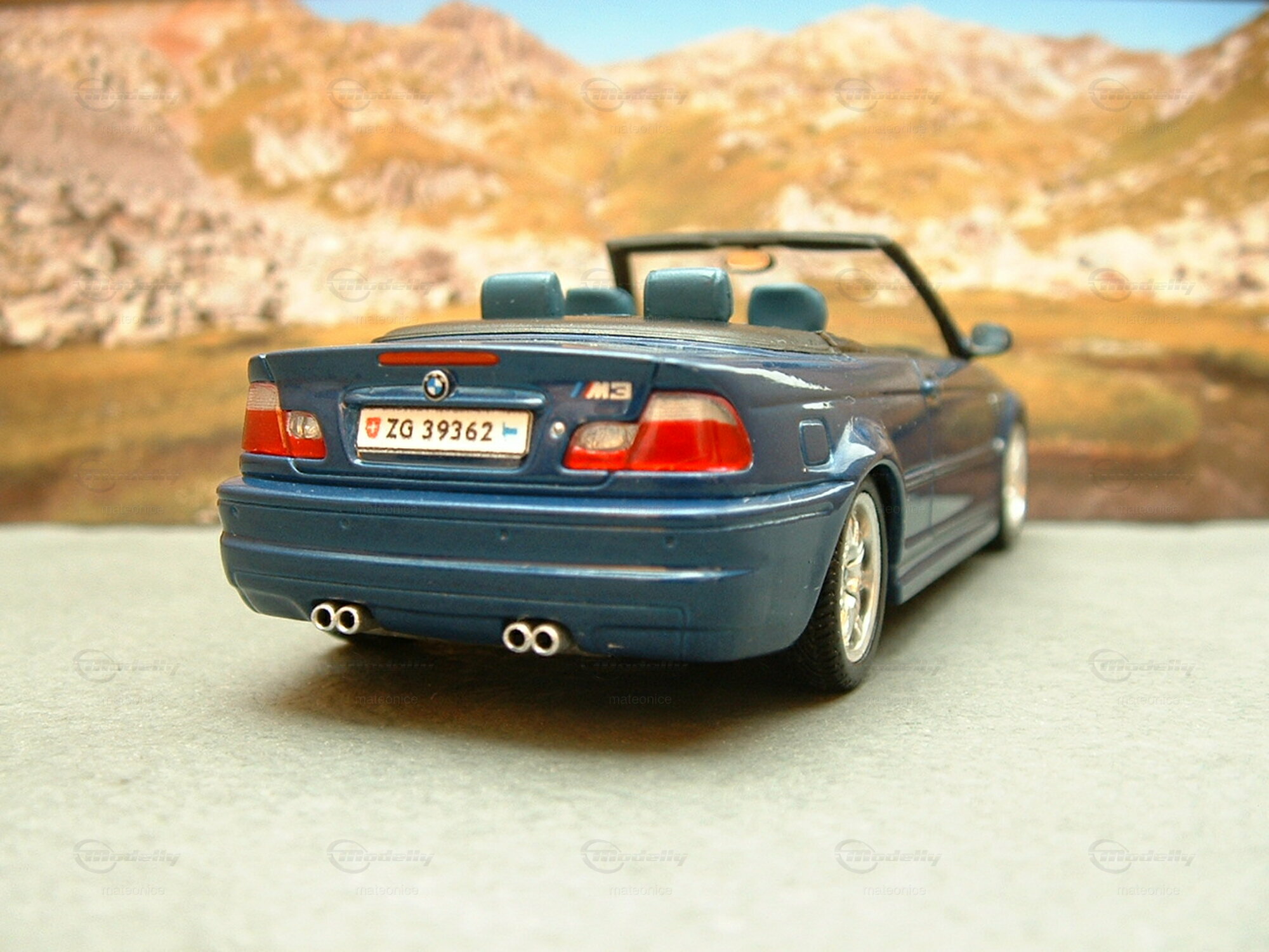 The scale model featured here at 1/43 scale is a detailed, high-quality replica of the BMW M3 Cabrio (E46). Manufactured by Minichamps using diecast material, it offers amazing detail accuracy and precision. However, it is a modified version that does not reflect the original product produced by Minichamps. This special miniature is part of a limited edition, one of only 2400 worldwide.The exterior paintwork showcases an attractive metallic blue that shimmers in the light, accentuating the curves of the vehicle. The front end is detailed with the characteristic twin headlights and BMW kidney grille, while the interior is finished in a realistic blue shade. At the rear, the M3 emblems and license plate are meticulously recreated. Model car collectors worldwide appreciate the attention to detail and high-quality craftsmanship of this miniature.