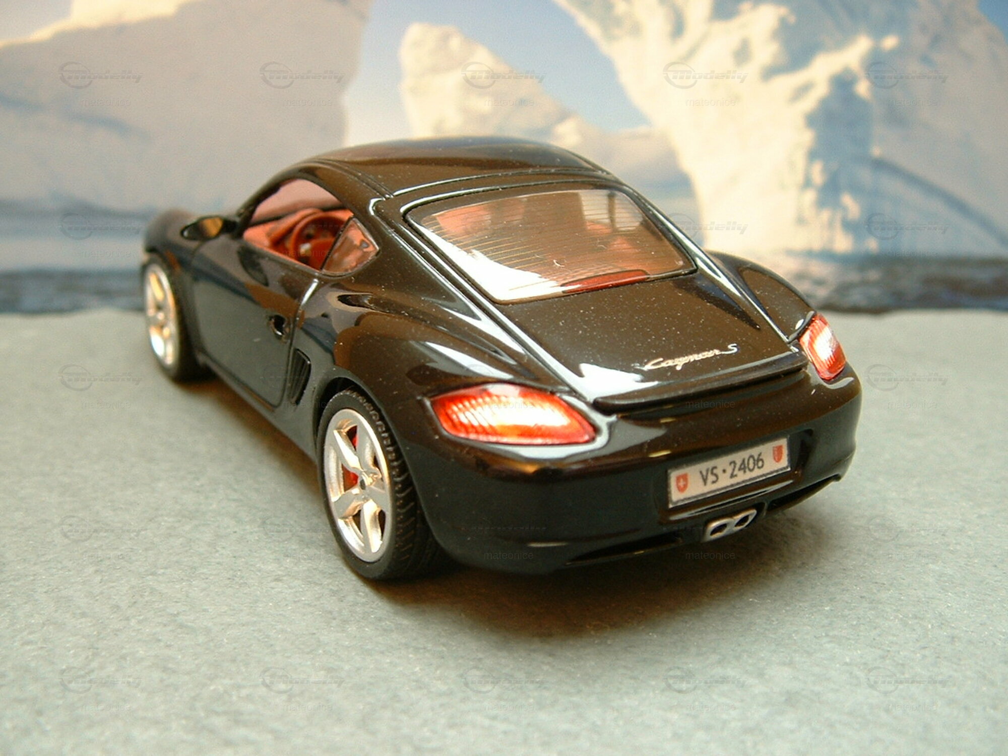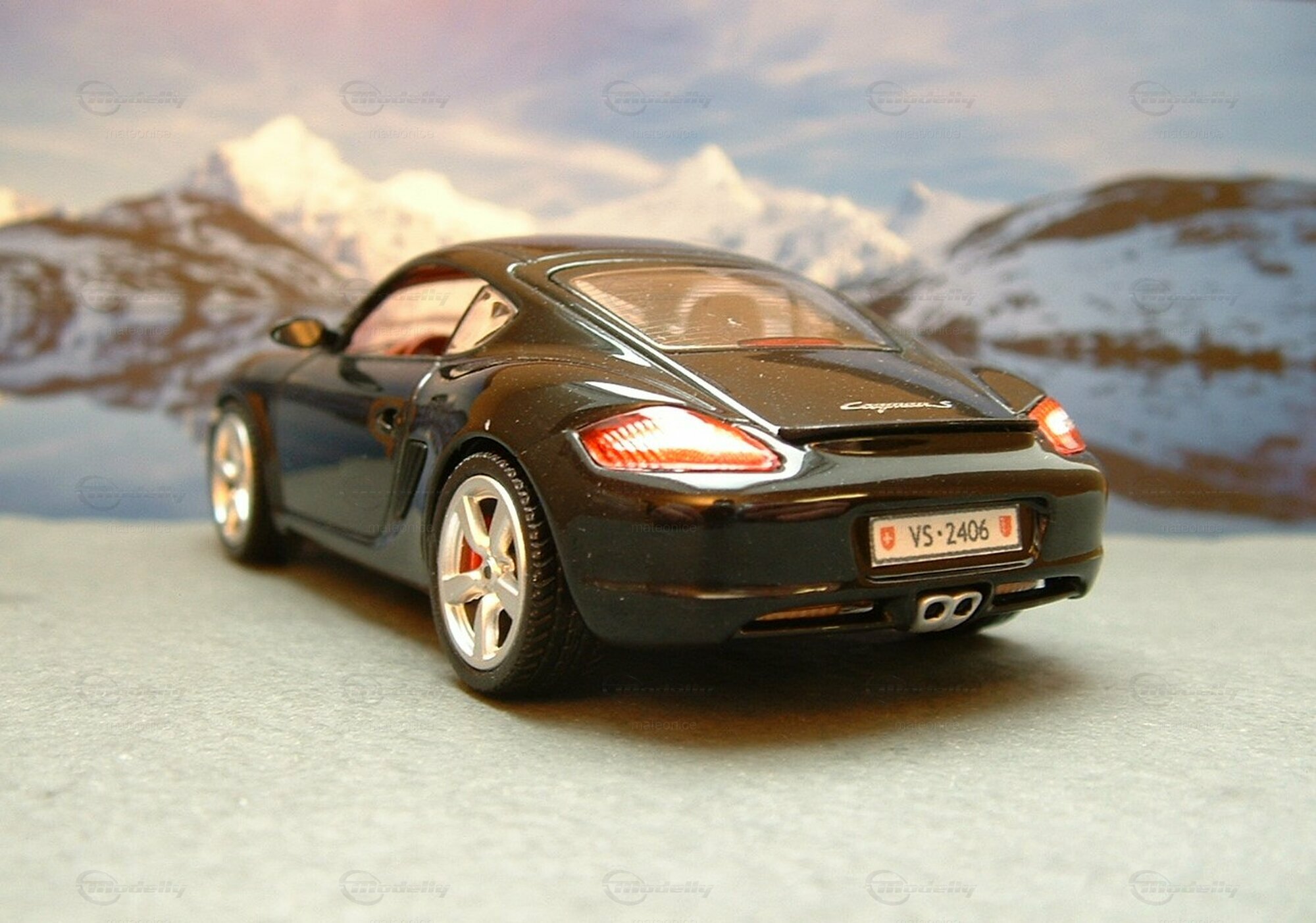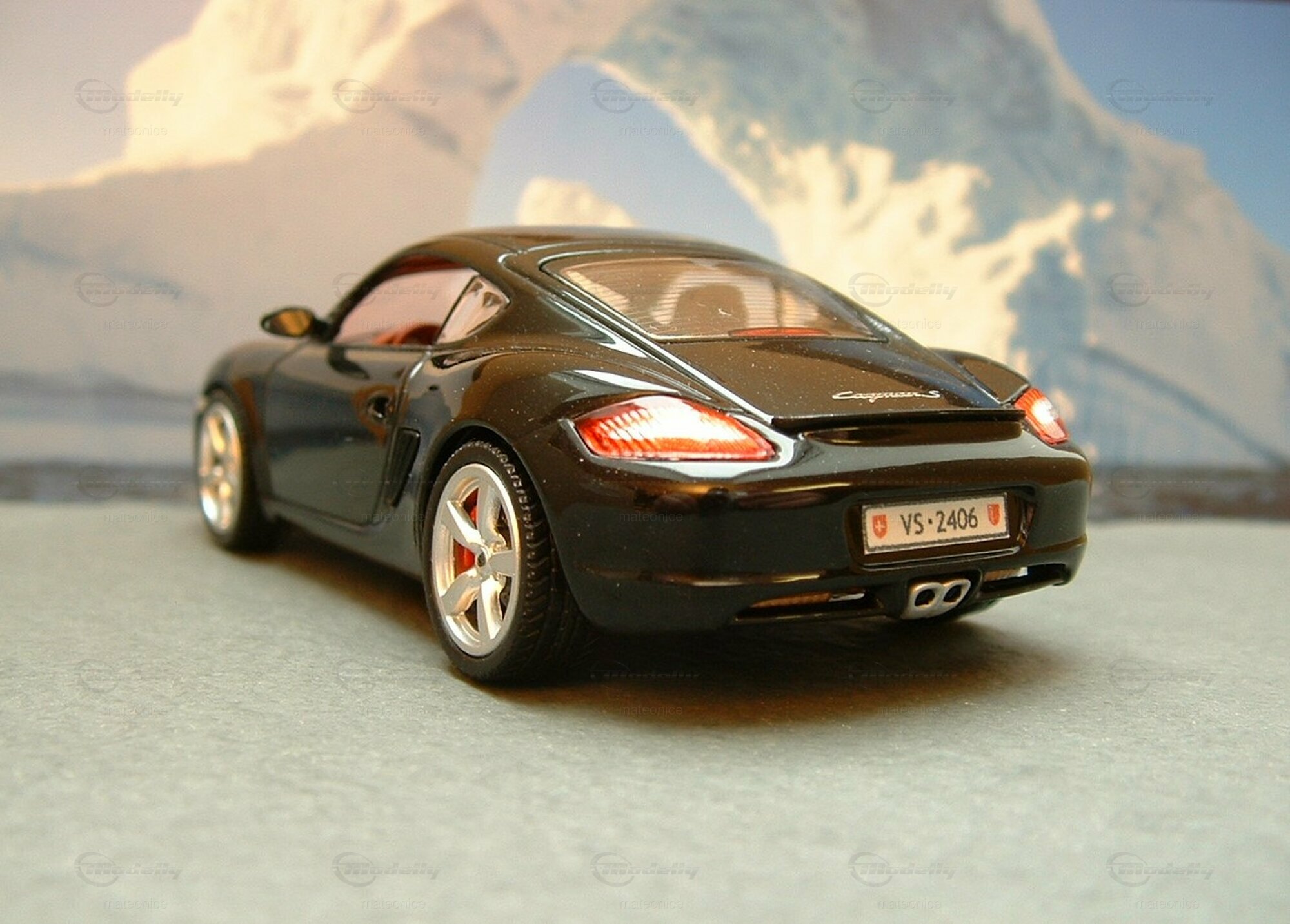 The miniature model showcases the fine curves and lines of the real Porsche Cayman S. The black paint job is precisely applied and shines, just as it would on a real Porsche. The view of the rear displays exhaust pipes and the Cayman S emblem stylishly placed. Every exterior detail is reproduced to get as close as possible to the original sports car.