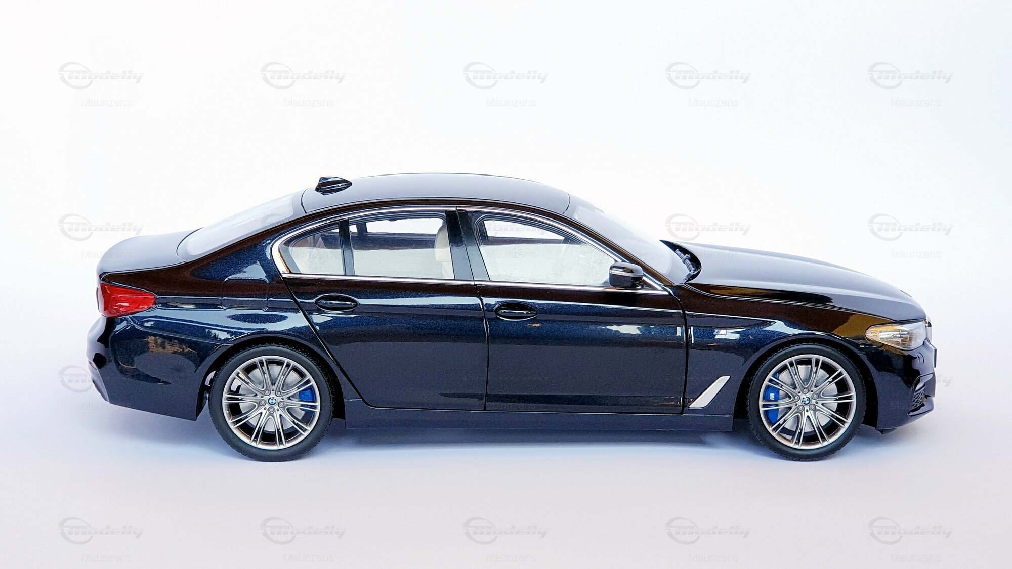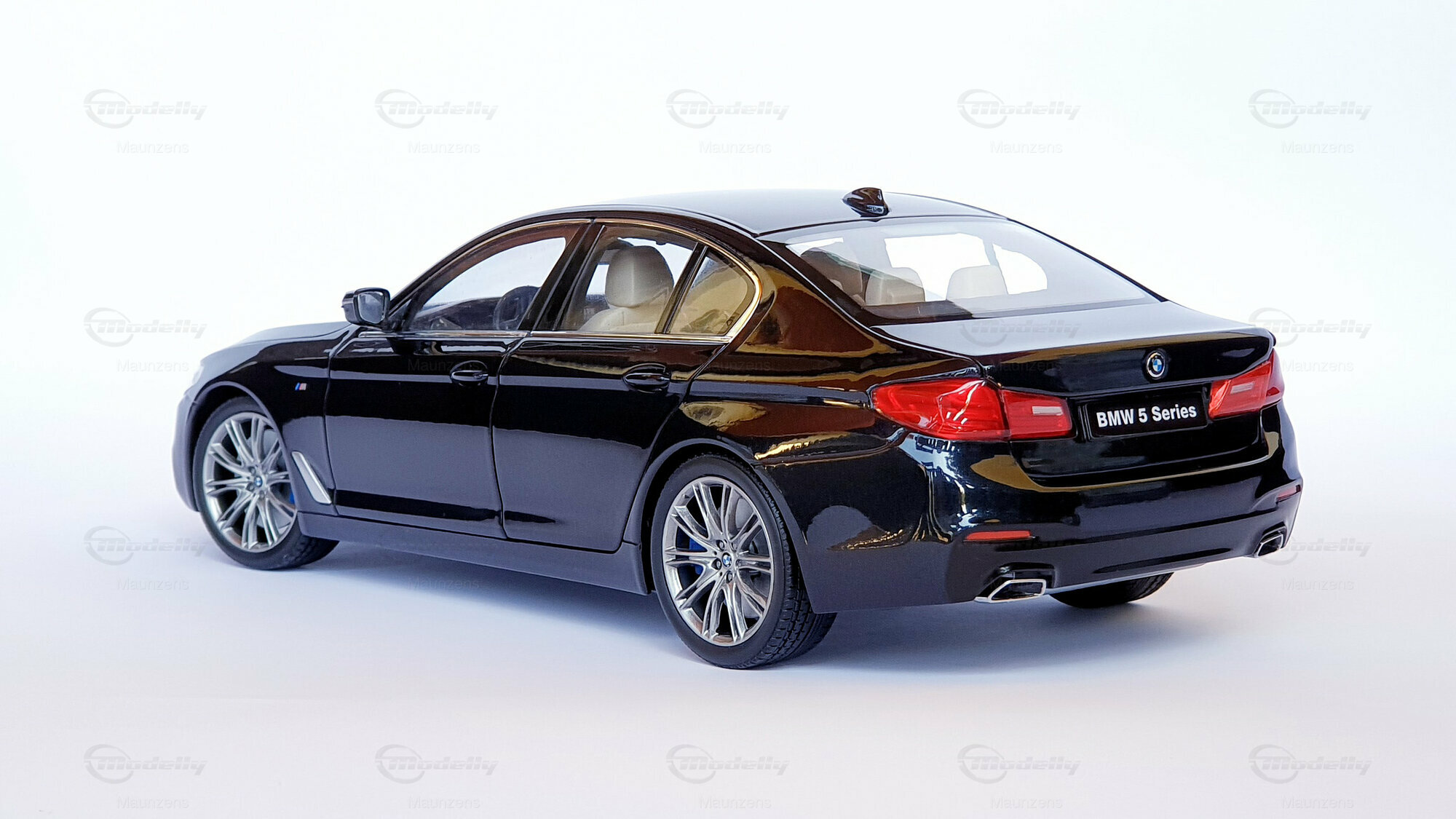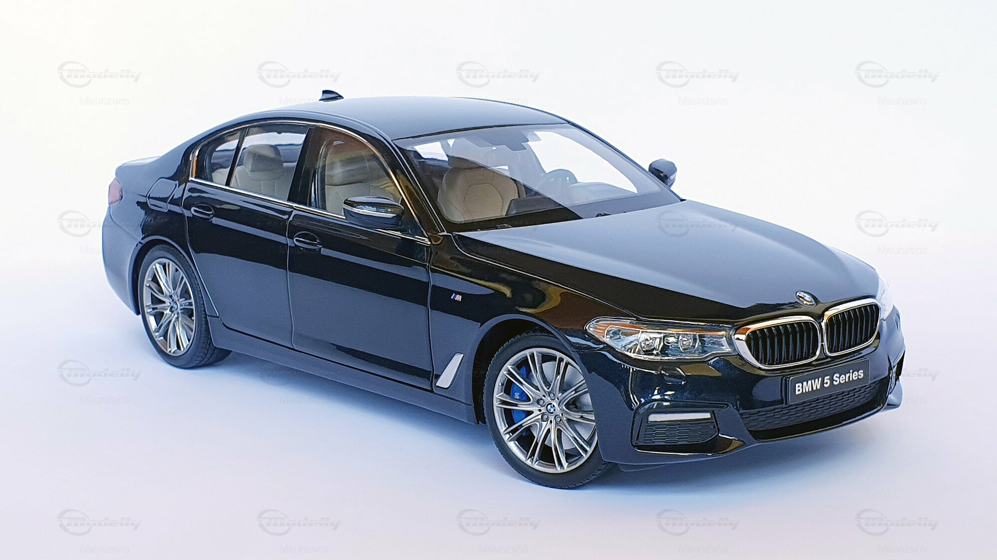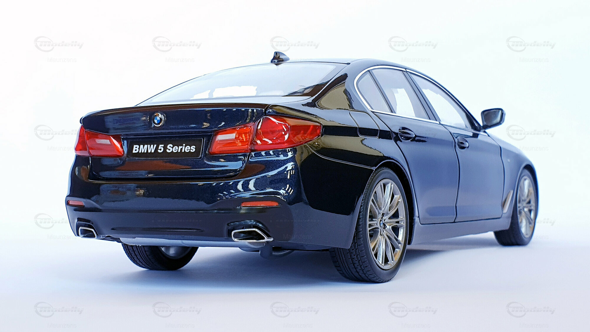 Another highlight of the 1/18 scale model by Kyosho is the exact replication of the paintwork and overall appearance. The deep metallic black paint, silver accents, and distinctive BMW detailing are striking. What makes this model especially appealing to collectors is the perfect balance between aesthetics and functionality. From the front view perspective in the image, you can recognize the distinctive design of the BMW 5 Series (G30) with its iconic kidney grille and sharp light lines.