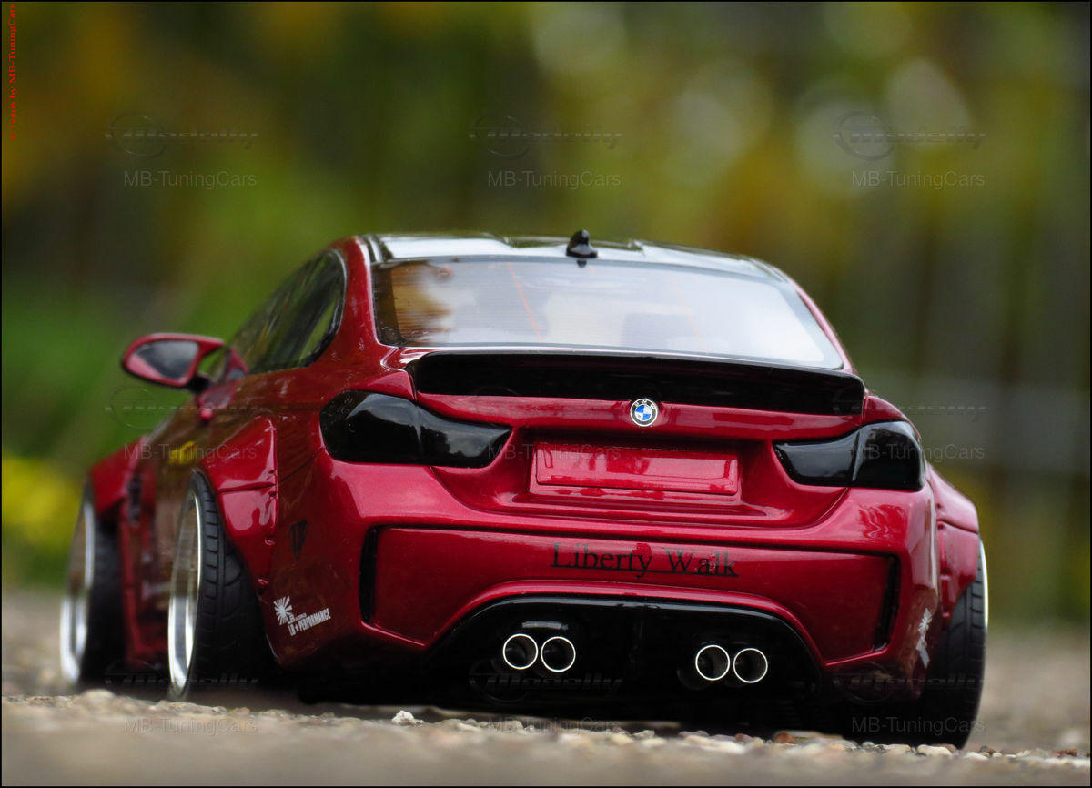 The model car shown here has been heavily modified and represents the work of Liberty Walk. This Japanese tuning company, founded in 2008 by Kato Wataru, is famous for its wild widebody kits and aggressive designs. The typical Liberty Walk style involves massive fender flares, prominent side skirts, and eye-catching spoilers, all of which are reflected in the M4 we see here. You can clearly see the Liberty Walk-inspired fenders on the model, which enhance the car’s sporty character.