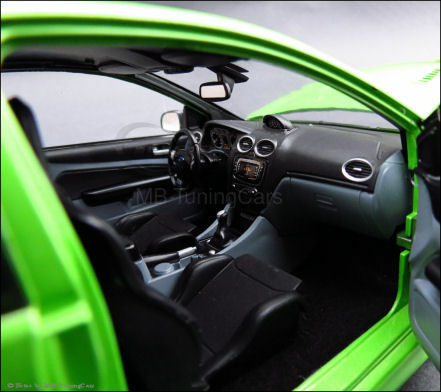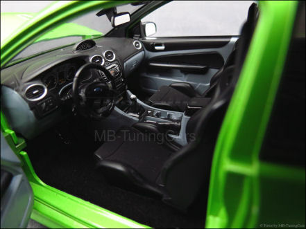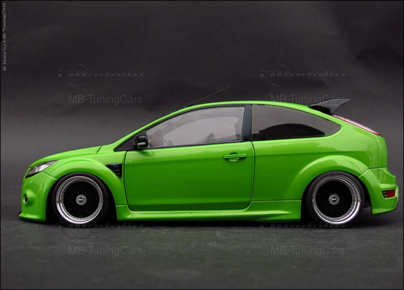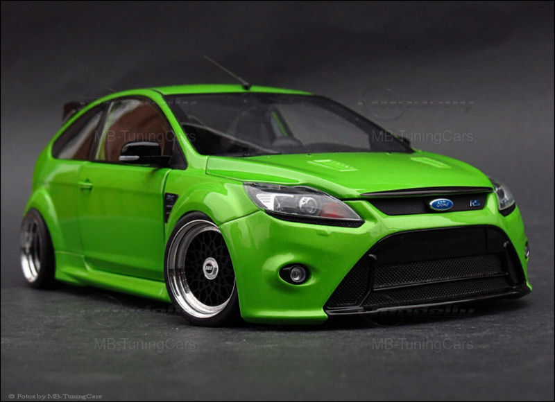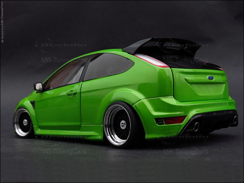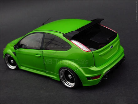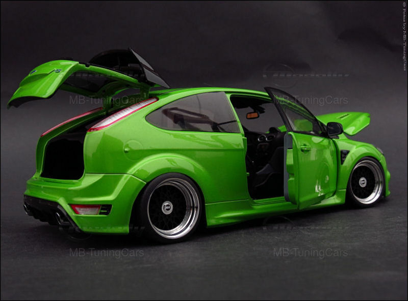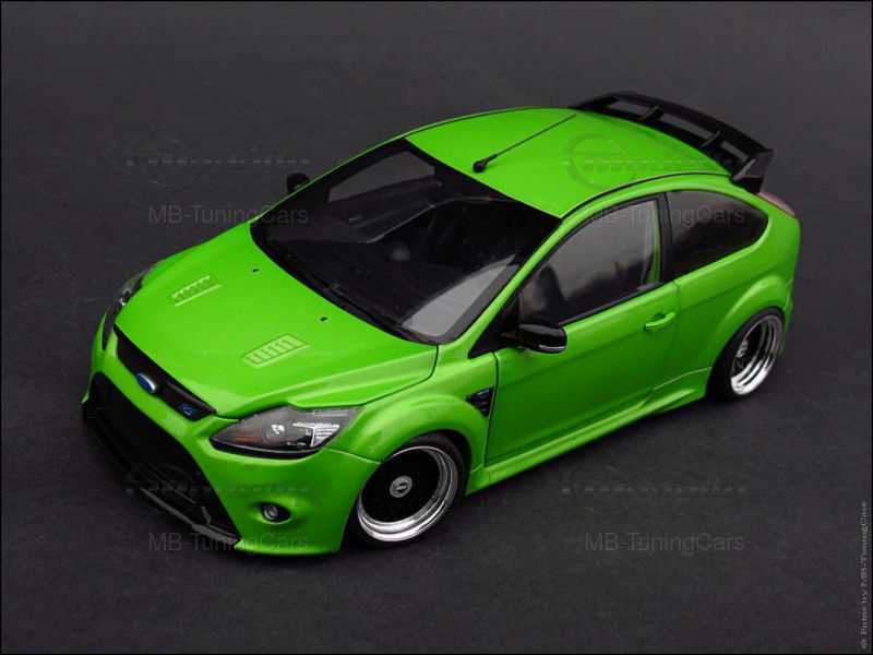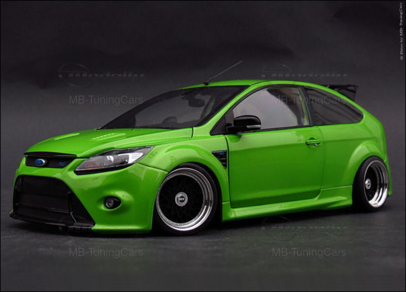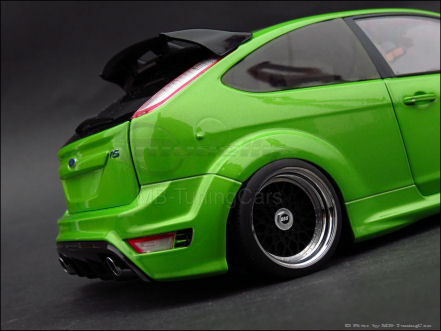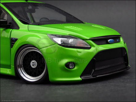 The Ford Focus RS miniature from Minichamps in 1/18 scale is an impressive representation of the original vehicle, albeit with modifications that deviate from the model originally produced by Minichamps. These modifications are clearly visible and give the model a unique appearance. The standout feature is the altered wheels, clearly labeled as Vossen with model VFS-1. These wheels replace the stock ones and provide a detailed and authentic enhancement that makes the model a standout in any collection. The green paint is applied to this miniature in its radiant "Ultimate Green" color scheme, adding a high level of realism.