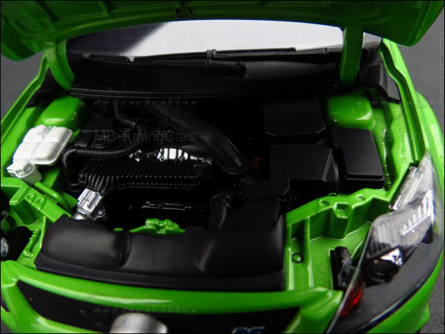 The third-generation Ford Focus RS featured front-wheel drive and came with an outstanding chassis specifically designed for sporty driving experiences. One of the notable innovations was the "RevoKnuckle" front axle design, a special modification of the MacPherson suspension to minimize torque steer. The vehicle could reach a top speed of 163 mph and accelerate from 0 to 62 mph in just 5.9 seconds. The engineers, especially Jost Capito, who served as project leader, paid great attention to fine-tuning the suspension system and aerodynamic components. The original's appearance was characterized by the distinctive "Ultimate Green" paint, which is also showcased in the 1/18 scale model version by Minichamps.