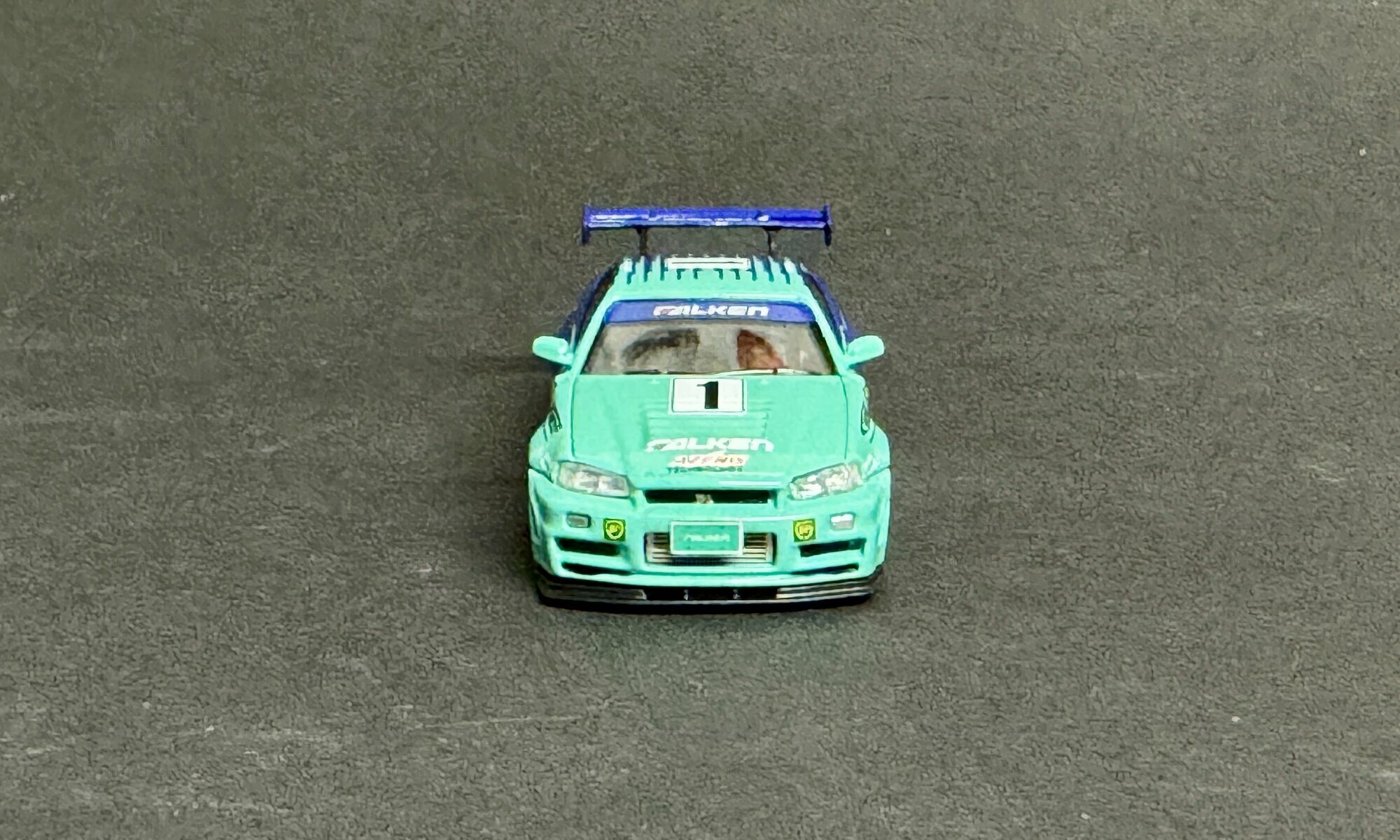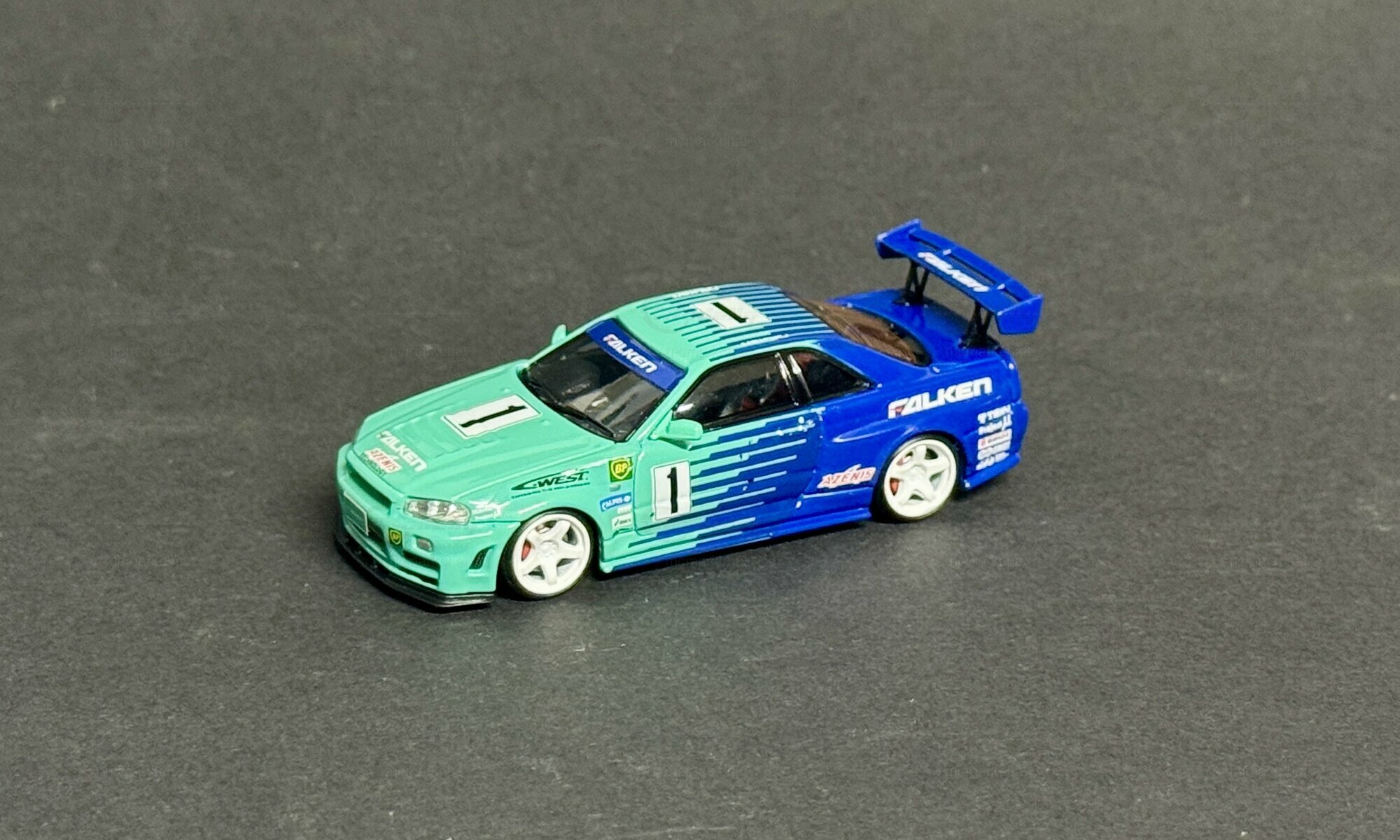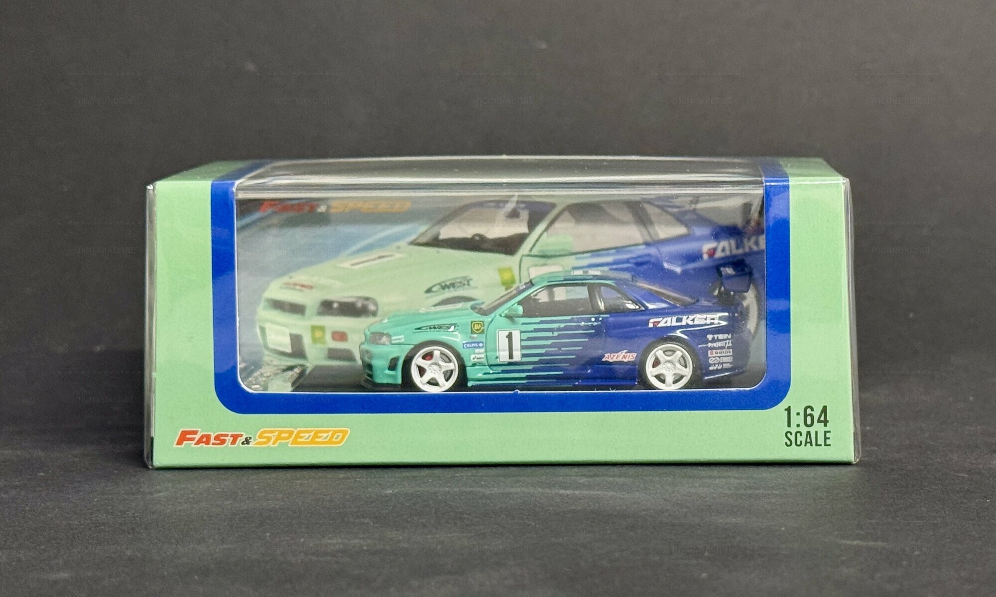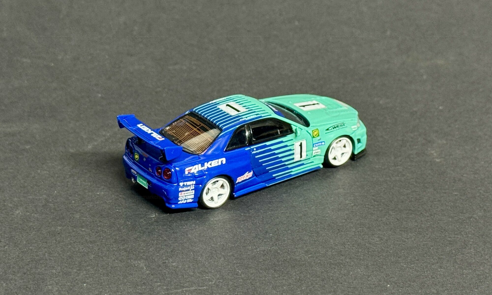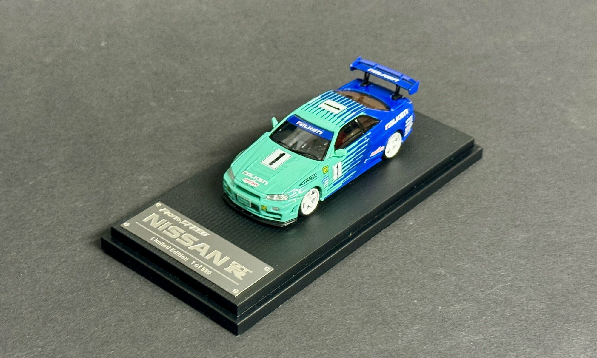 The model shown is a 1/64 scale diecast from Fast Speed and belongs to collector member “mcmarkchat.” It’s a limited edition; the limitation is 1 of 999 worldwide. The miniature copies the well‑known Falken racing livery: a turquoise front area that flows into a strong blue with thin side stripes. The roof and rear are blue, the hood and front bumper turquoise. The hood, doors and roof carry the number “1.” The windshield banner reads FALKEN, as does the top of the rear wing. Sponsor logos are printed on the fenders and side skirts, including A'PEXi, C‑WEST and a BP badge. White five‑spoke wheels with low‑profile tires match the race look, and the brakes are hinted at. Up front the model has clear headlights, yellow fog lamps and a low front lip; at the back the four round taillights of the Nissan Skyline GT-R (R34) are well represented, along with a single exhaust tip and a license plate marked “Falken.” The proportions—short overhangs, a relatively high rear deck and a pronounced spoiler—faithfully capture the silhouette of the Nissan Skyline GT-R (R34). This 1/64 diecast from Fast Speed shows how precise tampo prints and clean color separation can convey the character of the real car even at a small scale.
