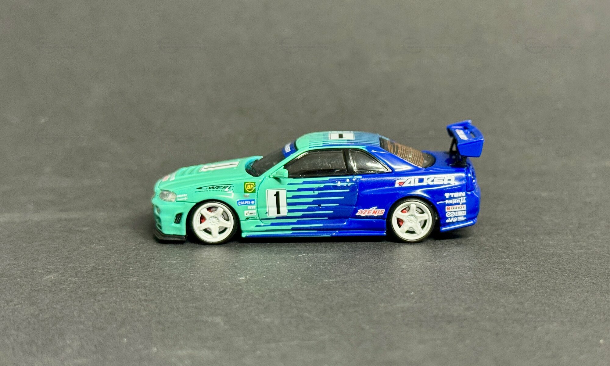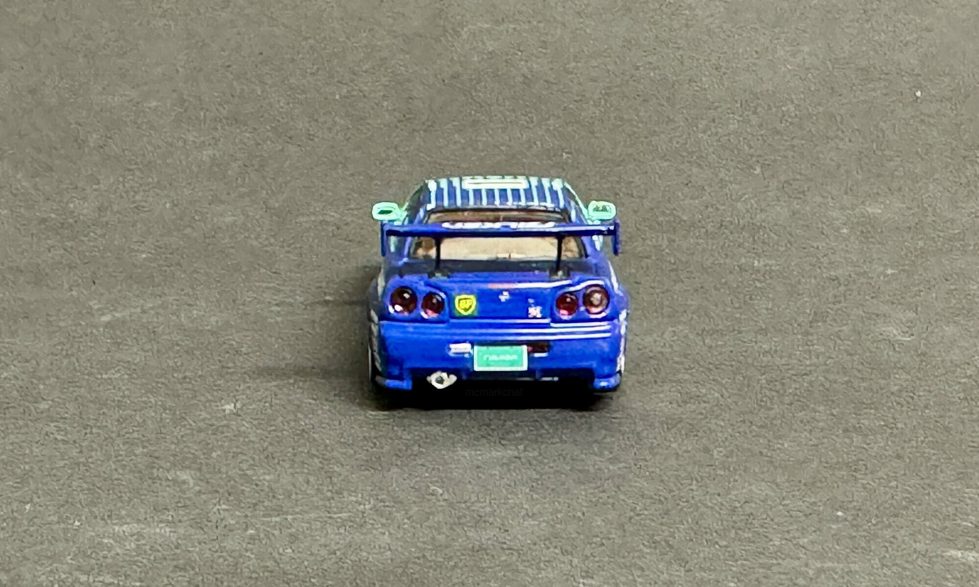 For collectors: it’s a 1/64 diecast model by Fast Speed, sturdy enough for handling but detailed enough for display. The edition is explicitly limited to 1 of 999 worldwide. The miniature shows details like separate side mirrors, a two‑tone rear wing with visible supports, contrasting door handles and slightly tinted glazing. The roof striping runs parallel to the car’s length, giving the top view some visual structure. The front with rectangular air intakes and extra fog lamps echoes the V‑spec bumper of the Nissan Skyline GT-R (R34), and the rear shows the typical four round lights and a center tow hook. Side sponsor decals—FALKEN, A'PEXi, C‑WEST and BP—are crisp and place the model in a tyre/tuner scene. If you collect race or tuner models in this scale, this one sits nicely next to other Skyline generations like the R33. The piece from “mcmarkchat” shows how diecast, accurate decals and clean paintwork can give a high recognition value for the Nissan Skyline GT-R (R34) even at 1/64—solid, detailed and great for a shelf.