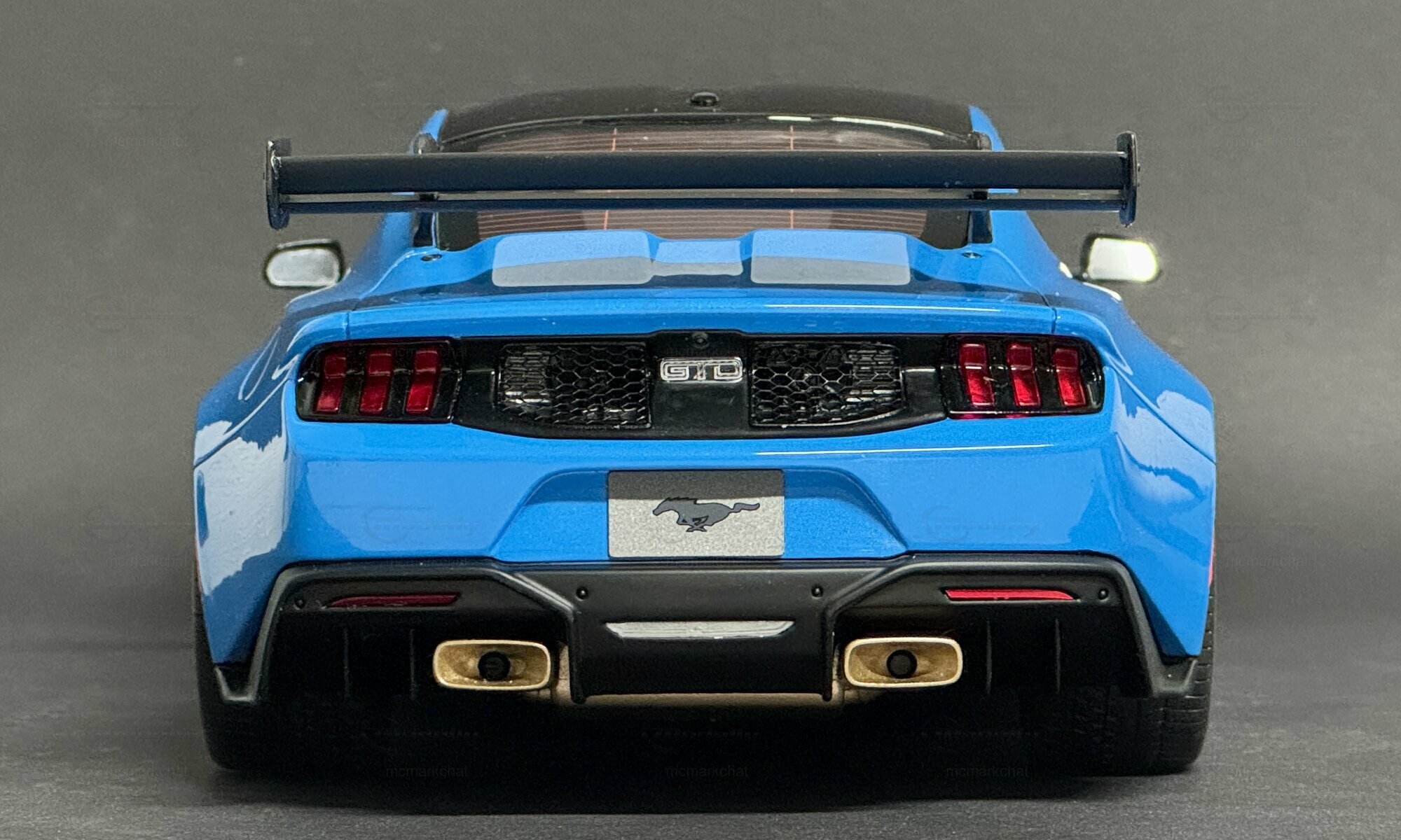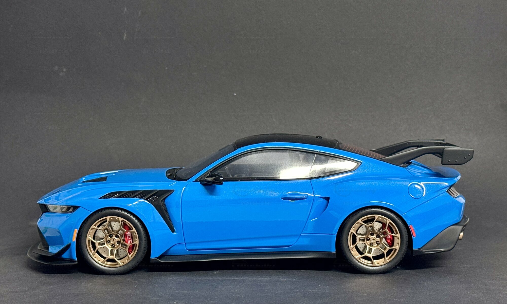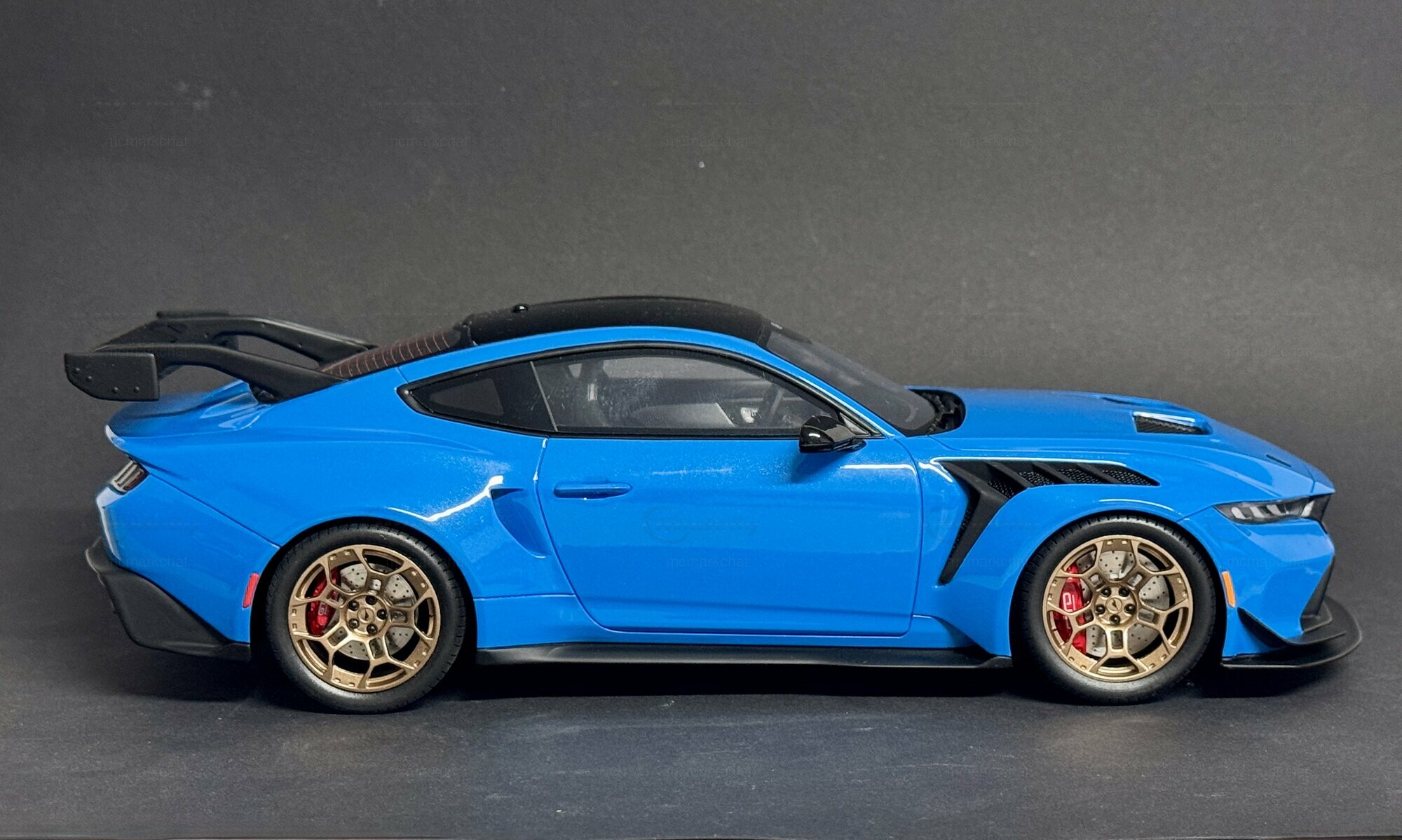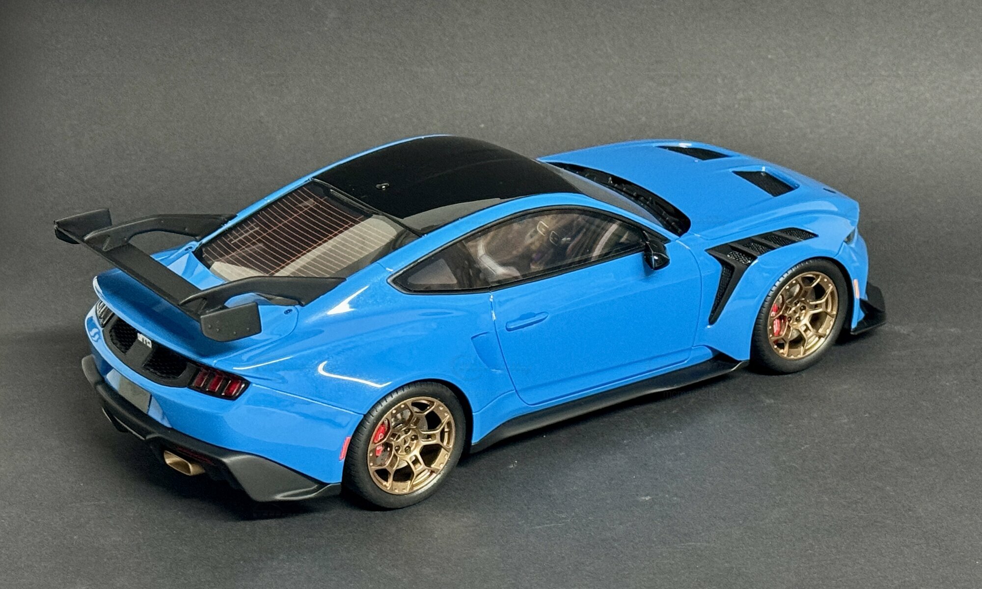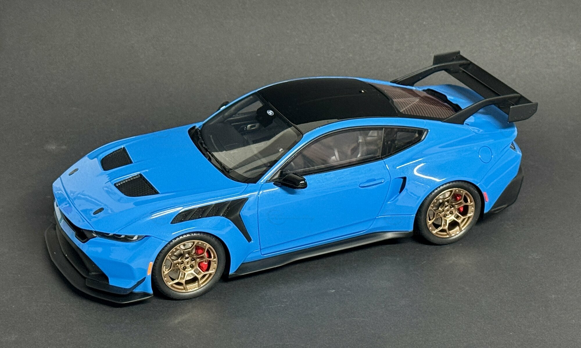 The showcased collector's item, owned by Modelly member “mcmarkchat,” is produced by GT Spirit in a 1/18 scale. This model is made from a mix of materials, predominantly polyresin, allowing for incredibly fine detail that mirrors the complexity and precision of the original. It’s limited to just 1200 pieces worldwide, making it a sought-after collector’s item.The blue paintwork has a striking shade, combined with a black roof and gold wheels from BBS, giving the model that sporty look of the original. Notable details include the large rear spoiler, carbon accents on the front and rear, and the intricately designed air intakes on the hood. Also worth mentioning are the red brake calipers visible behind the gold wheels, providing a sharp contrast to the paint job.