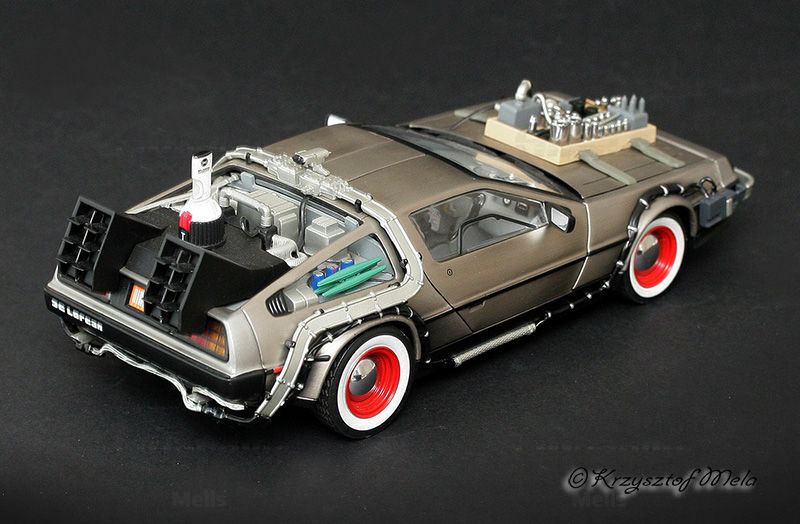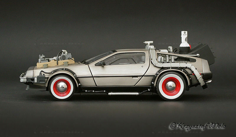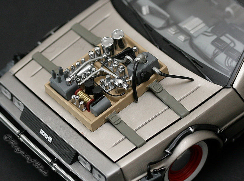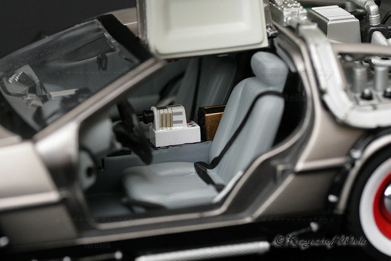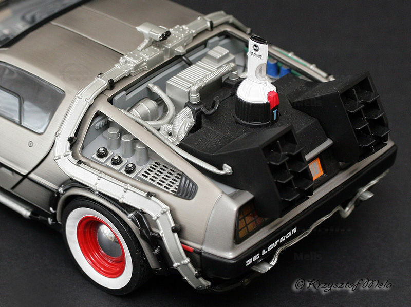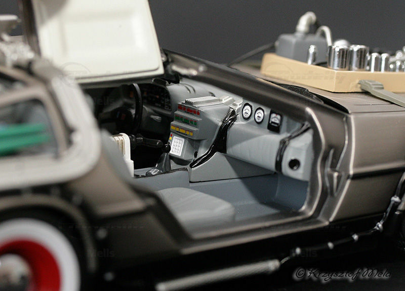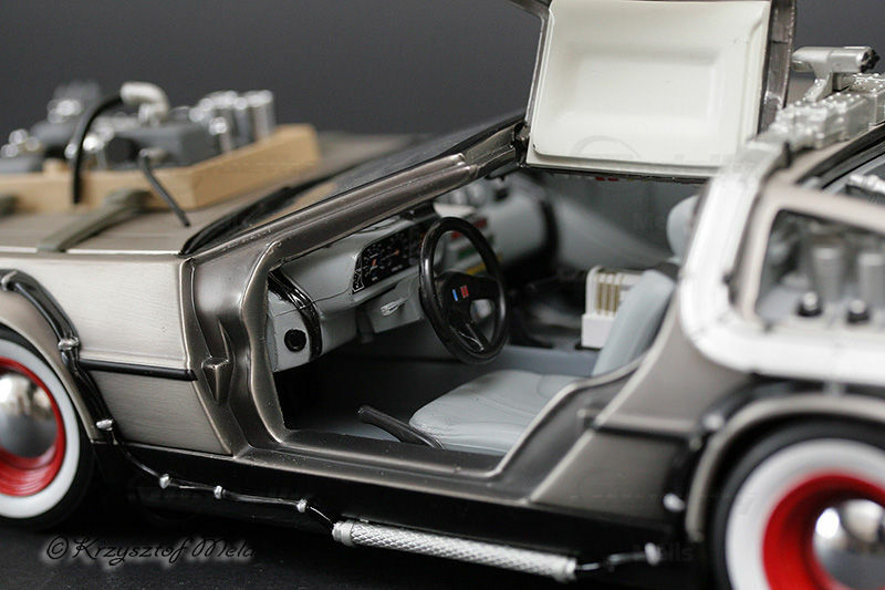 The miniature shown in the photos is a 1/18 scale model produced by Sun Star. This model car showcases the detailed features of the original, including the stainless steel look, gull-wing doors, and specific embellishments that made the DeLorean DMC-12 unmistakable. The wheels of the model car are painted in red and white, perfectly complementing the overall aesthetics of the vehicle. The Sun Star model is made of various materials, contributing to achieving a high level of detail accuracy and authenticity. The wiring on the body and the technical details, such as the Flux Capacitor on the roof, are faithfully reproduced, making this model a coveted collector's item for model car enthusiasts.