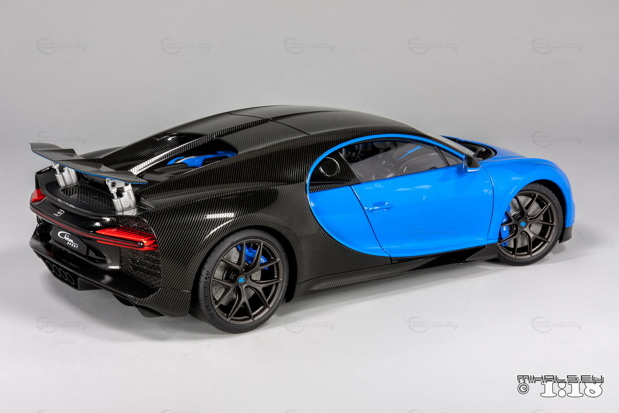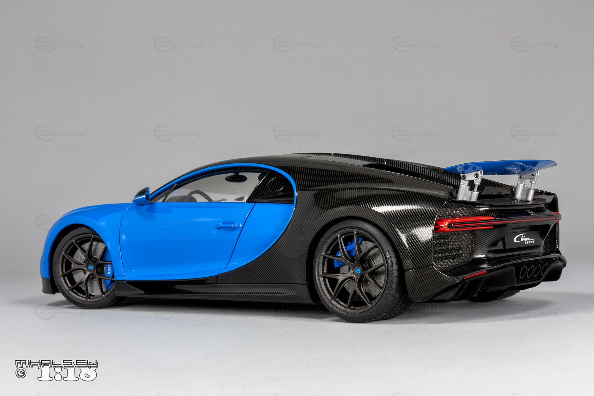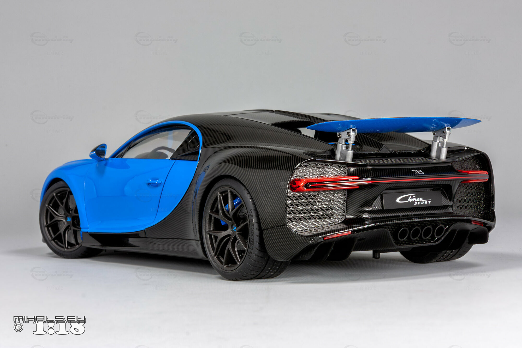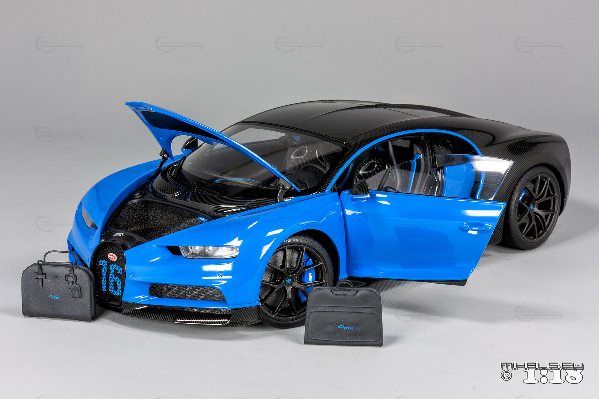 This 1/18 miniature from AUTOart faithfully captures the essence of the Bugatti Chiron Sport. The model, part of the collection by user "mihals," is crafted from high-quality materials, including composite material. What’s really cool about this miniature is how it accurately portrays all the intricate details that define the car’s curves and unique design elements. The two-tone paint job features a stunning blue finish combined with a black carbon fiber look, perfectly reflecting the dynamic and elegant appearance of the real Chiron Sport.
