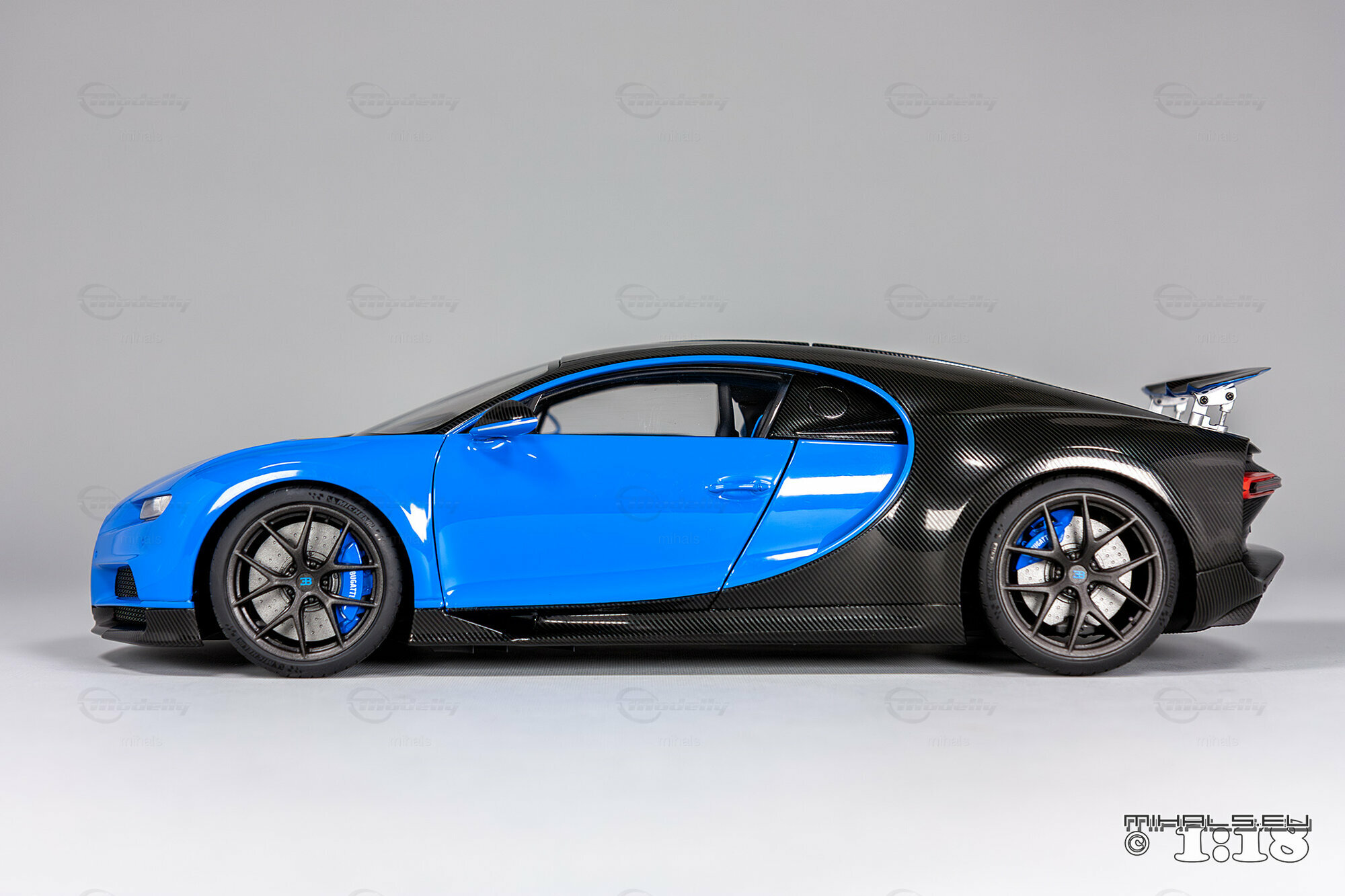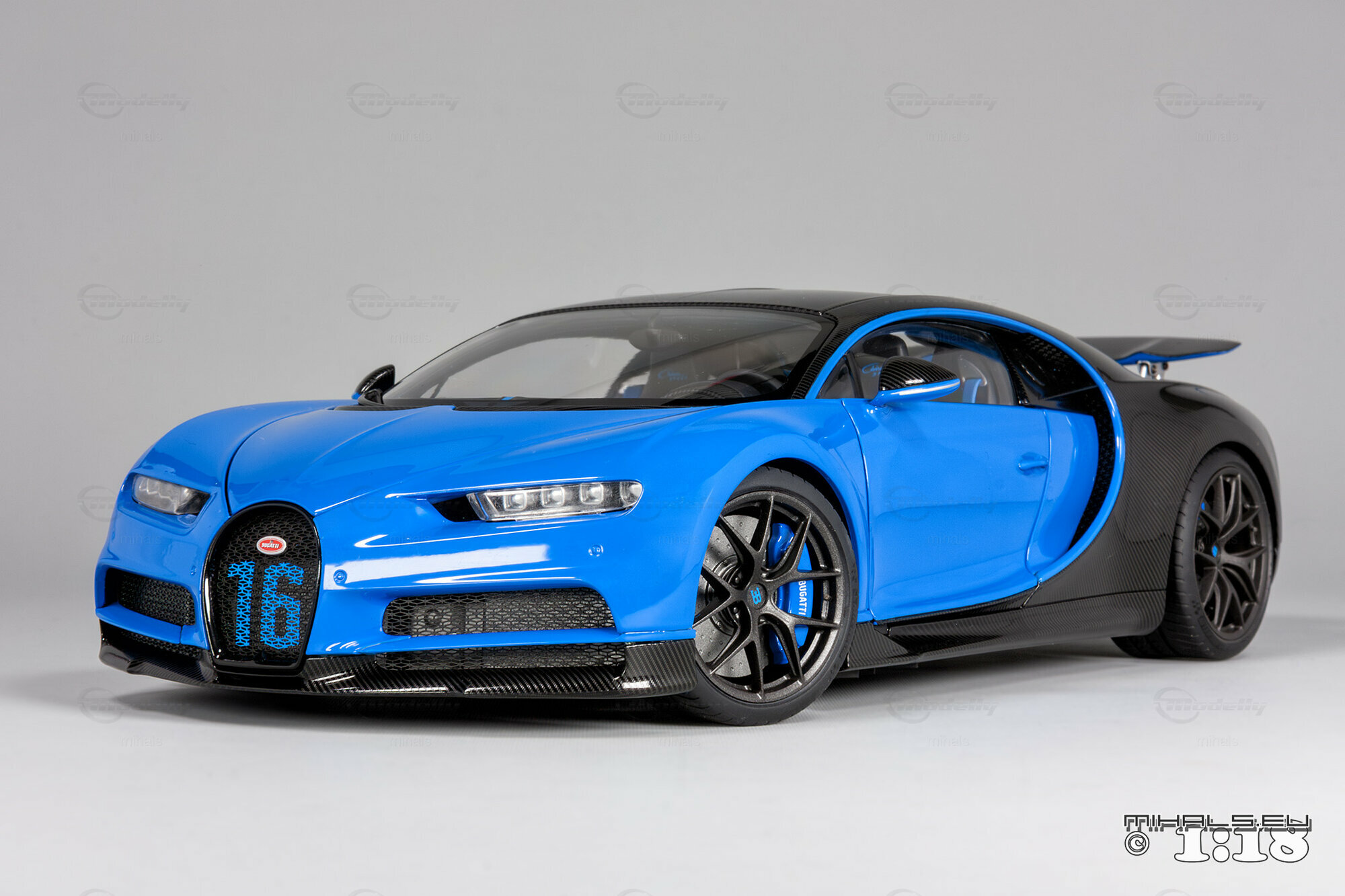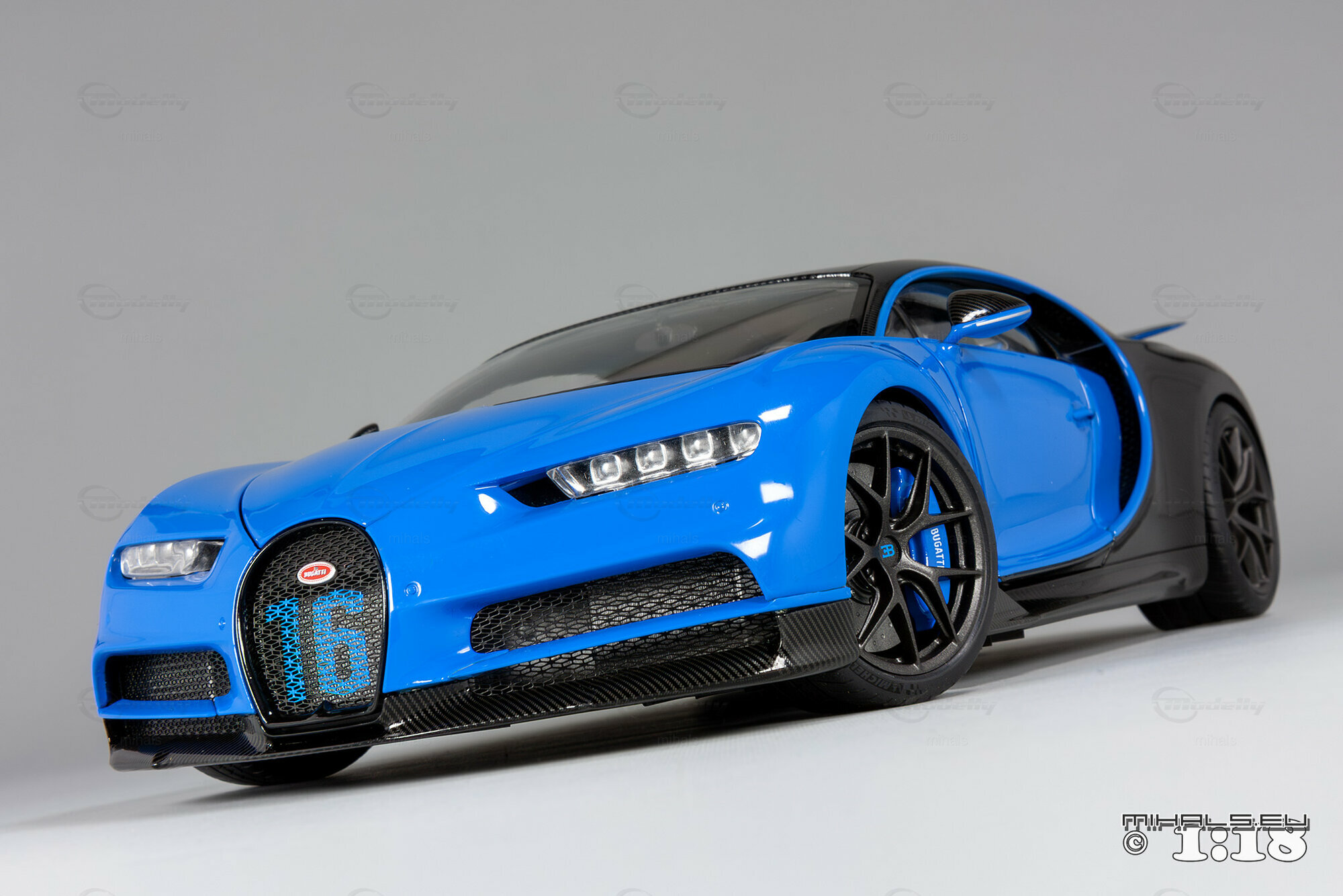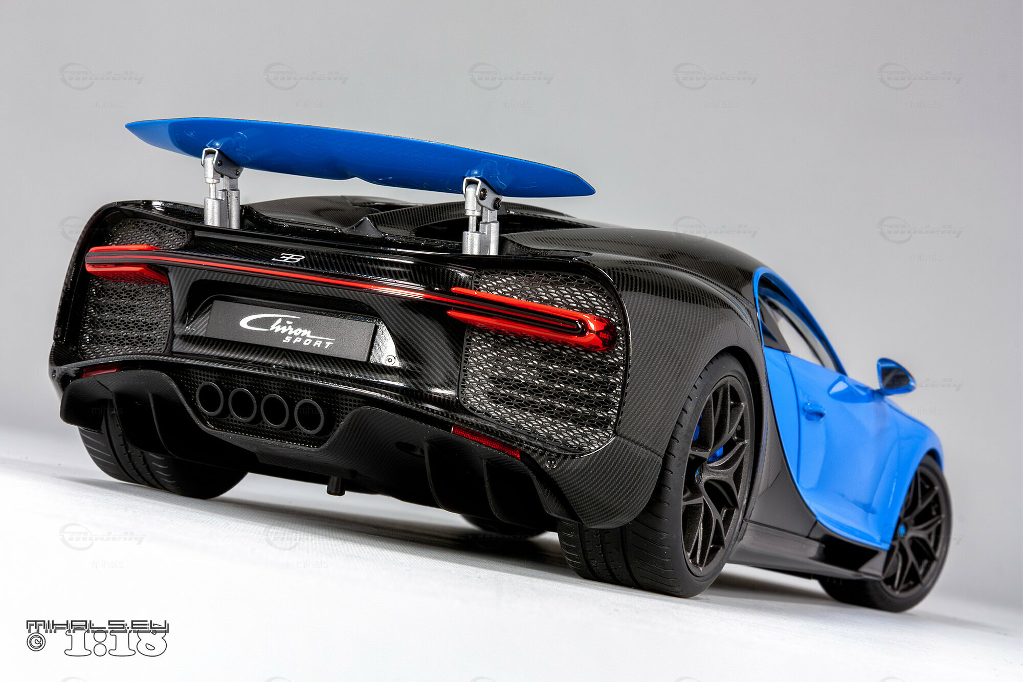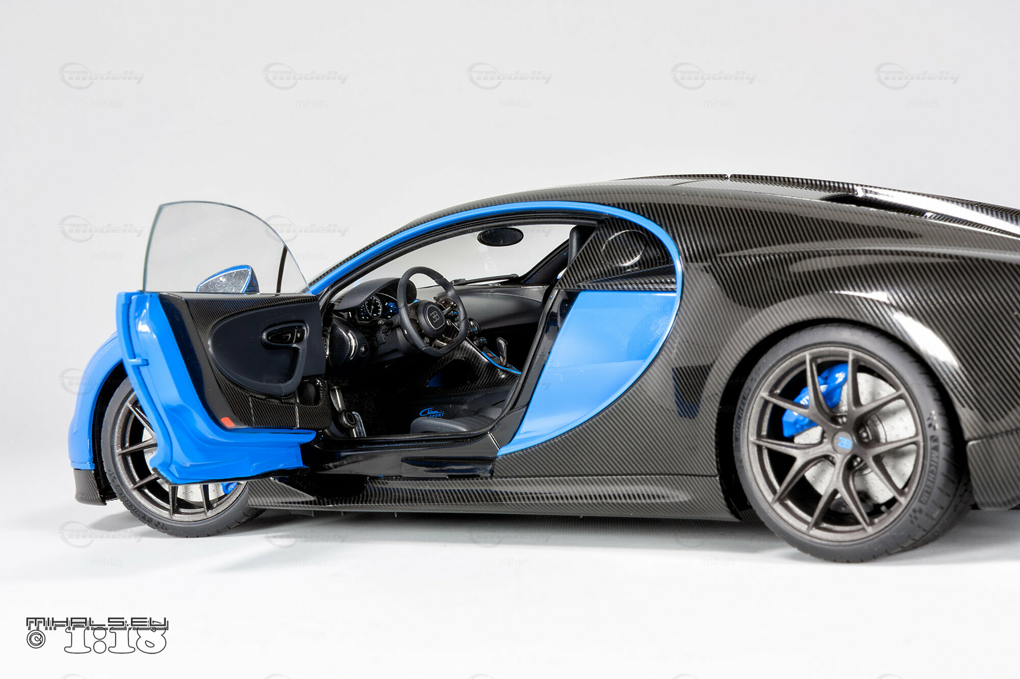 This 1/18 miniature from AUTOart faithfully captures the essence of the Bugatti Chiron Sport. The model, part of the collection by user "mihals," is crafted from high-quality materials, including composite material. What’s really cool about this miniature is how it accurately portrays all the intricate details that define the car’s curves and unique design elements. The two-tone paint job features a stunning blue finish combined with a black carbon fiber look, perfectly reflecting the dynamic and elegant appearance of the real Chiron Sport.