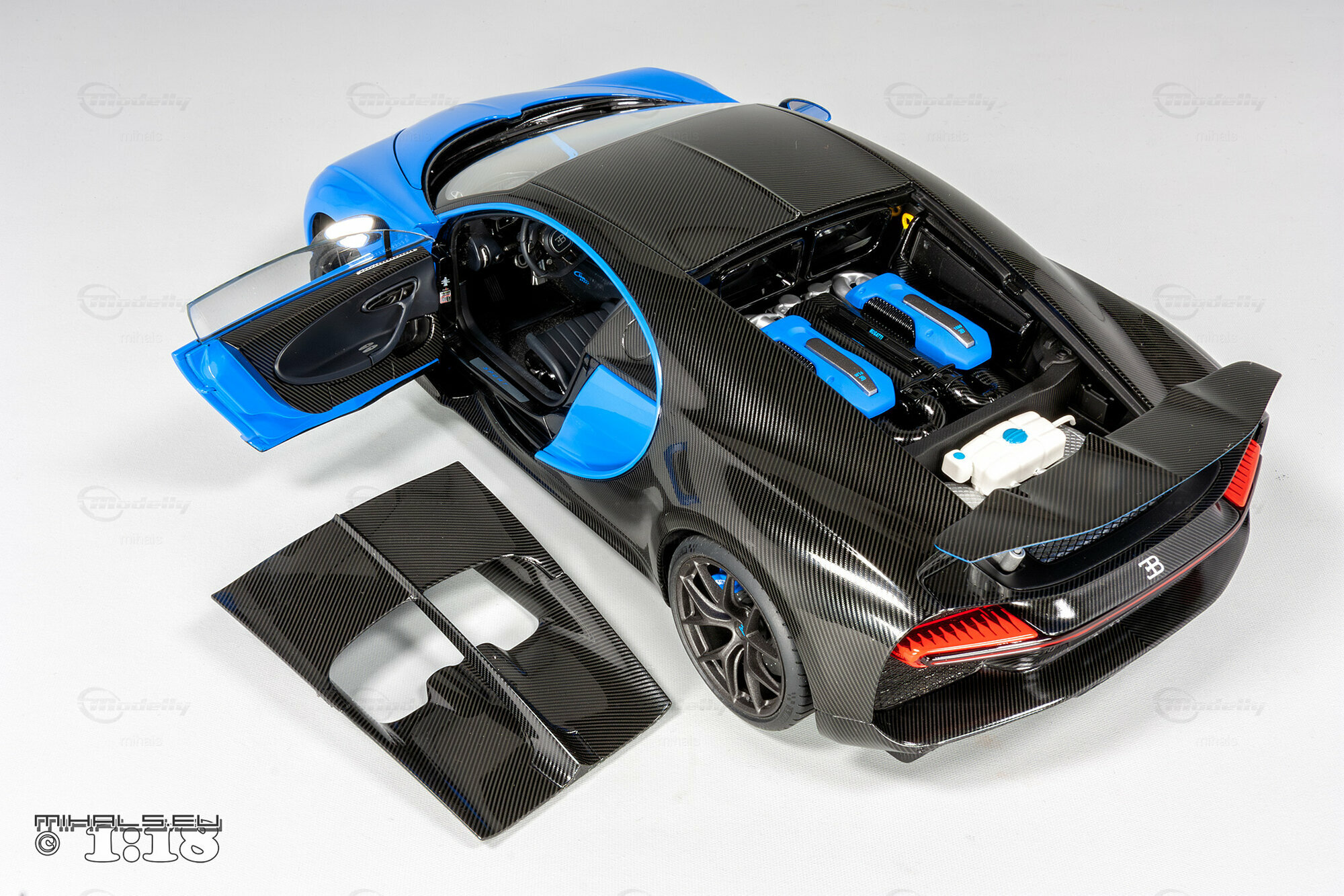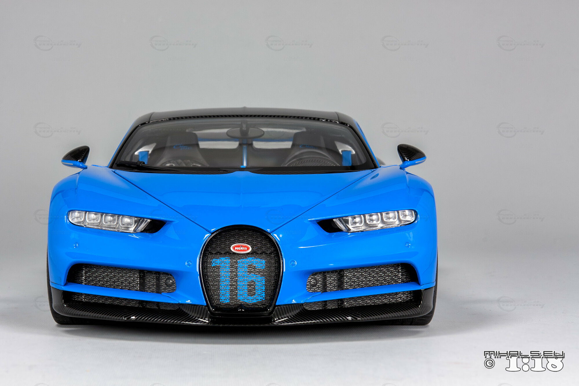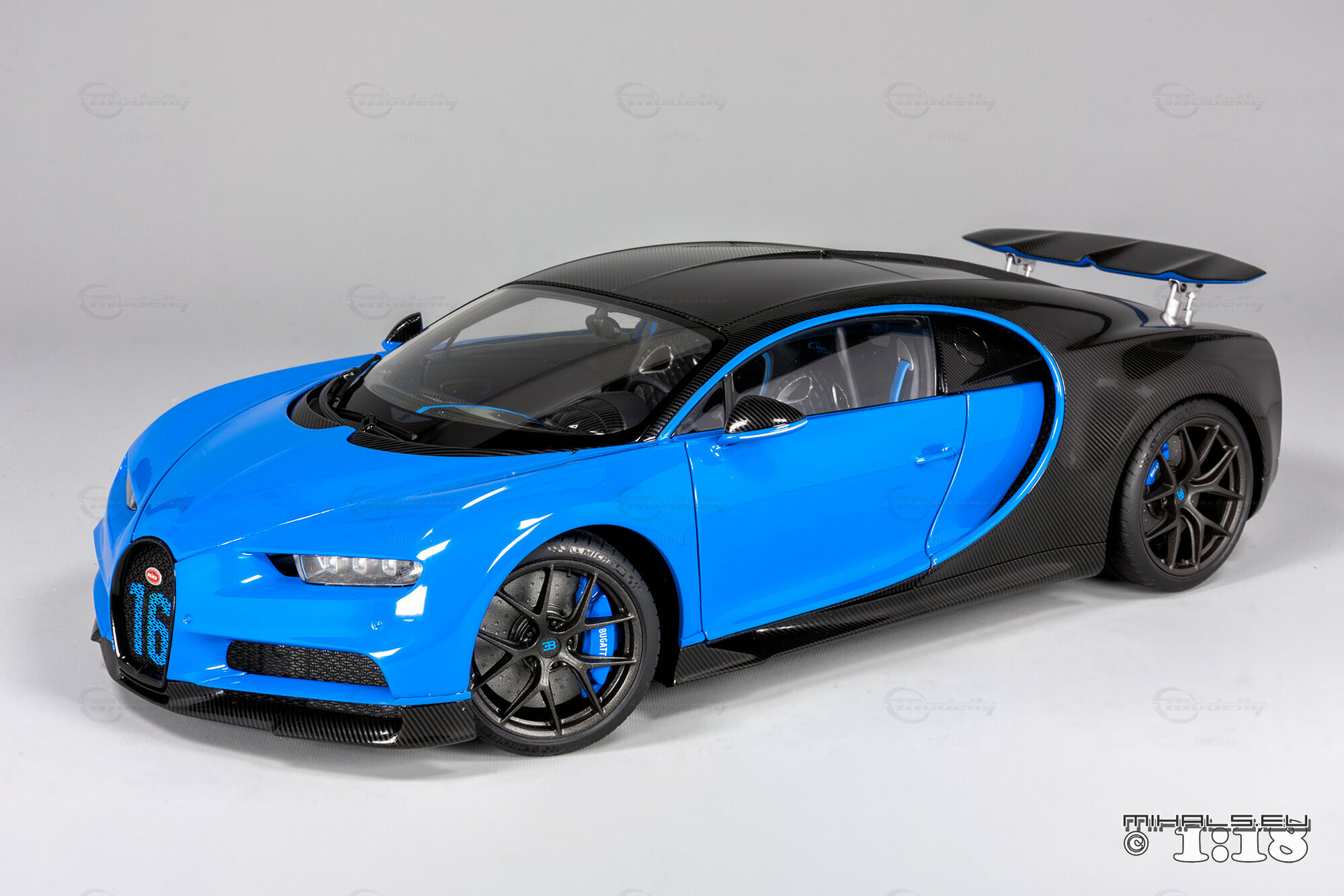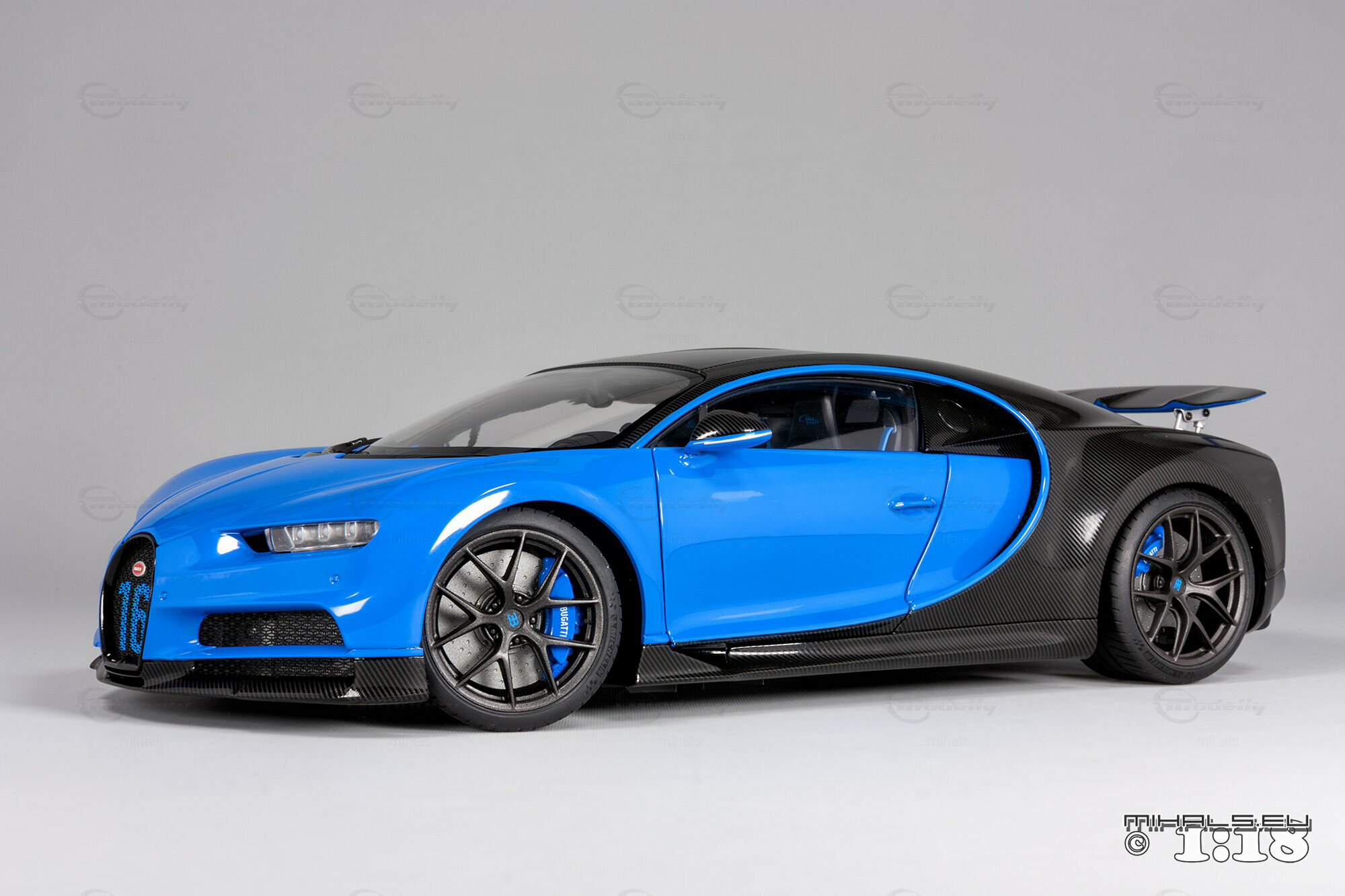 This 1/18 miniature from AUTOart faithfully captures the essence of the Bugatti Chiron Sport. The model, part of the collection by user "mihals," is crafted from high-quality materials, including composite material. What’s really cool about this miniature is how it accurately portrays all the intricate details that define the car’s curves and unique design elements. The two-tone paint job features a stunning blue finish combined with a black carbon fiber look, perfectly reflecting the dynamic and elegant appearance of the real Chiron Sport.