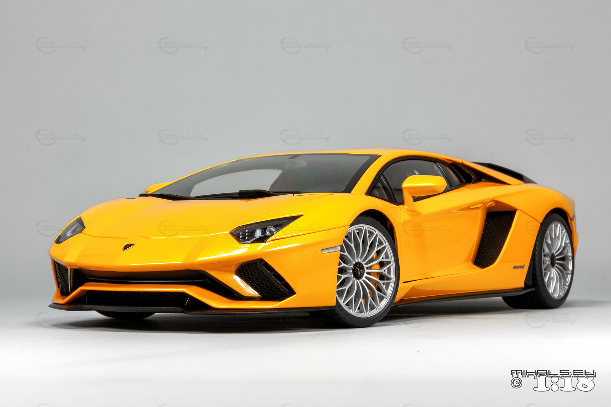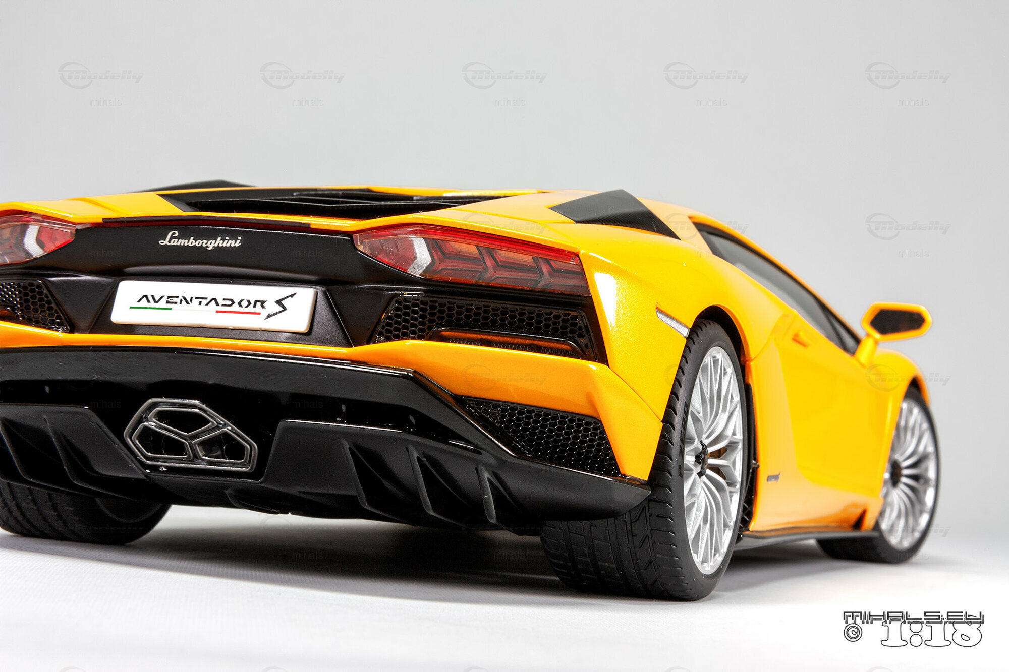 For model car collectors, the 1/18 scale miniature of the Lamborghini Aventador S by AUTOart is a special highlight. Made of high-quality plastic, this model impresses with a detailed representation of the original. AUTOart is known for its precise detailing and high-quality craftsmanship, which is evident in this miniature: from the accurate reproduction of the headlights to the finely crafted air intakes, everything is perfectly executed. The bright orange metallic paint finish gives the model a striking presence. The number "8465000F0" is lightly printed on the right side.