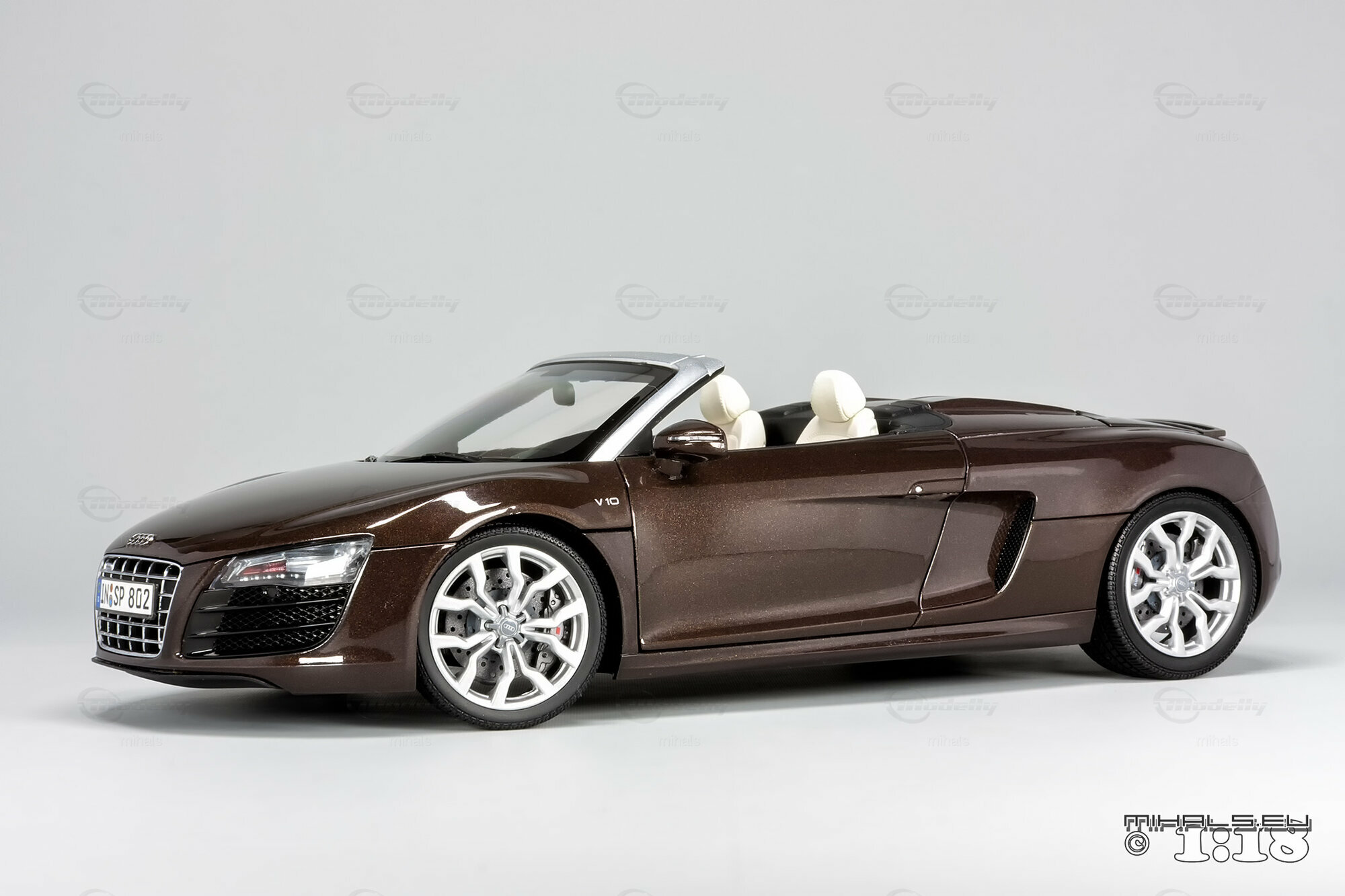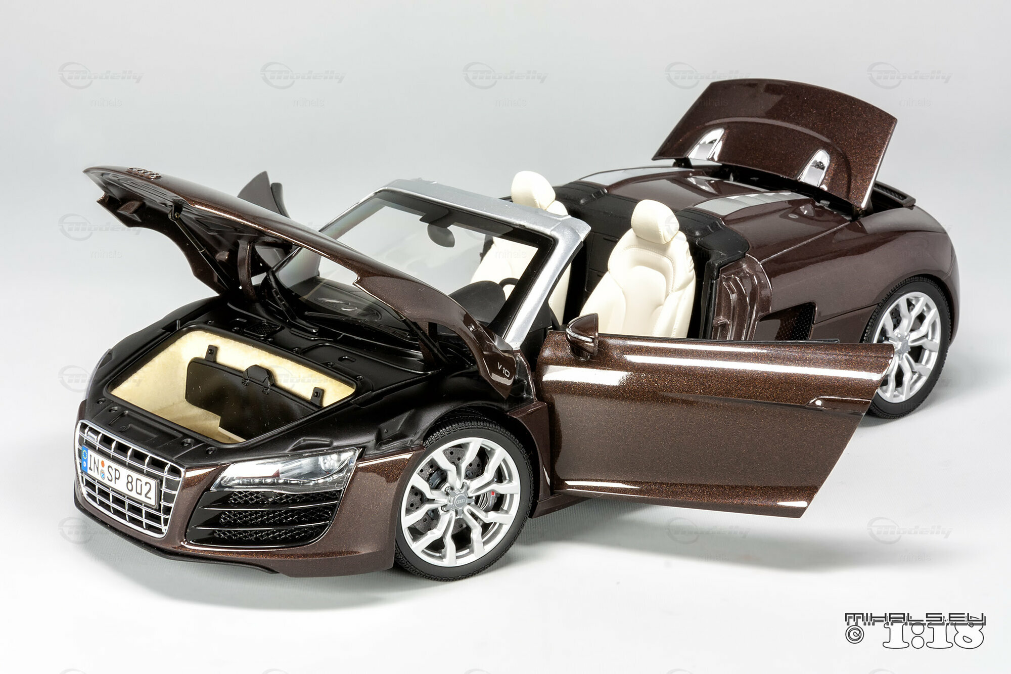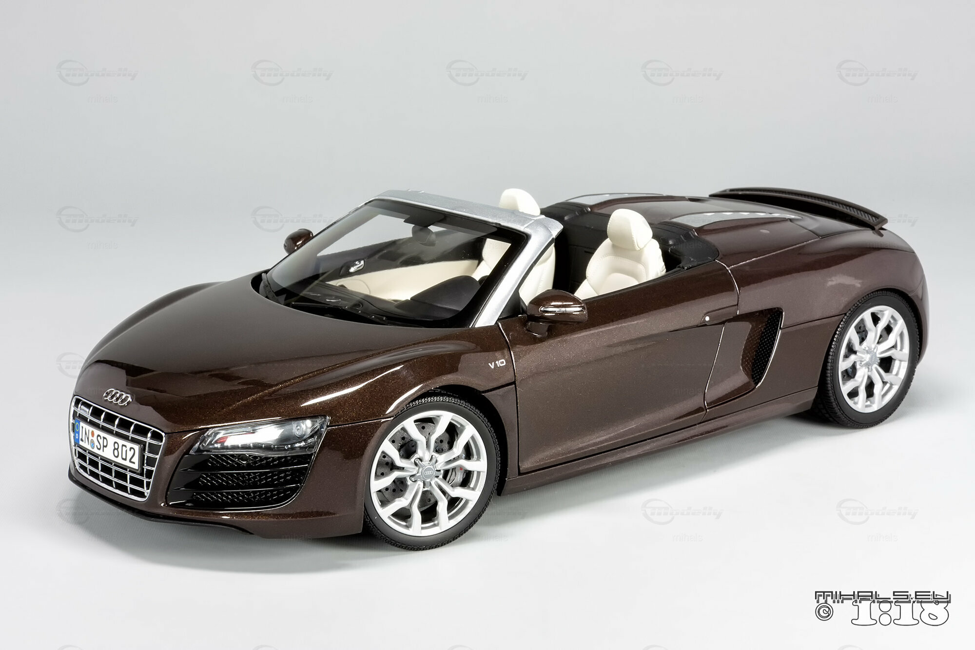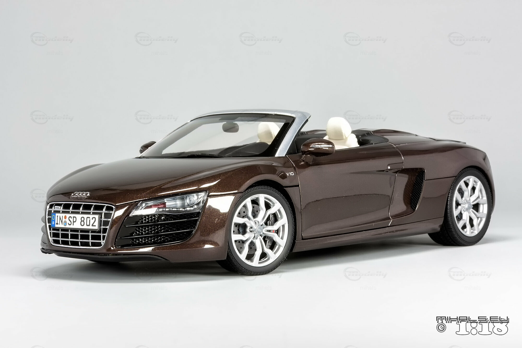 The 1/18 scale model car shown here is a faithfully recreated miniature model of the Audi R8 V10 Spyder, crafted by Kyosho Audi Collection, known for its qualitative and detailed replicas. This model is entirely made of diecast material and mirrors the distinctive design elements of the original. From the metallic paint in a special brown hue to the accurately replicated wheels - every detail has been meticulously reproduced. The detailed headlights simulating a realistic LED effect, and the accurately reproduced brake discs and calipers demonstrate the high quality of the model car. For further enhancement, the model can also feature red brake calipers. Even the interior impresses with finely detailed sport seats, dashboard, and steering wheel in the appropriate color. This model is undoubtedly a highlight for any model car collector.