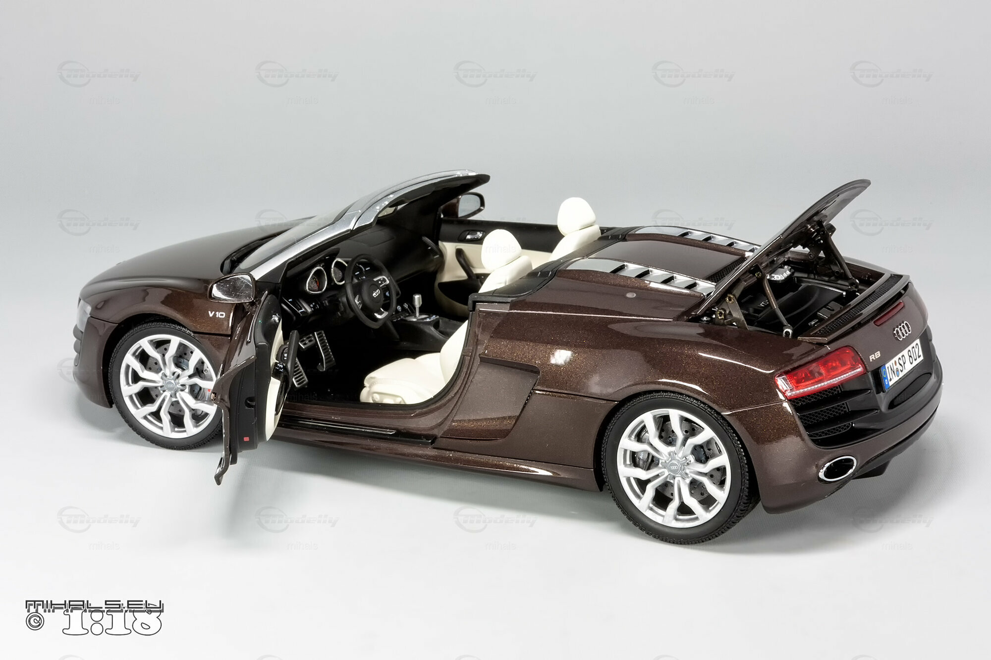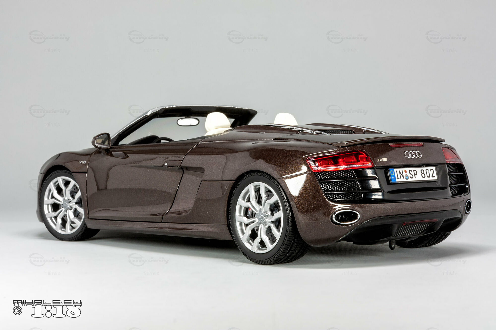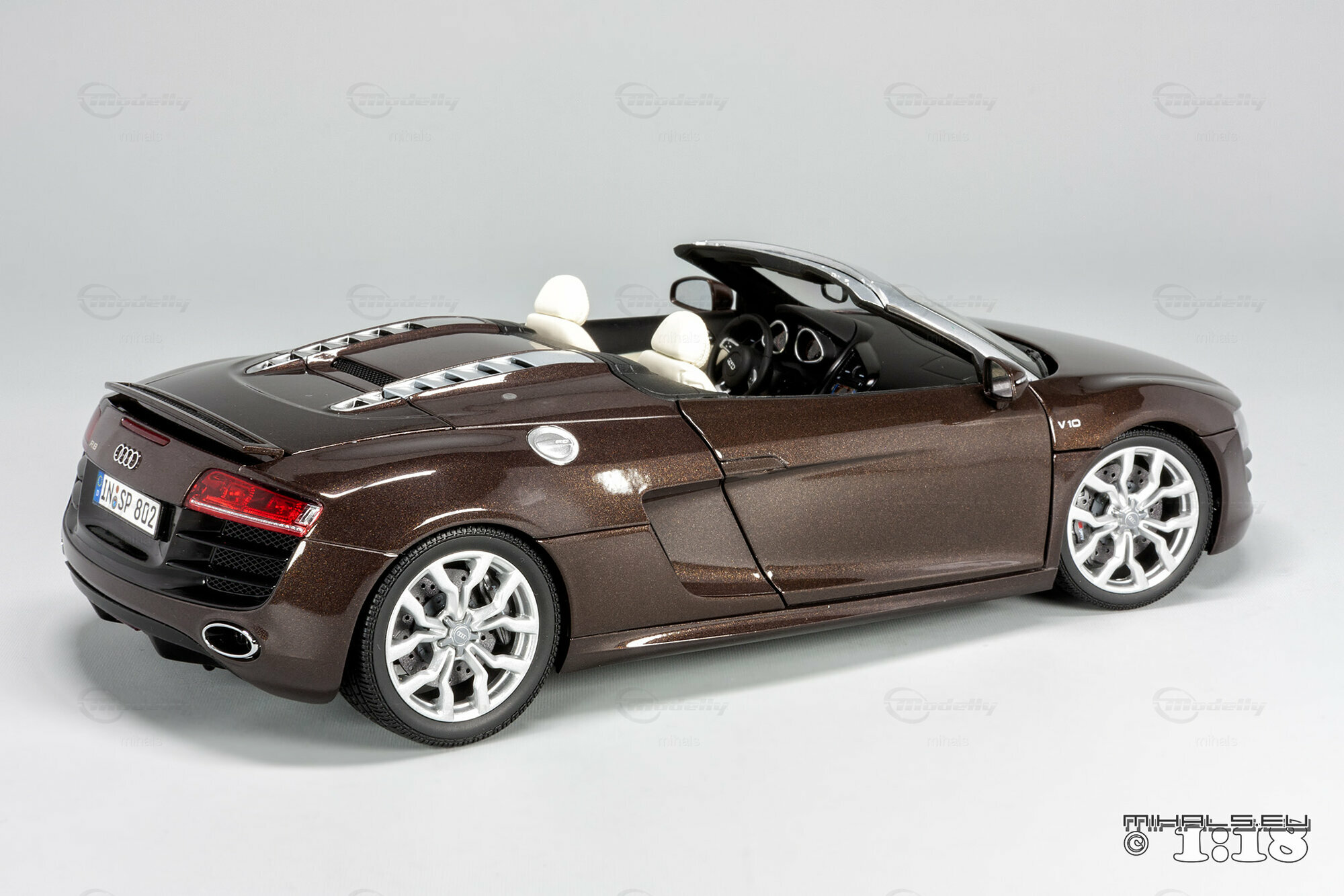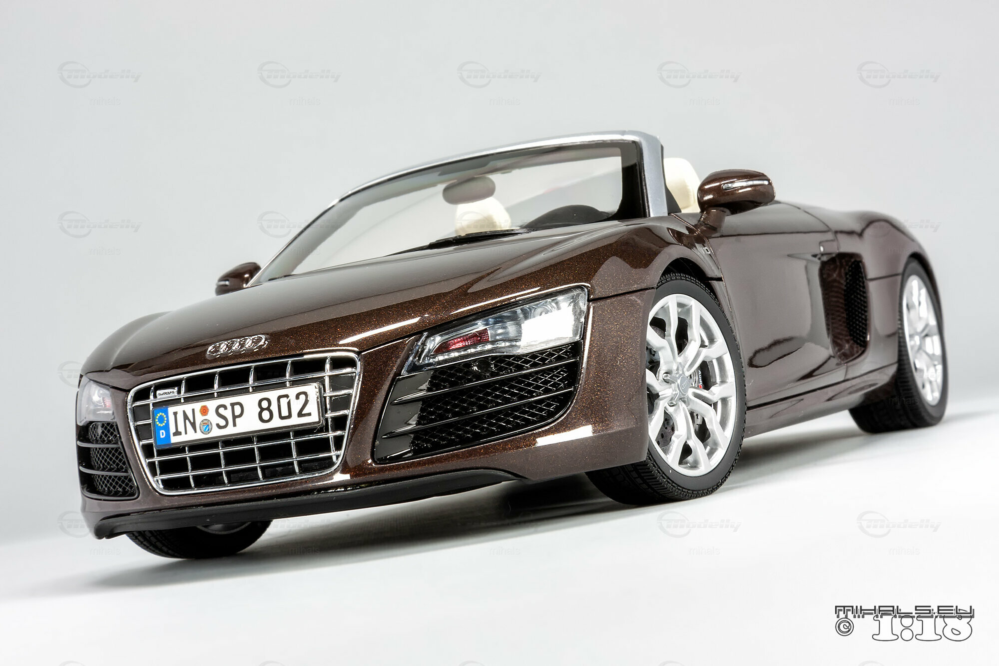 The 1/18 scale model car shown here is a faithfully recreated miniature model of the Audi R8 V10 Spyder, crafted by Kyosho Audi Collection, known for its qualitative and detailed replicas. This model is entirely made of diecast material and mirrors the distinctive design elements of the original. From the metallic paint in a special brown hue to the accurately replicated wheels - every detail has been meticulously reproduced. The detailed headlights simulating a realistic LED effect, and the accurately reproduced brake discs and calipers demonstrate the high quality of the model car. For further enhancement, the model can also feature red brake calipers. Even the interior impresses with finely detailed sport seats, dashboard, and steering wheel in the appropriate color. This model is undoubtedly a highlight for any model car collector.