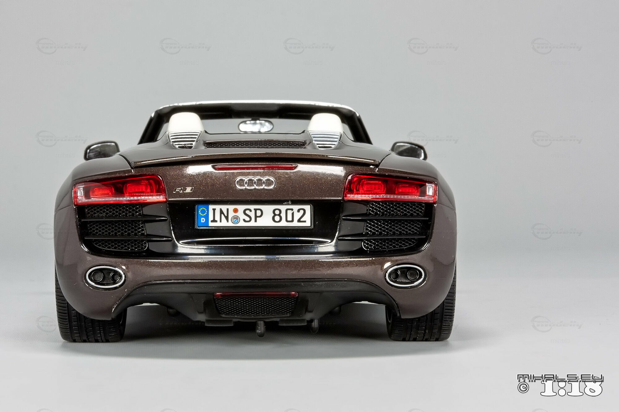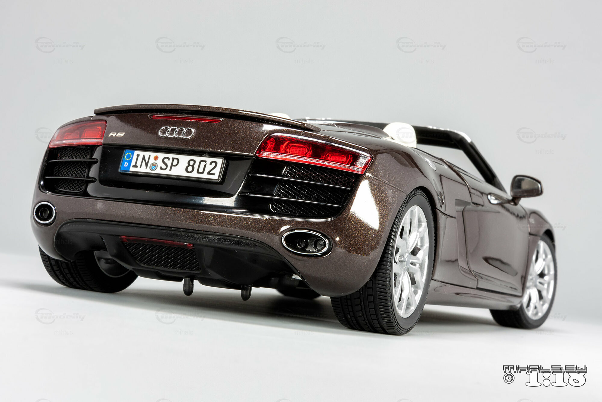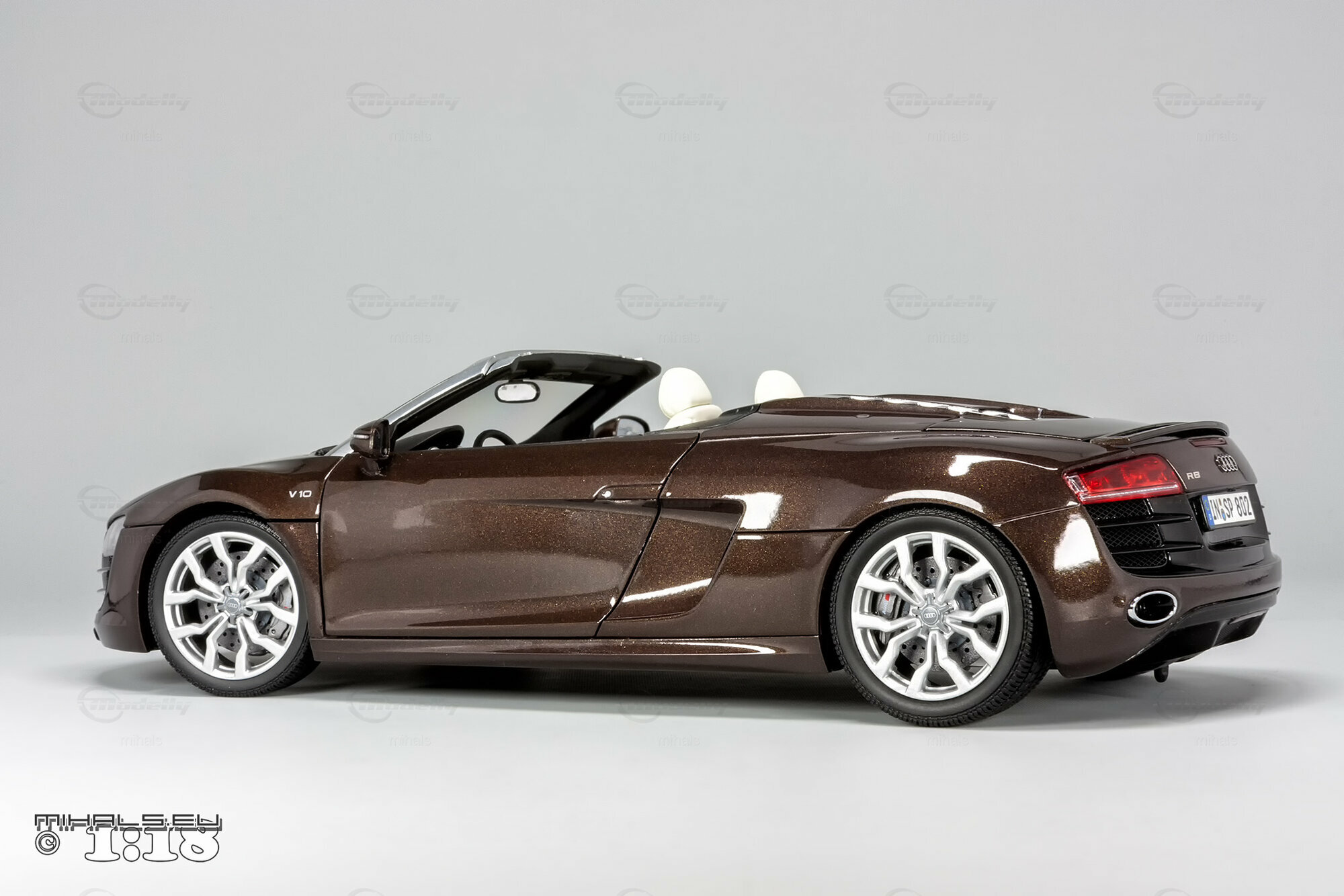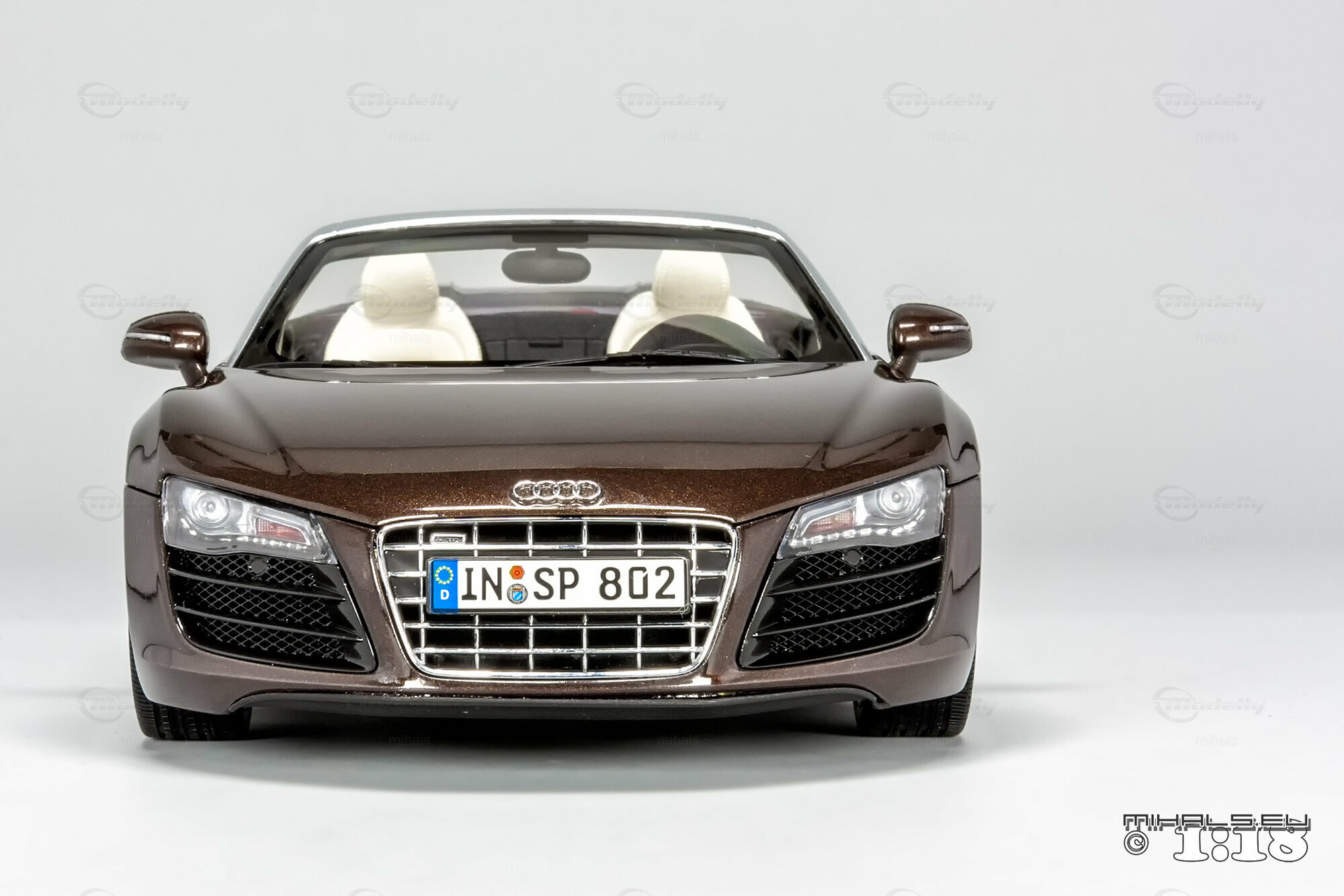 The 1/18 scale model car shown here is a faithfully recreated miniature model of the Audi R8 V10 Spyder, crafted by Kyosho Audi Collection, known for its qualitative and detailed replicas. This model is entirely made of diecast material and mirrors the distinctive design elements of the original. From the metallic paint in a special brown hue to the accurately replicated wheels - every detail has been meticulously reproduced. The detailed headlights simulating a realistic LED effect, and the accurately reproduced brake discs and calipers demonstrate the high quality of the model car. For further enhancement, the model can also feature red brake calipers. Even the interior impresses with finely detailed sport seats, dashboard, and steering wheel in the appropriate color. This model is undoubtedly a highlight for any model car collector.