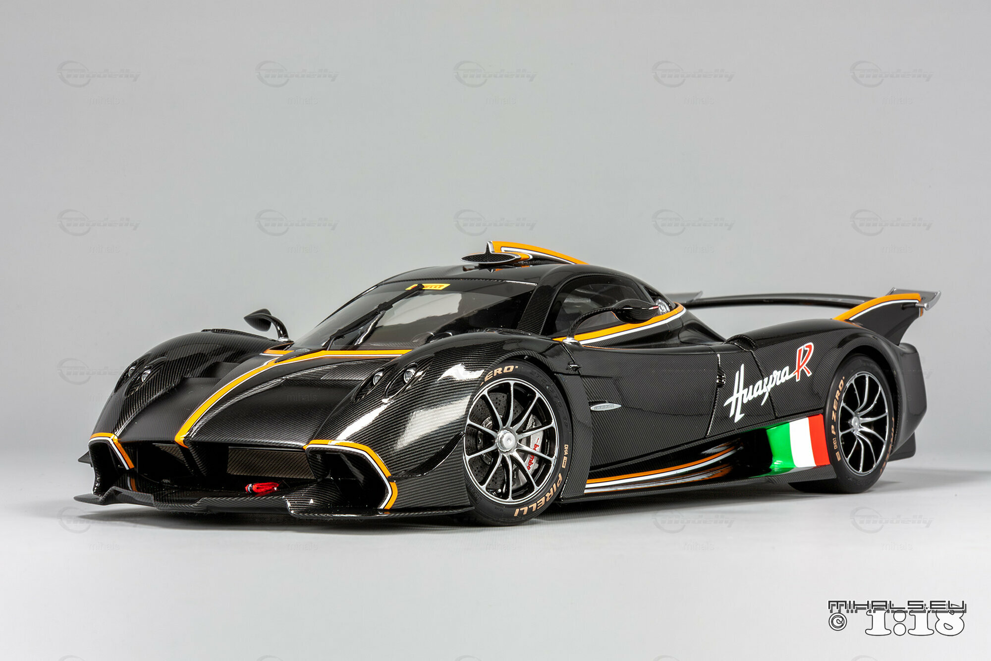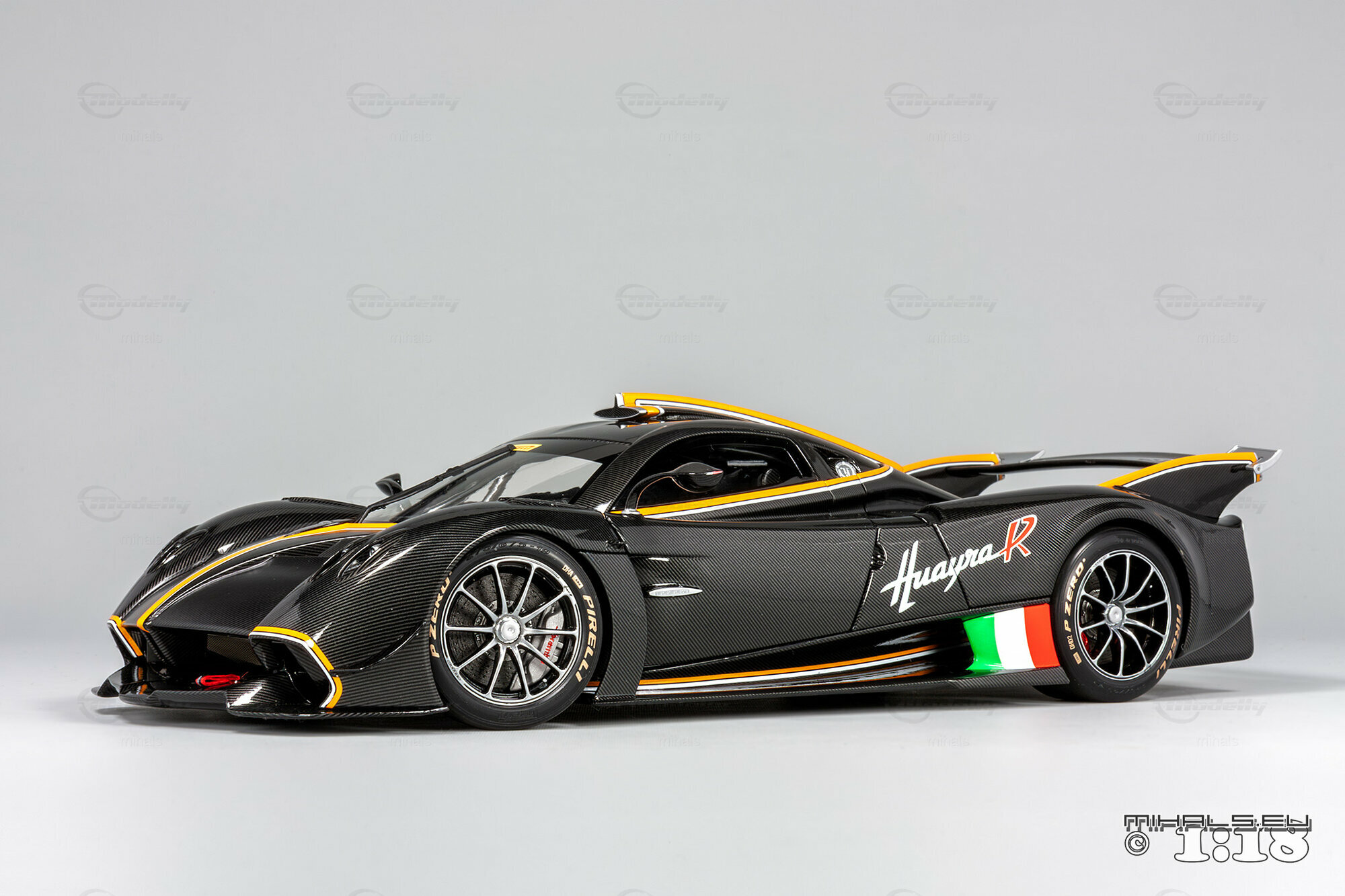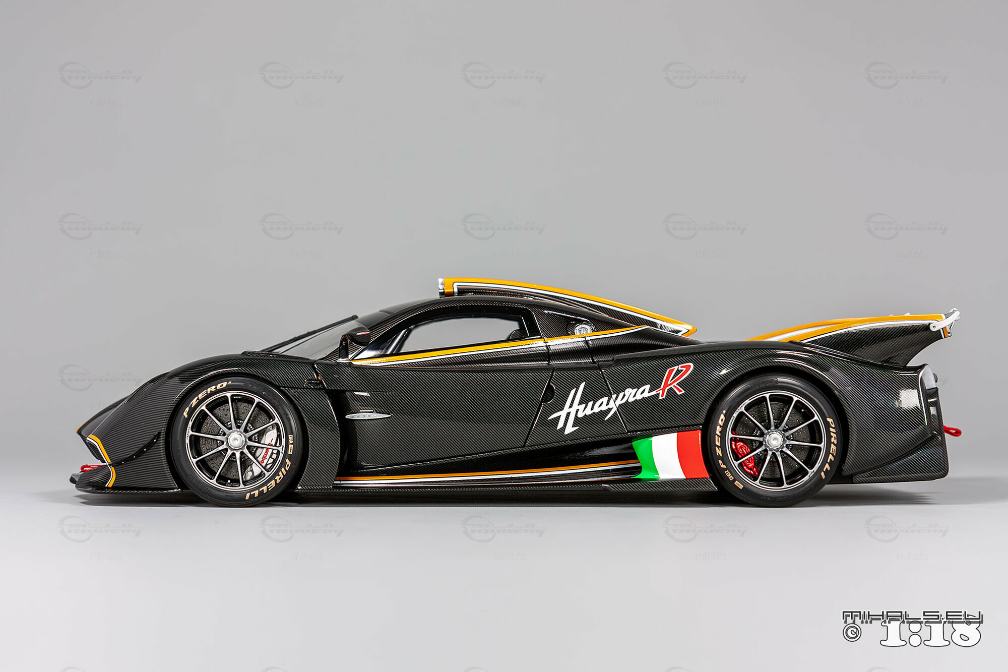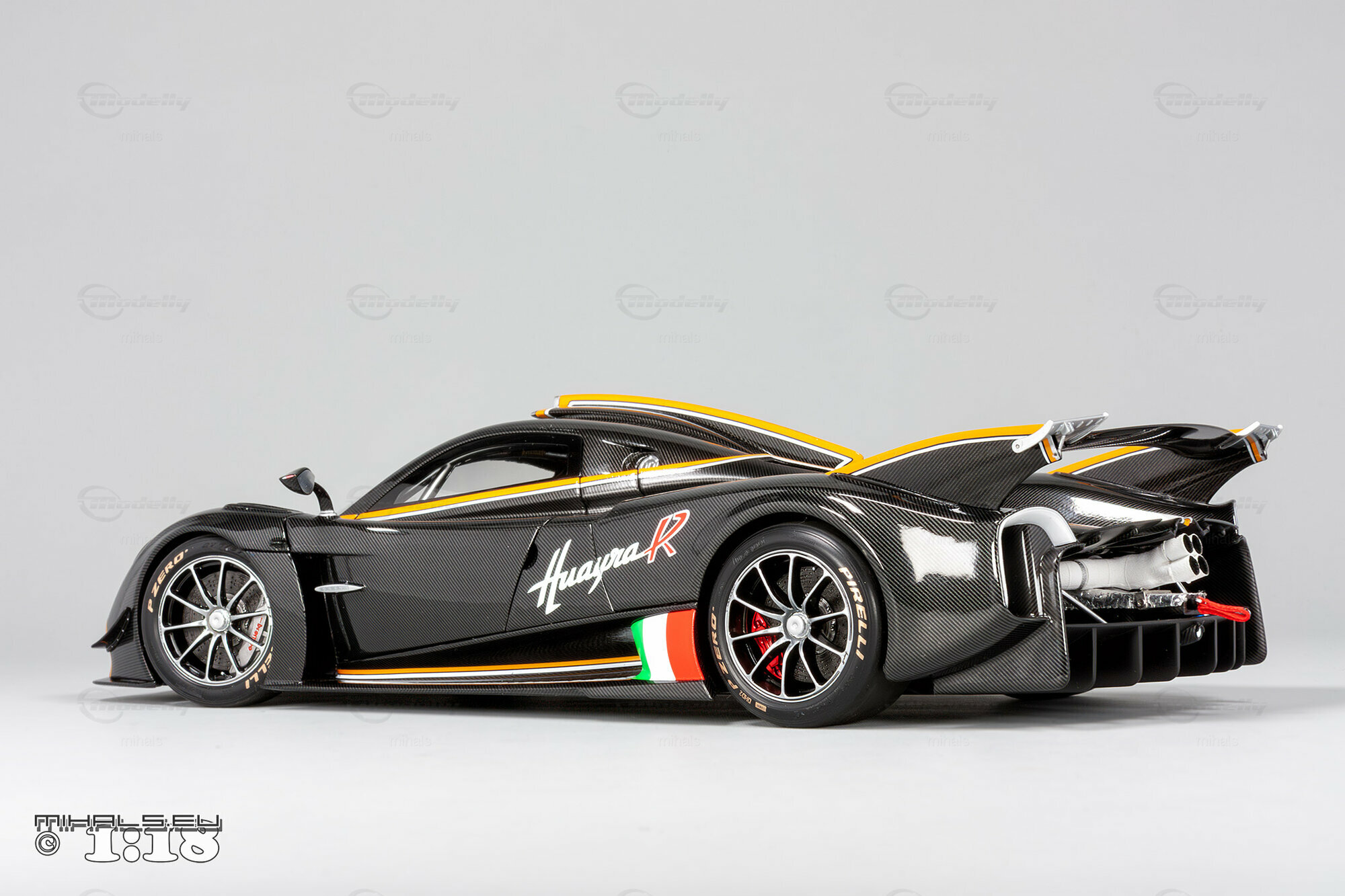 Visually the model sticks to the exposed-carbon look of the Pagani Huayra R: visible carbon fiber in a dark base tone with yellow pinstripes that run down the center and into the front intakes. White “Huayra R” lettering on the doors and the Italian tricolore badge behind the front wheels underline the origin. The stripes continue around the window edges and over the roof bulge; the front and rear contours are emphasized with fine yellow trims. The model photos from “mihals” also show the deep-cut front with big channels that, on the real car, guide brake and cooling airflow. The rear end with fixed wing, endplates and diffuser faithfully reproduces the downforce architecture. Decals are kept minimal — mainly Pirelli on the tires — which fits the track-focused theme. Overall the miniature captures the Huayra R’s proportions — long, low nose, compact greenhouse, wide rear — and the LCD Models 1/18 execution is a solid, detail-oriented addition to any hypercar or track-toy display.