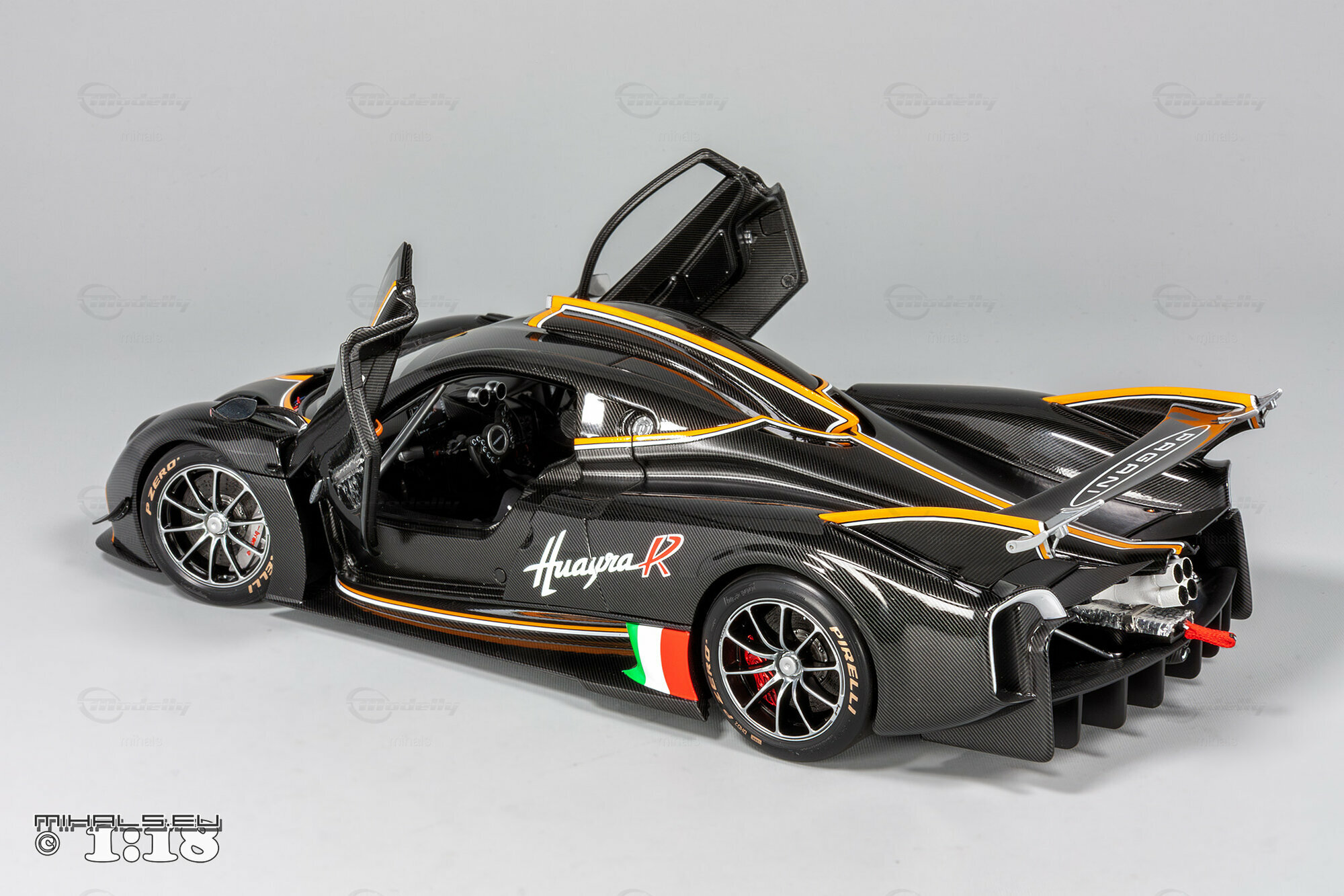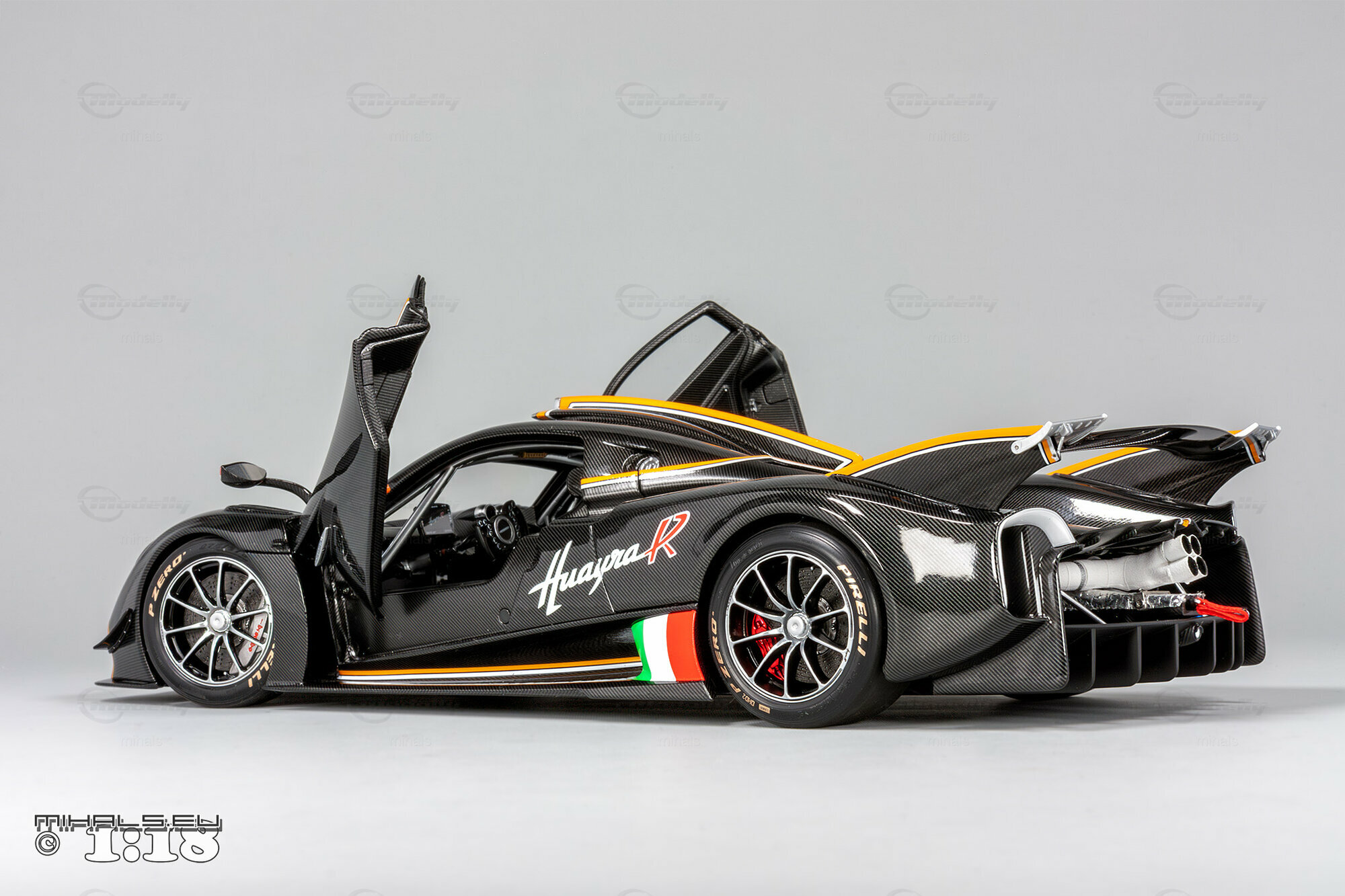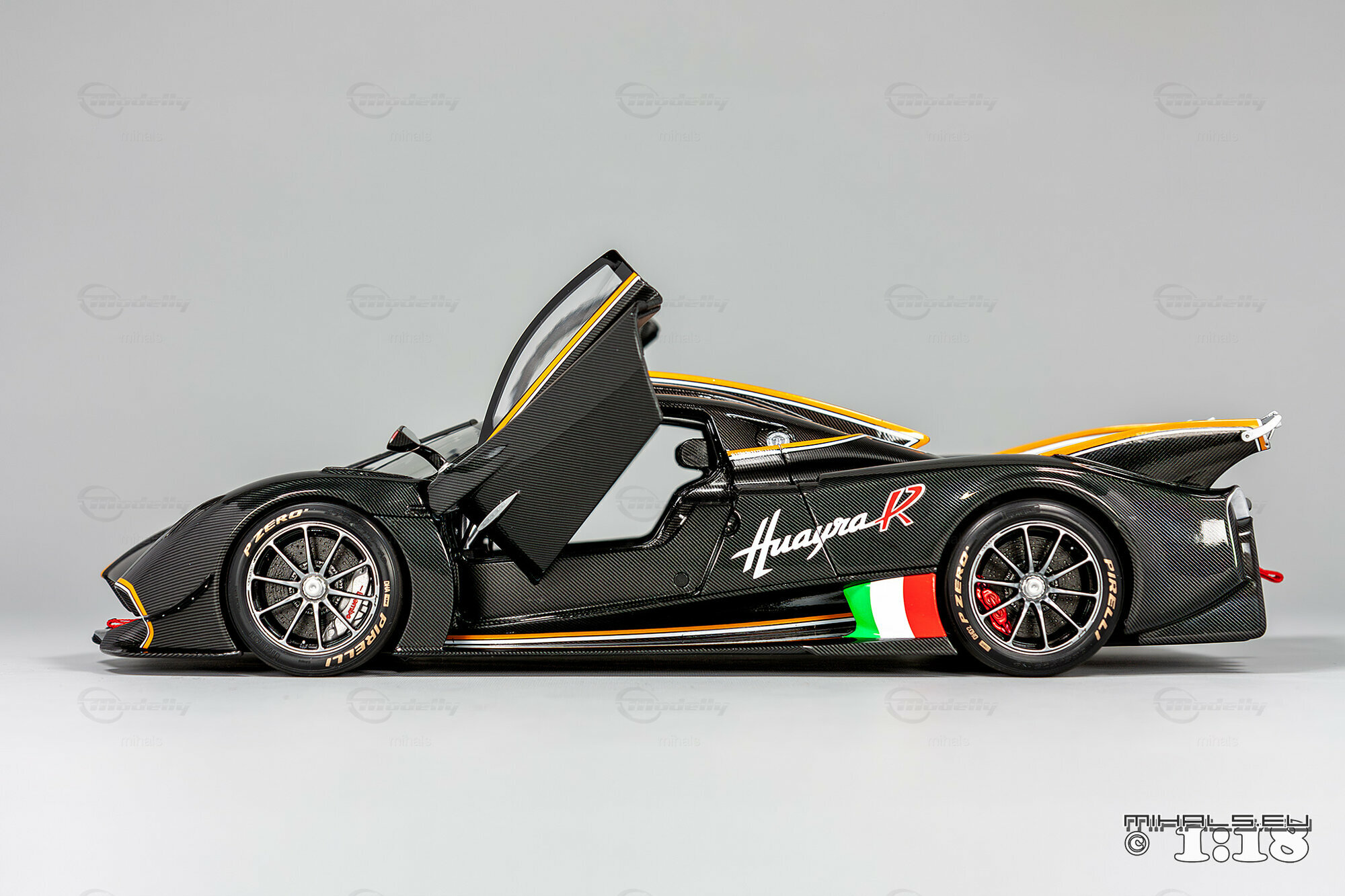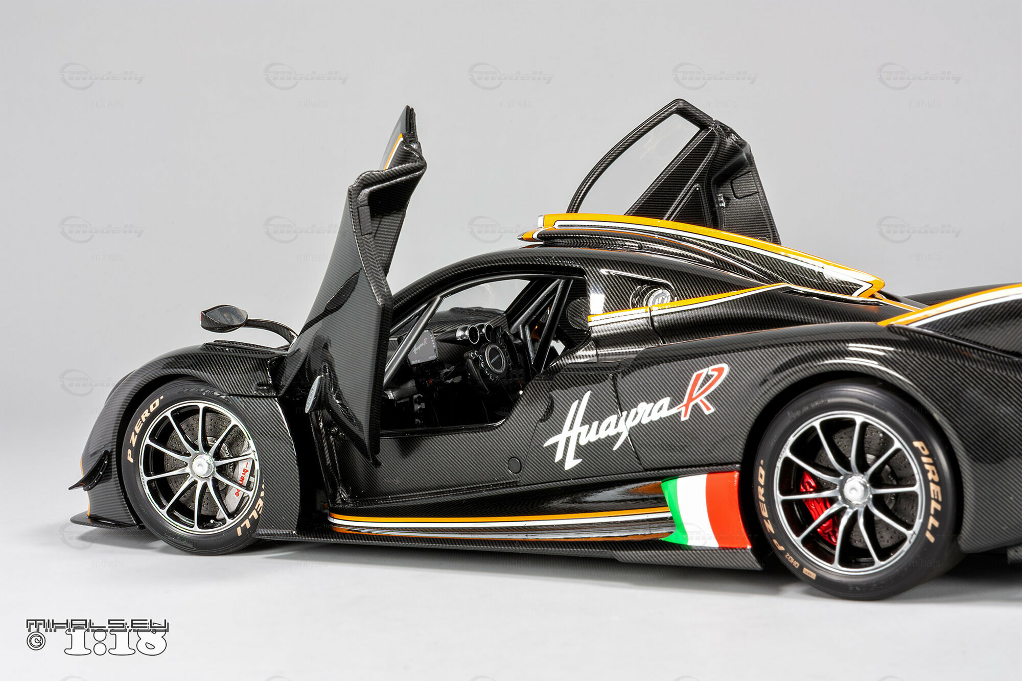The pictured miniature is a 1/18 scale model from LCD Models and is diecast. In the photos you can see nicely executed panel gaps and functional gullwing-style doors that mimic the Huayra R’s opening motion. The visible carbon weave is reproduced across the body, including directional fiber patterns on the fenders, doors and rear wing. The wheels match the multi-spoke central-lock design with a reproduced center nut, and behind them you can spot the brake discs and calipers. The tires carry readable P‑Zero lettering from Pirelli, matching the original supplier; a red front tow point is also detailed. The big rear wing, front splitter and side aero elements show the variety of shapes from the real car. With a door open you can peek into the interior: suggestive racing buckets, harness detail, a wheel with functional-looking areas and a textured center console convey the car’s track focus. For collectors this version is noteworthy: being diecast it’s sturdy, yet detailed enough to convincingly capture the original’s lines.