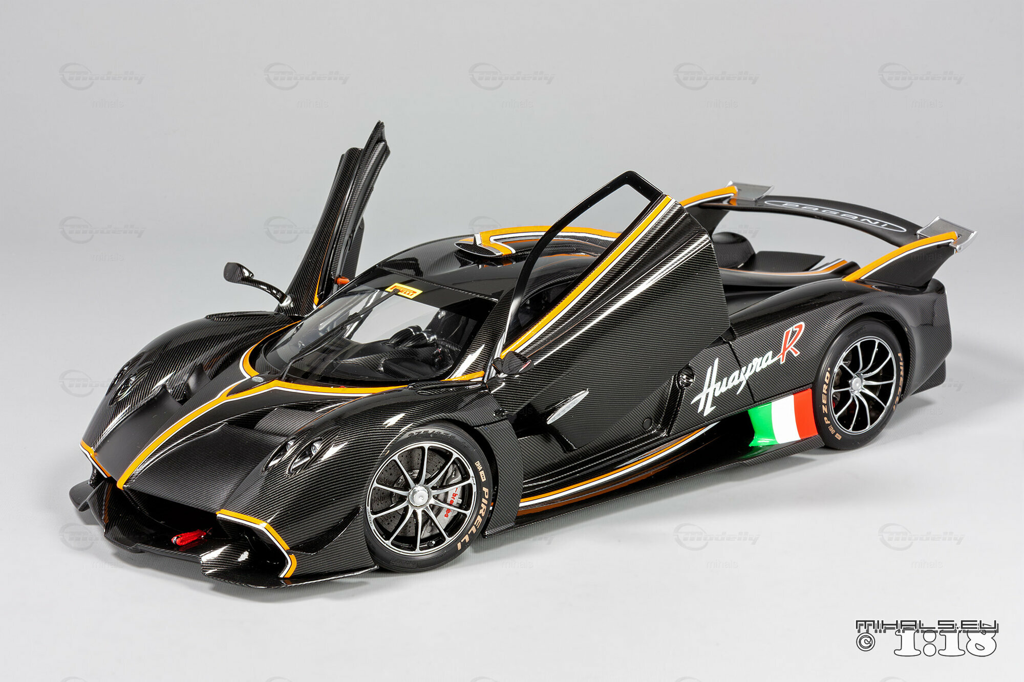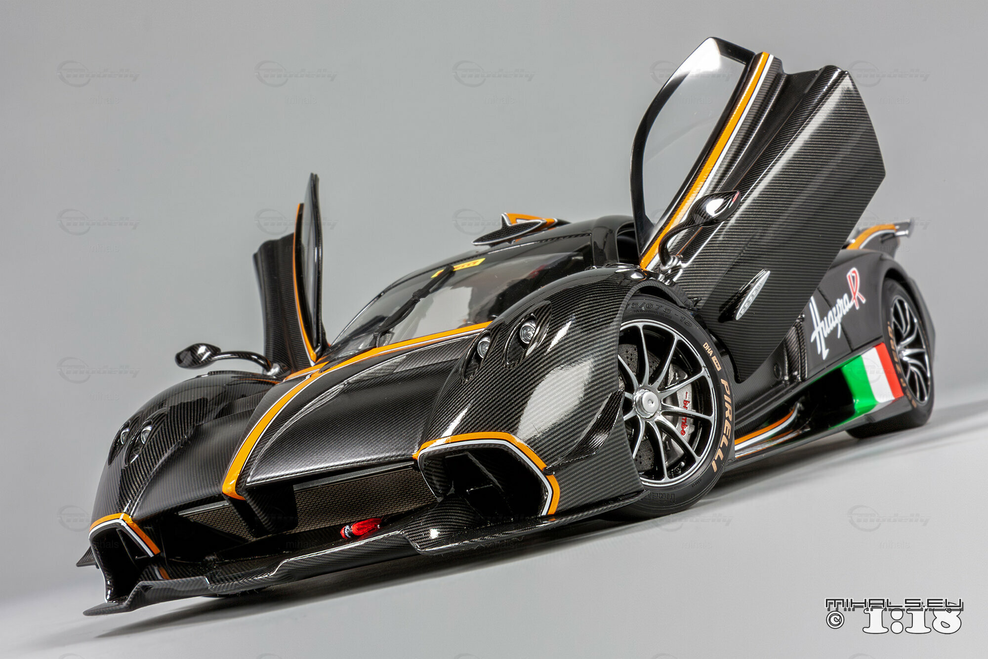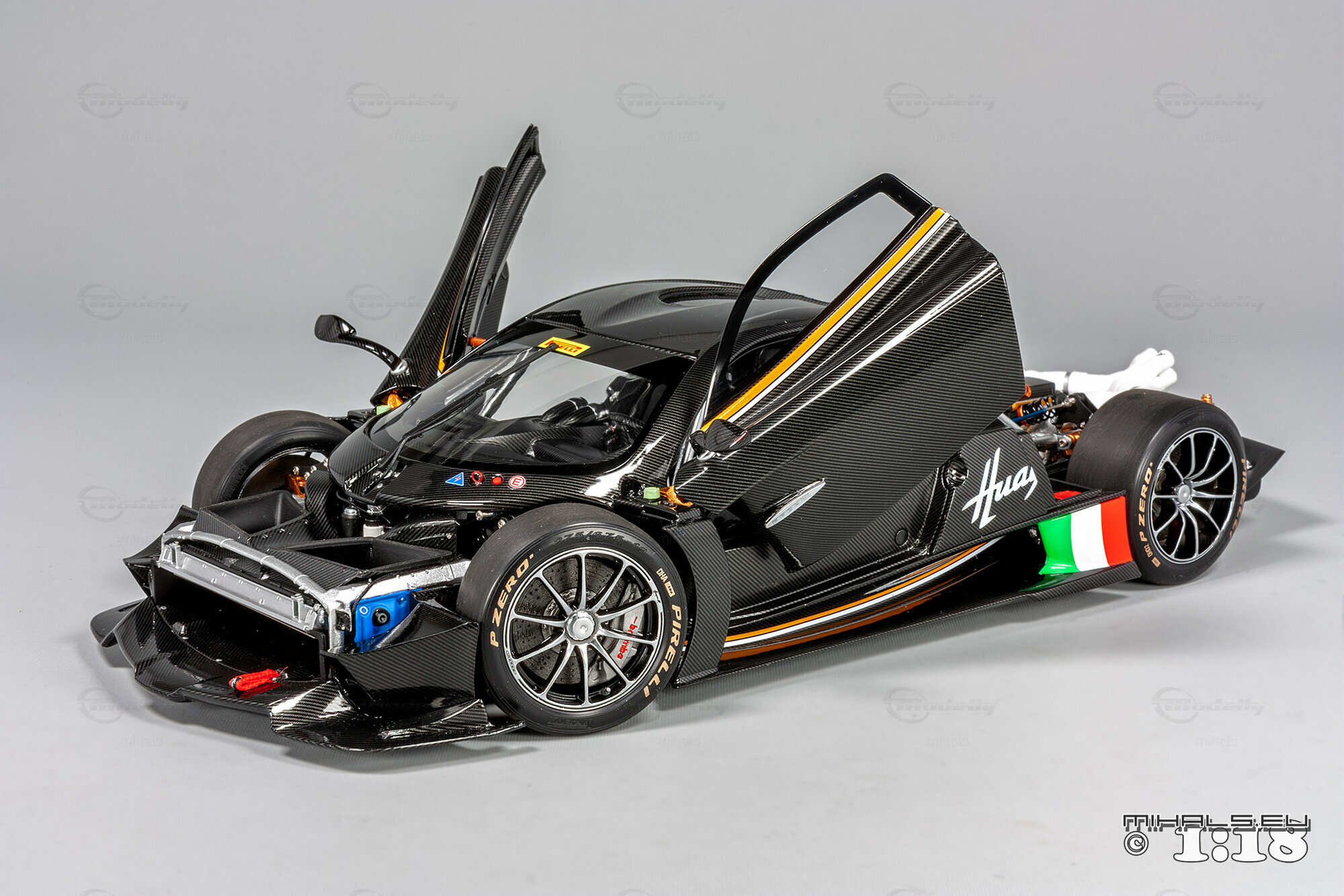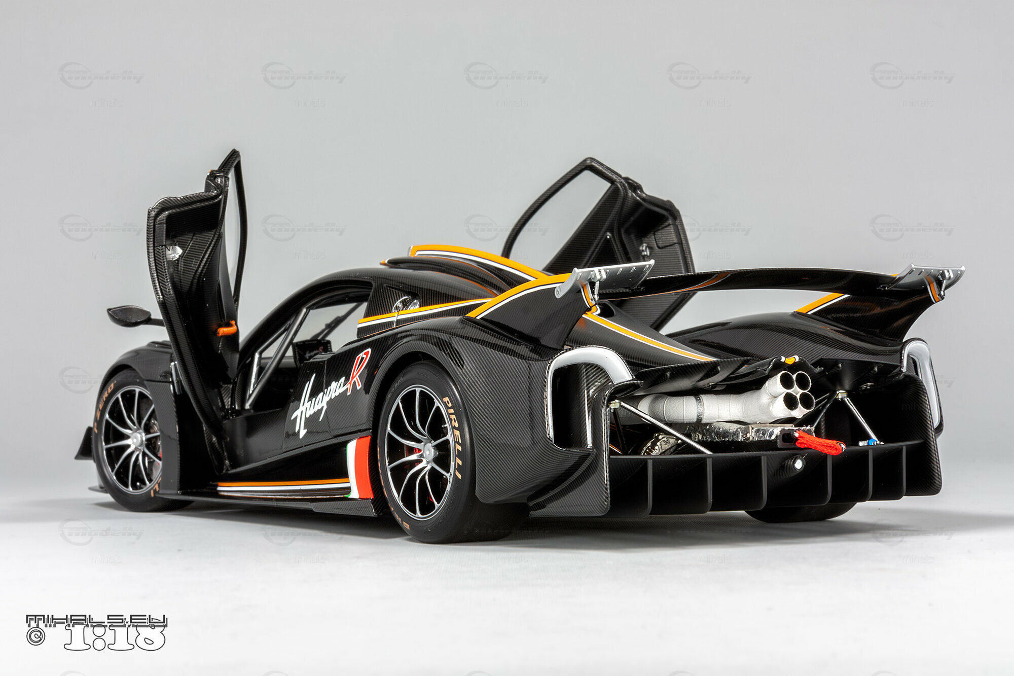The pictured miniature is a 1/18 scale model from LCD Models and is diecast. In the photos you can see nicely executed panel gaps and functional gullwing-style doors that mimic the Huayra R’s opening motion. The visible carbon weave is reproduced across the body, including directional fiber patterns on the fenders, doors and rear wing. The wheels match the multi-spoke central-lock design with a reproduced center nut, and behind them you can spot the brake discs and calipers. The tires carry readable P‑Zero lettering from Pirelli, matching the original supplier; a red front tow point is also detailed. The big rear wing, front splitter and side aero elements show the variety of shapes from the real car. With a door open you can peek into the interior: suggestive racing buckets, harness detail, a wheel with functional-looking areas and a textured center console convey the car’s track focus. For collectors this version is noteworthy: being diecast it’s sturdy, yet detailed enough to convincingly capture the original’s lines.