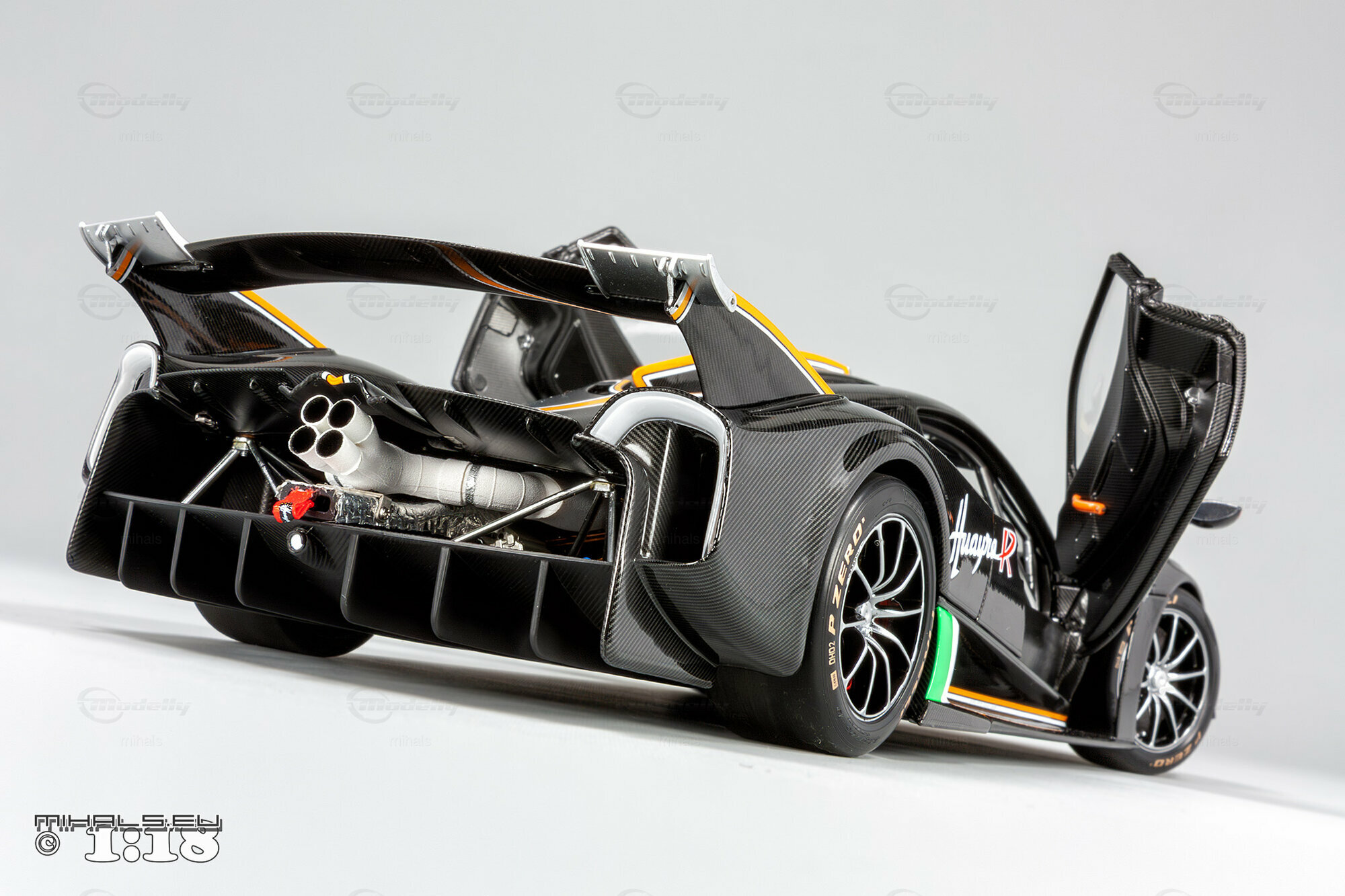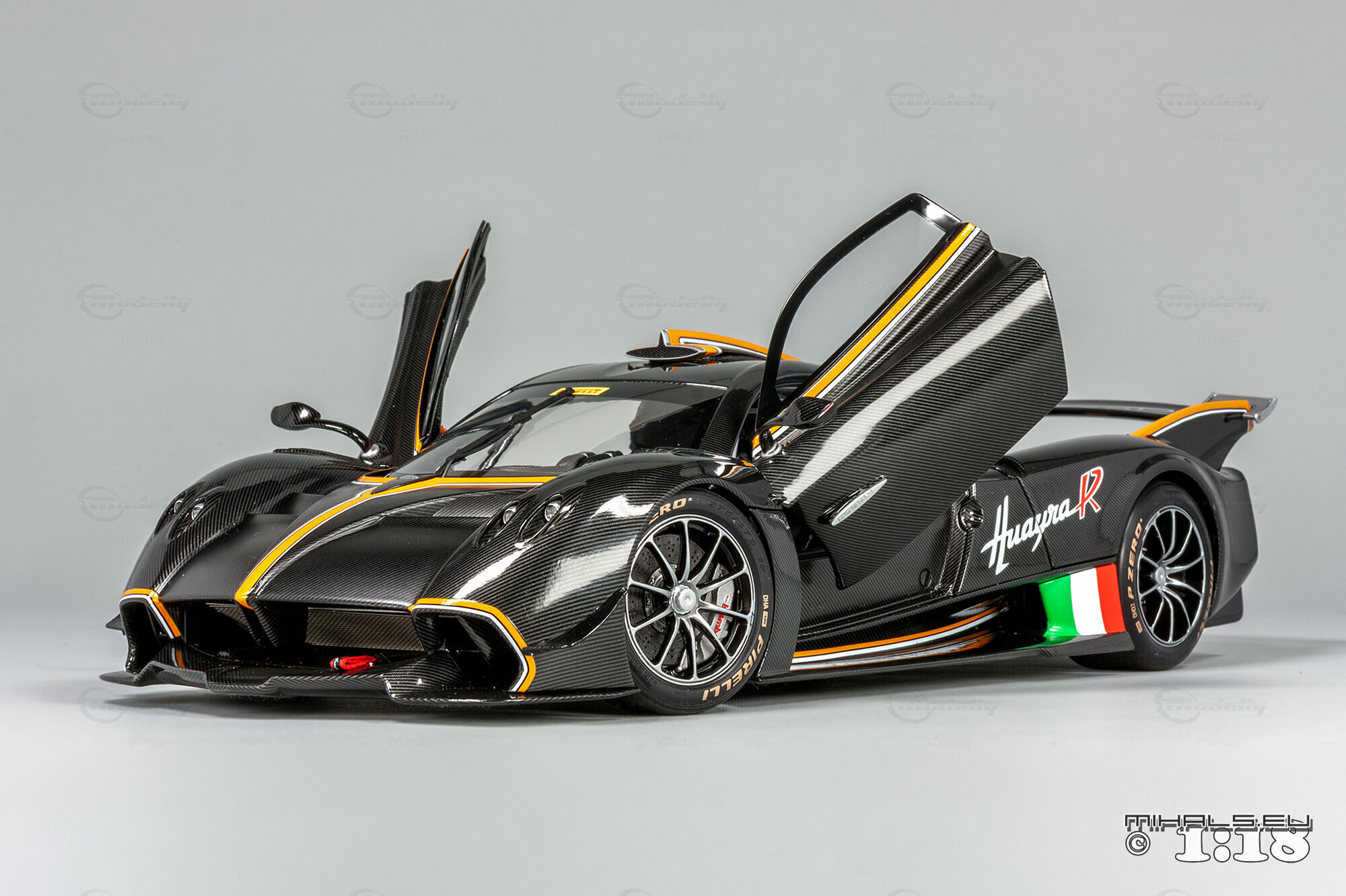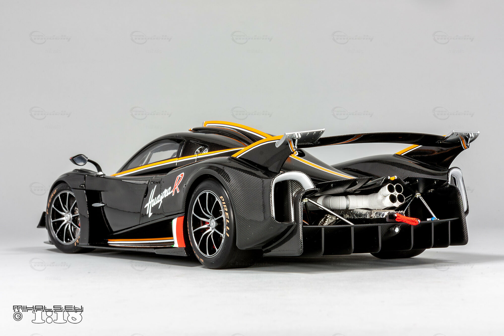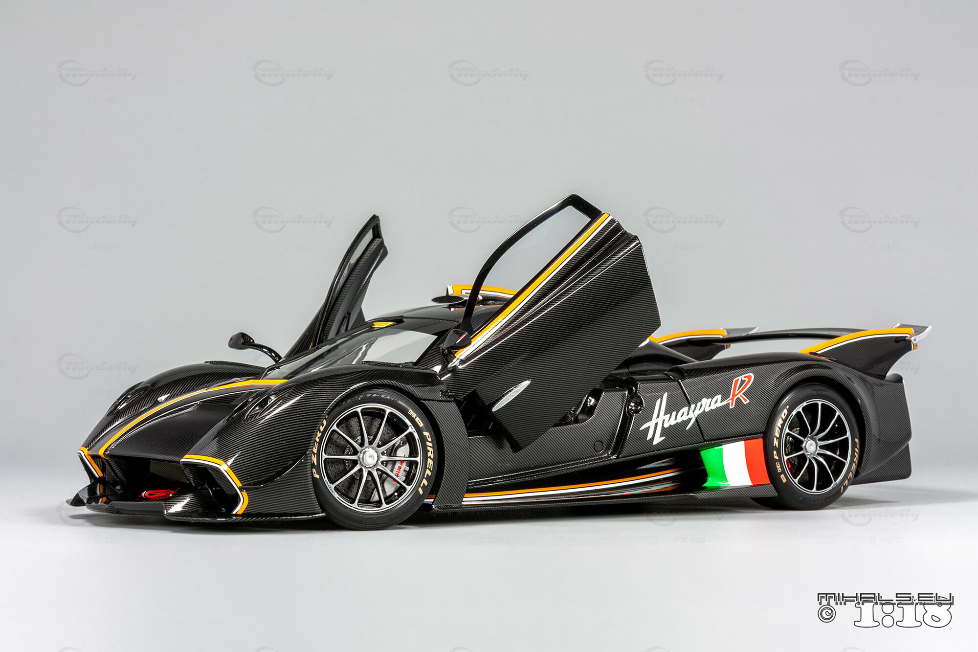 The pictured miniature is a 1/18 scale model from LCD Models and is diecast. In the photos you can see nicely executed panel gaps and functional gullwing-style doors that mimic the Huayra R’s opening motion. The visible carbon weave is reproduced across the body, including directional fiber patterns on the fenders, doors and rear wing. The wheels match the multi-spoke central-lock design with a reproduced center nut, and behind them you can spot the brake discs and calipers. The tires carry readable P‑Zero lettering from Pirelli, matching the original supplier; a red front tow point is also detailed. The big rear wing, front splitter and side aero elements show the variety of shapes from the real car. With a door open you can peek into the interior: suggestive racing buckets, harness detail, a wheel with functional-looking areas and a textured center console convey the car’s track focus. For collectors this version is noteworthy: being diecast it’s sturdy, yet detailed enough to convincingly capture the original’s lines.