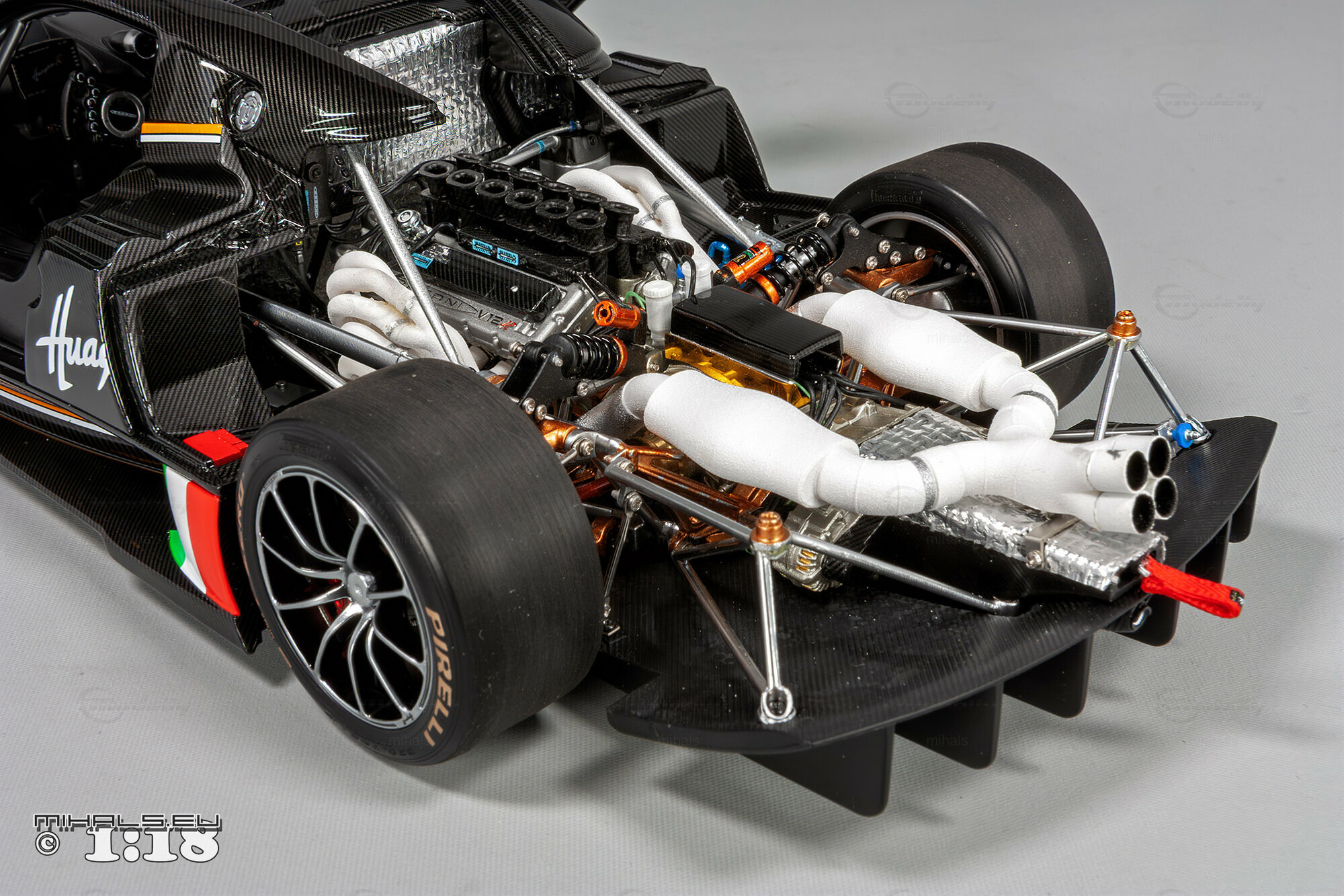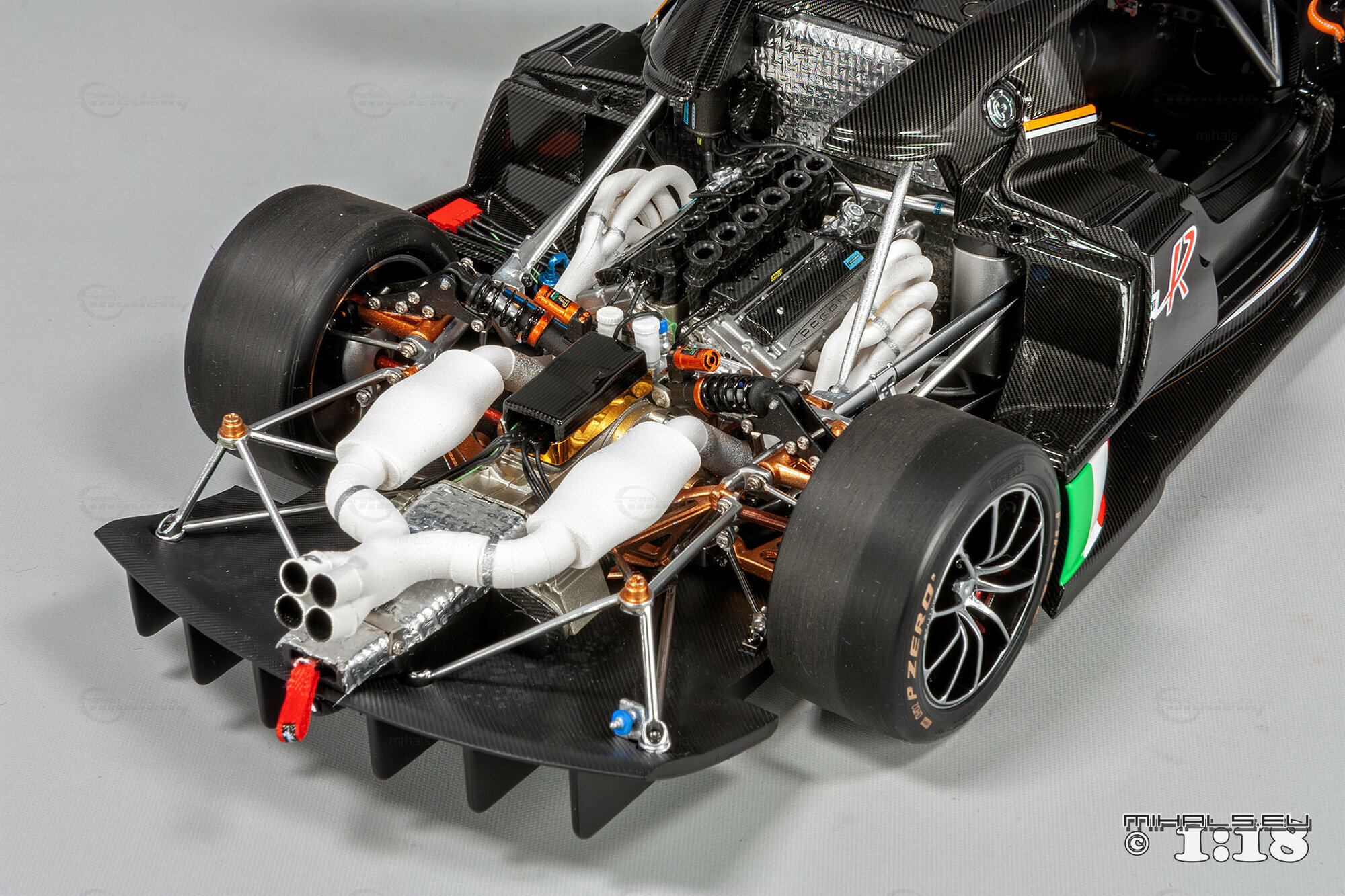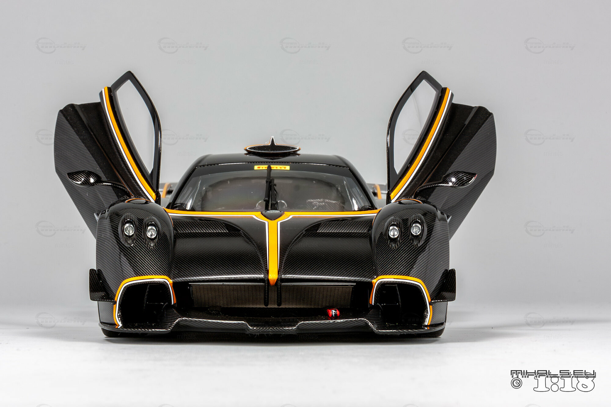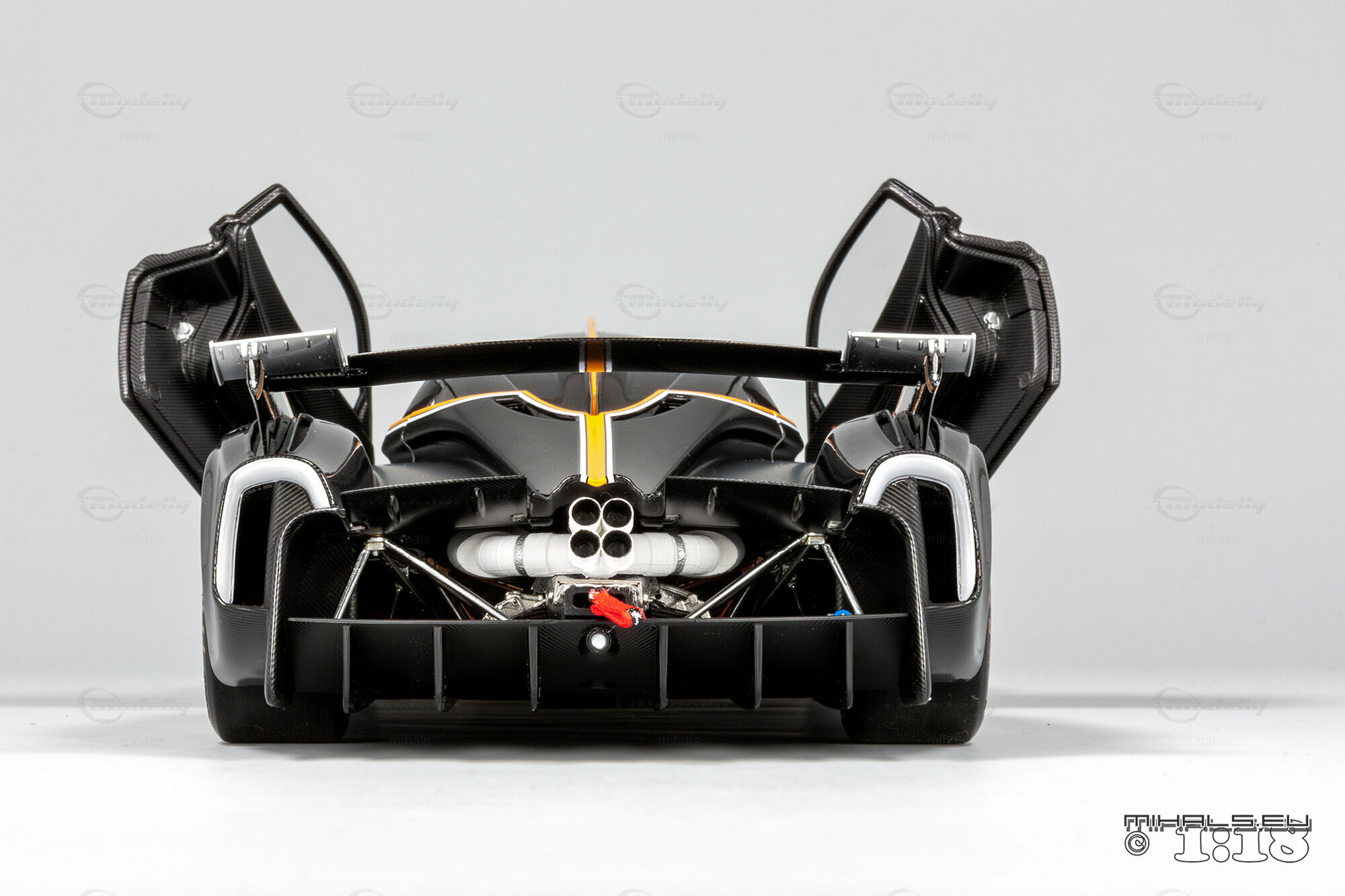 The pictured miniature is a 1/18 scale model from LCD Models and is diecast. In the photos you can see nicely executed panel gaps and functional gullwing-style doors that mimic the Huayra R’s opening motion. The visible carbon weave is reproduced across the body, including directional fiber patterns on the fenders, doors and rear wing. The wheels match the multi-spoke central-lock design with a reproduced center nut, and behind them you can spot the brake discs and calipers. The tires carry readable P‑Zero lettering from Pirelli, matching the original supplier; a red front tow point is also detailed. The big rear wing, front splitter and side aero elements show the variety of shapes from the real car. With a door open you can peek into the interior: suggestive racing buckets, harness detail, a wheel with functional-looking areas and a textured center console convey the car’s track focus. For collectors this version is noteworthy: being diecast it’s sturdy, yet detailed enough to convincingly capture the original’s lines.