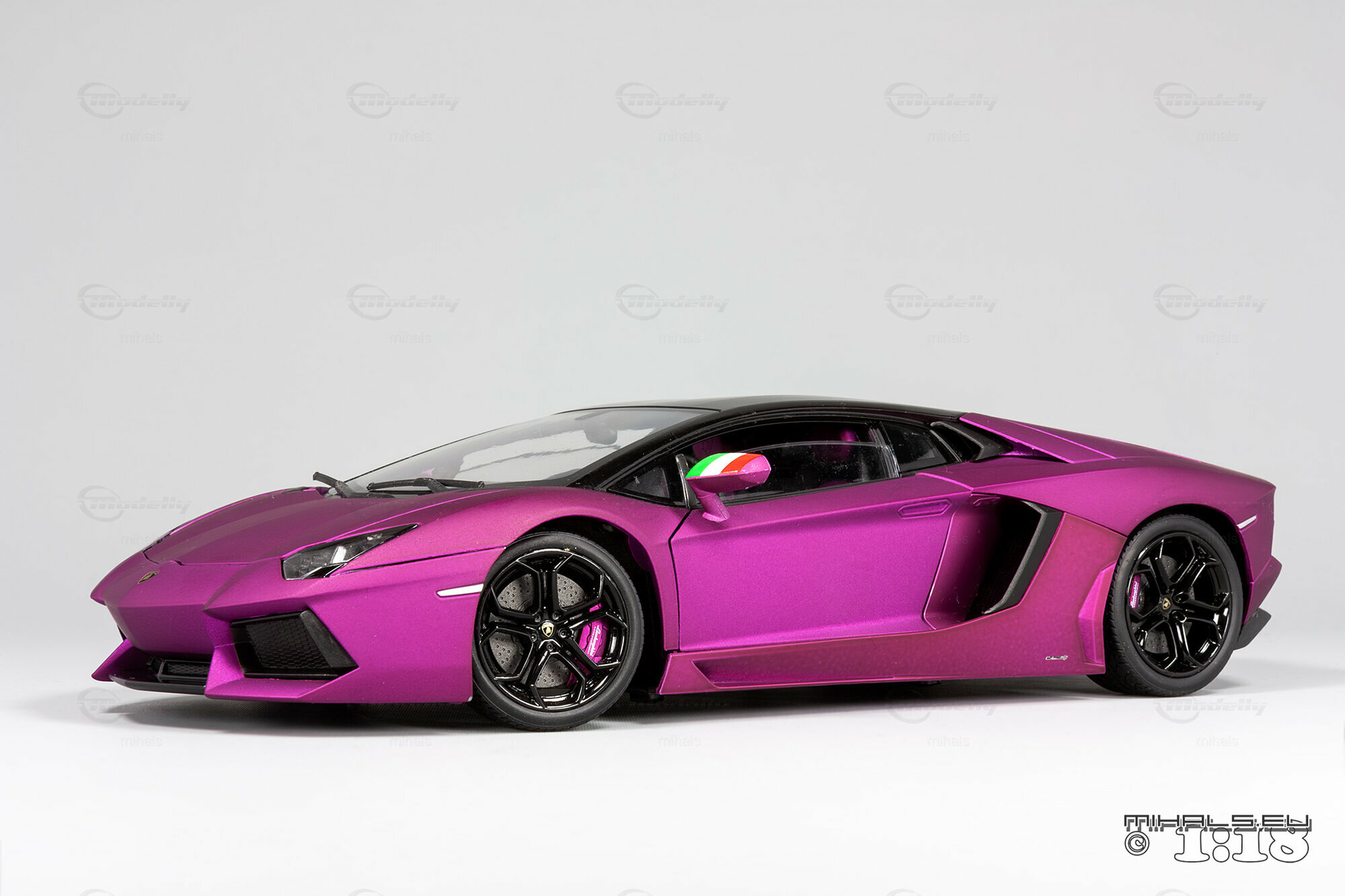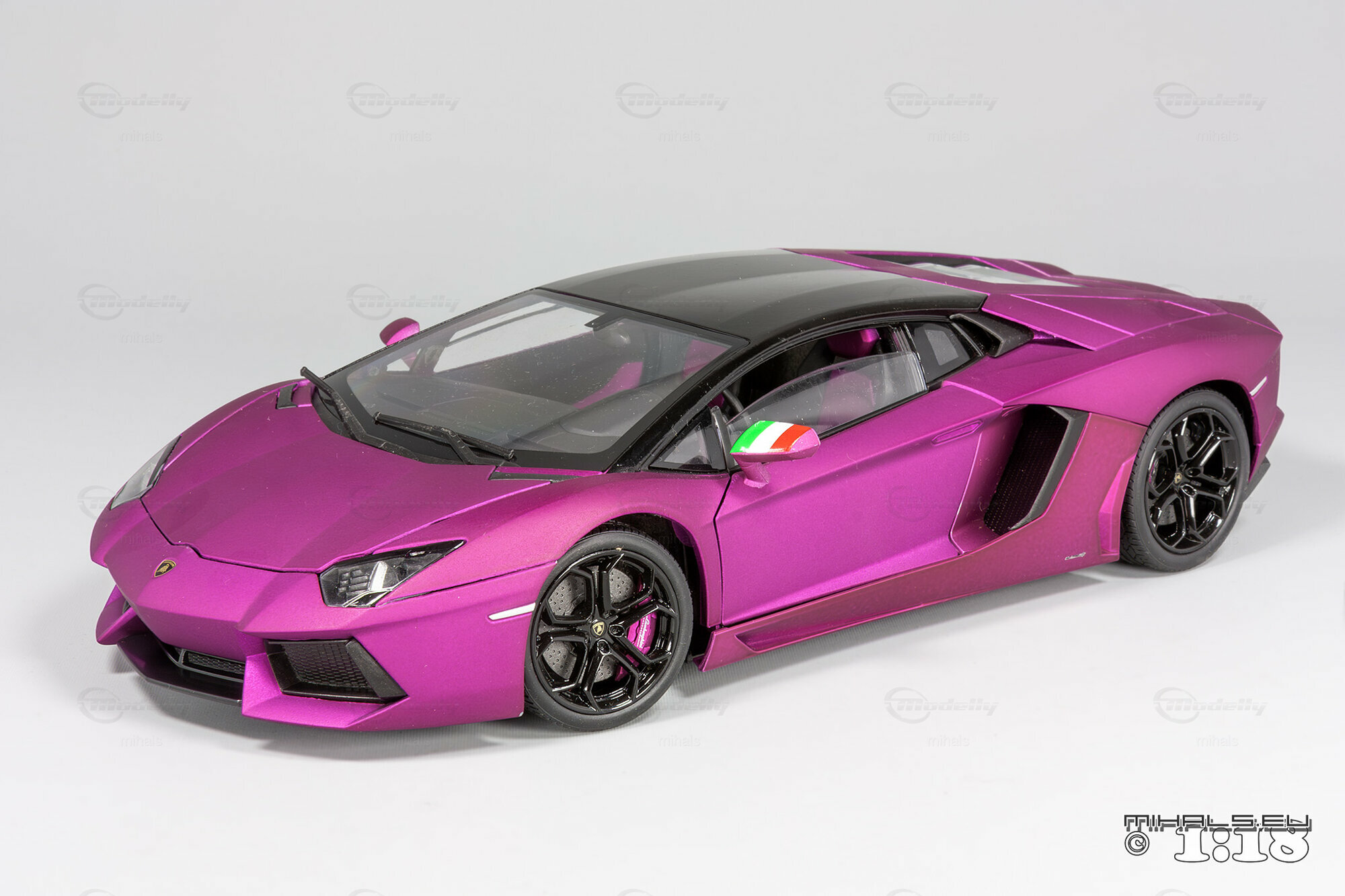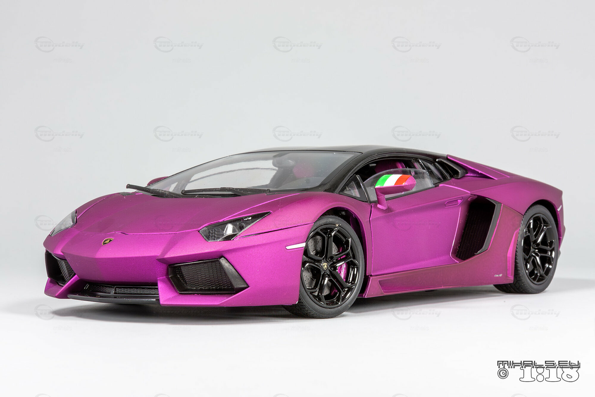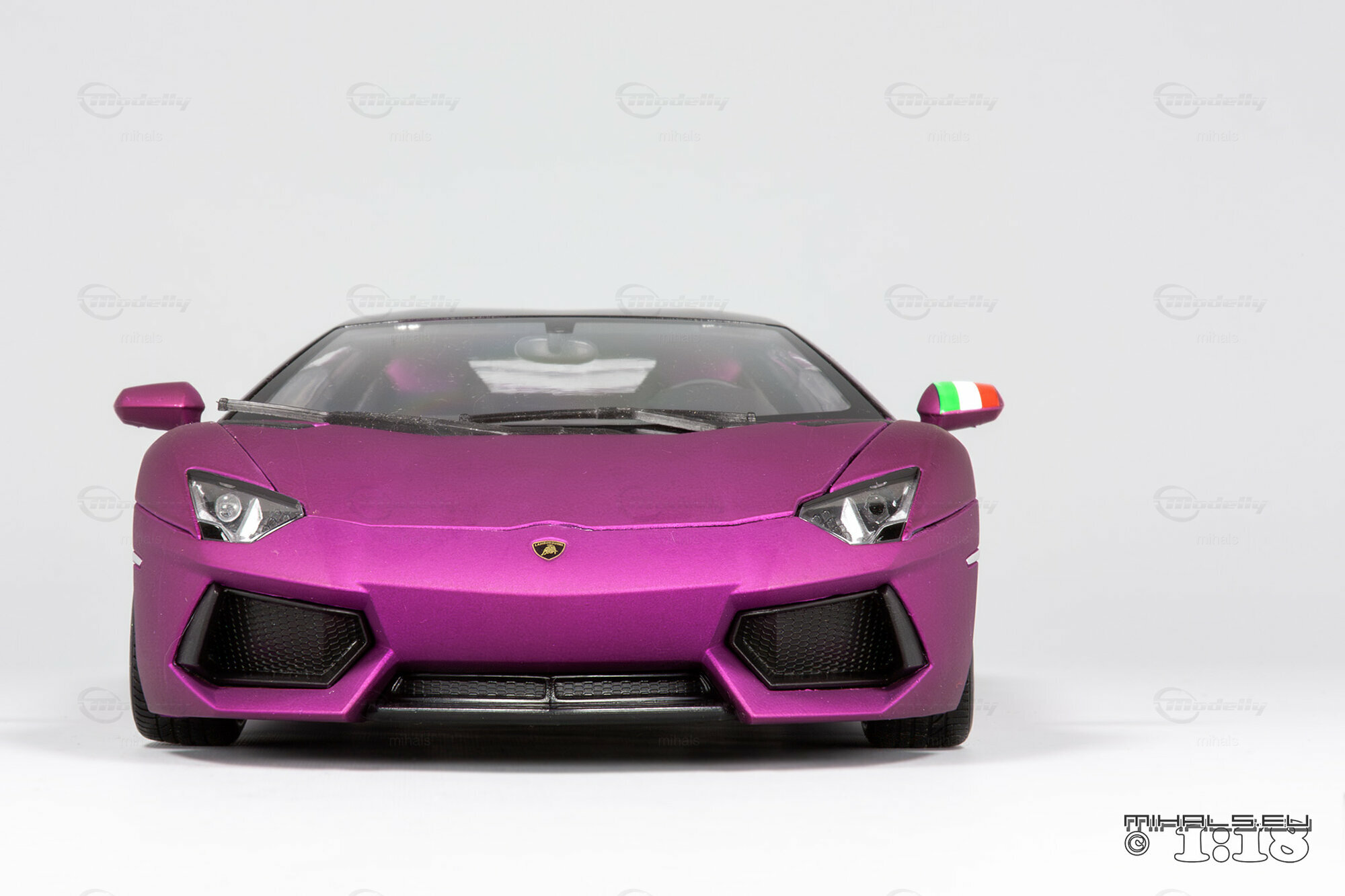 The color is a violet-magenta metallic with a black roof. The gloss and metallic flakes highlight panel edges and shape changes. On the mirrors there’s a decal in green, white and red, hinting at the Italian tricolore. The badge on the nose is gold. The wheels are glossy black; the tires have a tread profile. The gaps on the opening parts are uniform for a diecast piece, and the doors stay open. The material is classic diecast, so the model has noticeable weight and a solid feel. For display I’d recommend a neutral, light base — the violet paint pops under direct light and shows the lines better. In the photos from “mihals” you can see how the front fender crease runs into the doors — a typical Aventador cue. If you want to add this model to a collection, pair it with other V12 Lamborghinis from the era, like a Murciélago as the predecessor or later Aventador S/SVJ models as evolution pieces. One more thing: the pictured miniature from Welly FX is in 1/18 scale, so it fits right in with other models from that brand. The visible details — scissor doors, large side intakes and black roof — make the miniature a faithful, compact representation of the original for your display case.