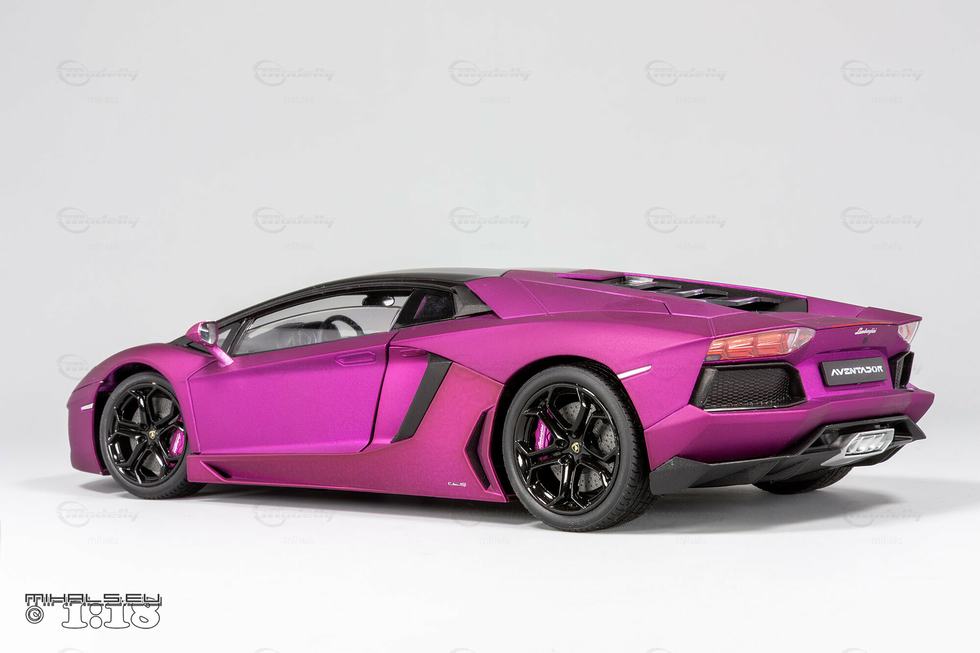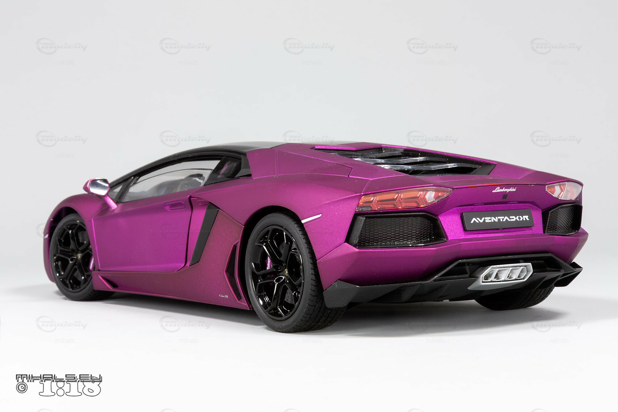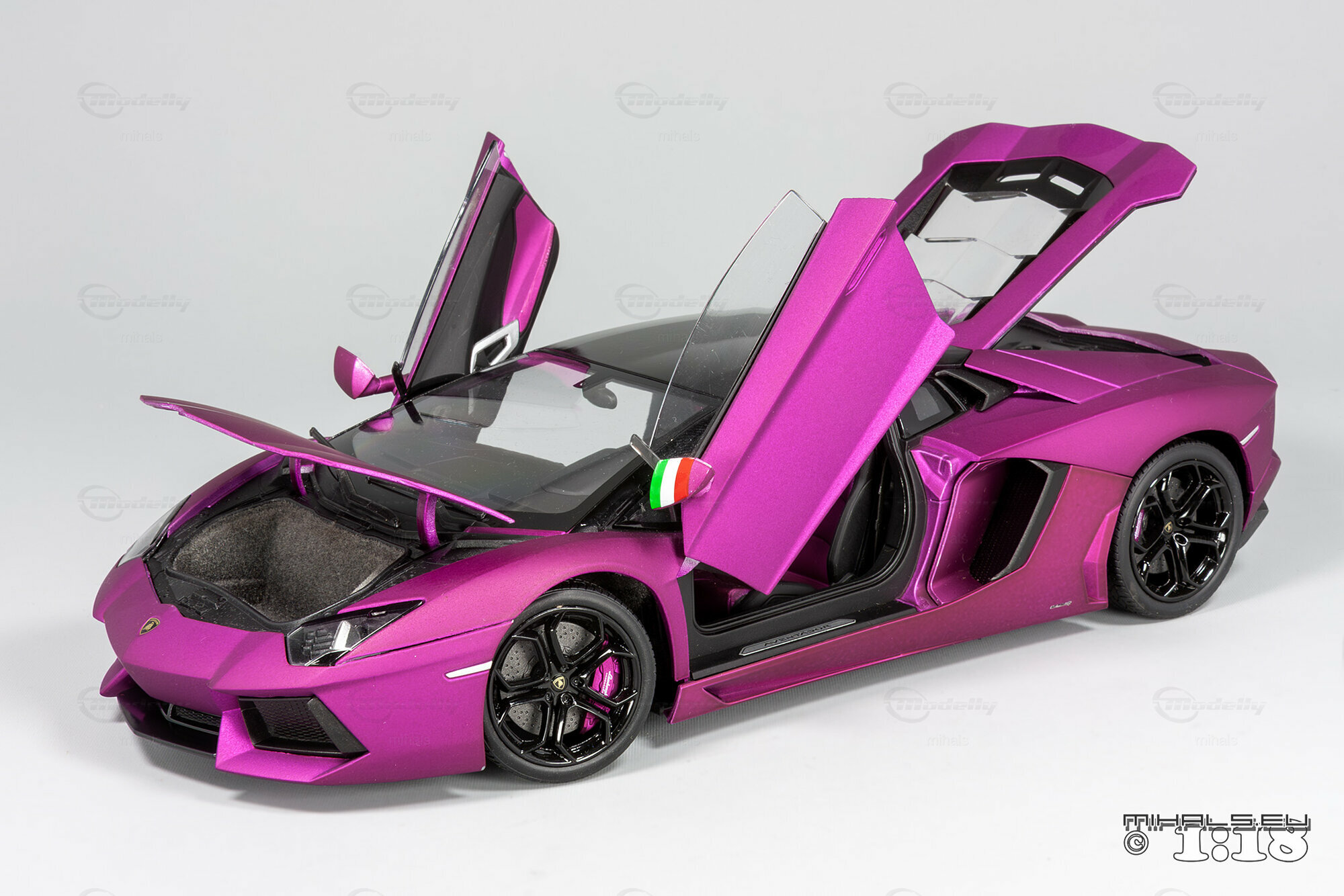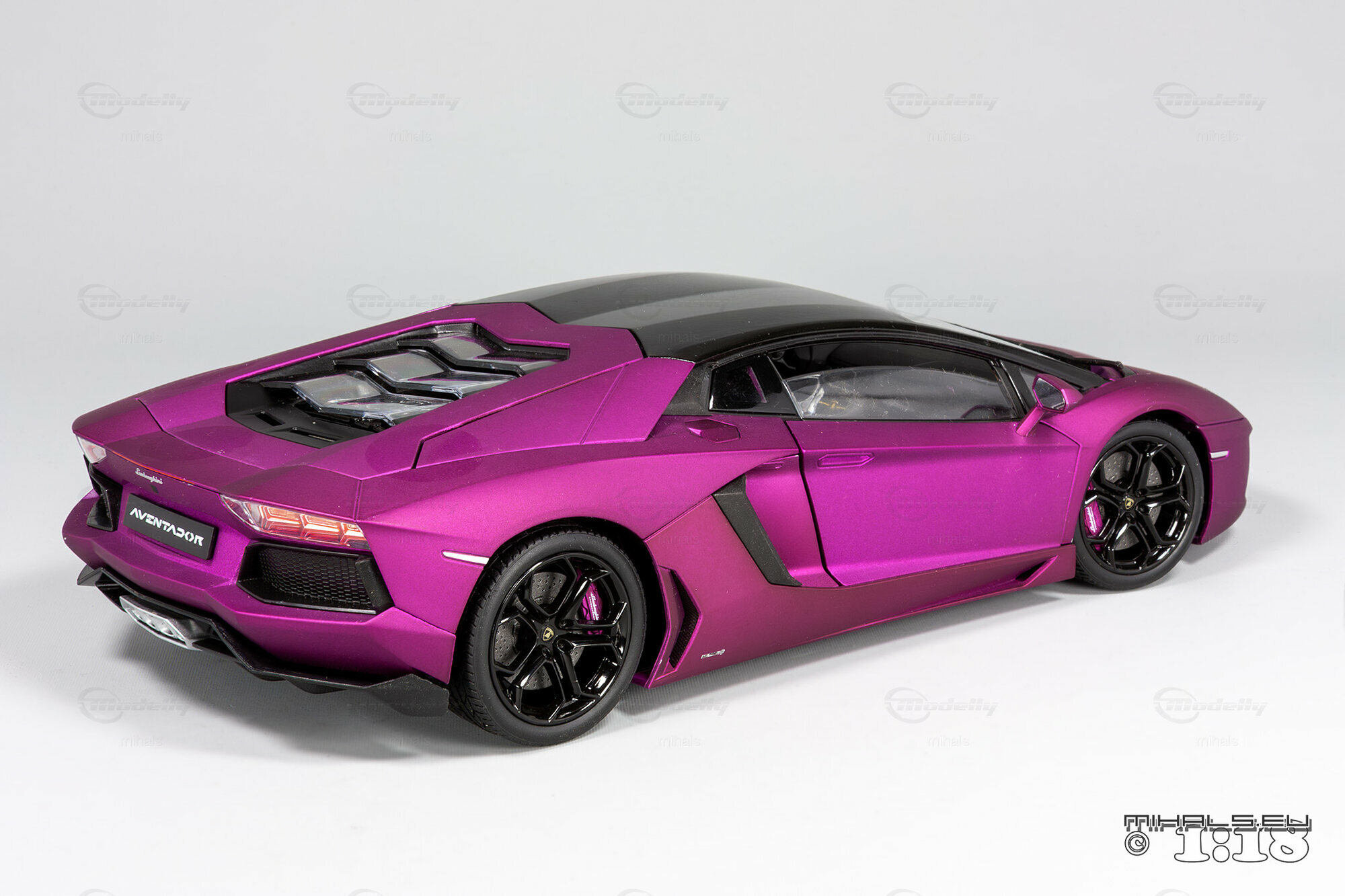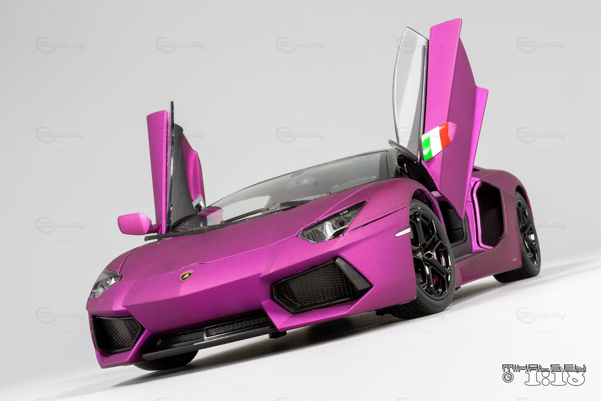 The color is a violet-magenta metallic with a black roof. The gloss and metallic flakes highlight panel edges and shape changes. On the mirrors there’s a decal in green, white and red, hinting at the Italian tricolore. The badge on the nose is gold. The wheels are glossy black; the tires have a tread profile. The gaps on the opening parts are uniform for a diecast piece, and the doors stay open. The material is classic diecast, so the model has noticeable weight and a solid feel. For display I’d recommend a neutral, light base — the violet paint pops under direct light and shows the lines better. In the photos from “mihals” you can see how the front fender crease runs into the doors — a typical Aventador cue. If you want to add this model to a collection, pair it with other V12 Lamborghinis from the era, like a Murciélago as the predecessor or later Aventador S/SVJ models as evolution pieces. One more thing: the pictured miniature from Welly FX is in 1/18 scale, so it fits right in with other models from that brand. The visible details — scissor doors, large side intakes and black roof — make the miniature a faithful, compact representation of the original for your display case.