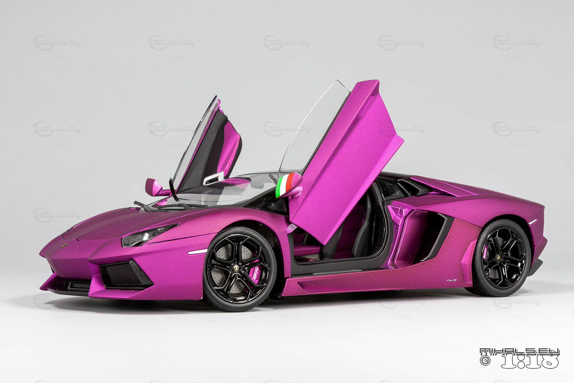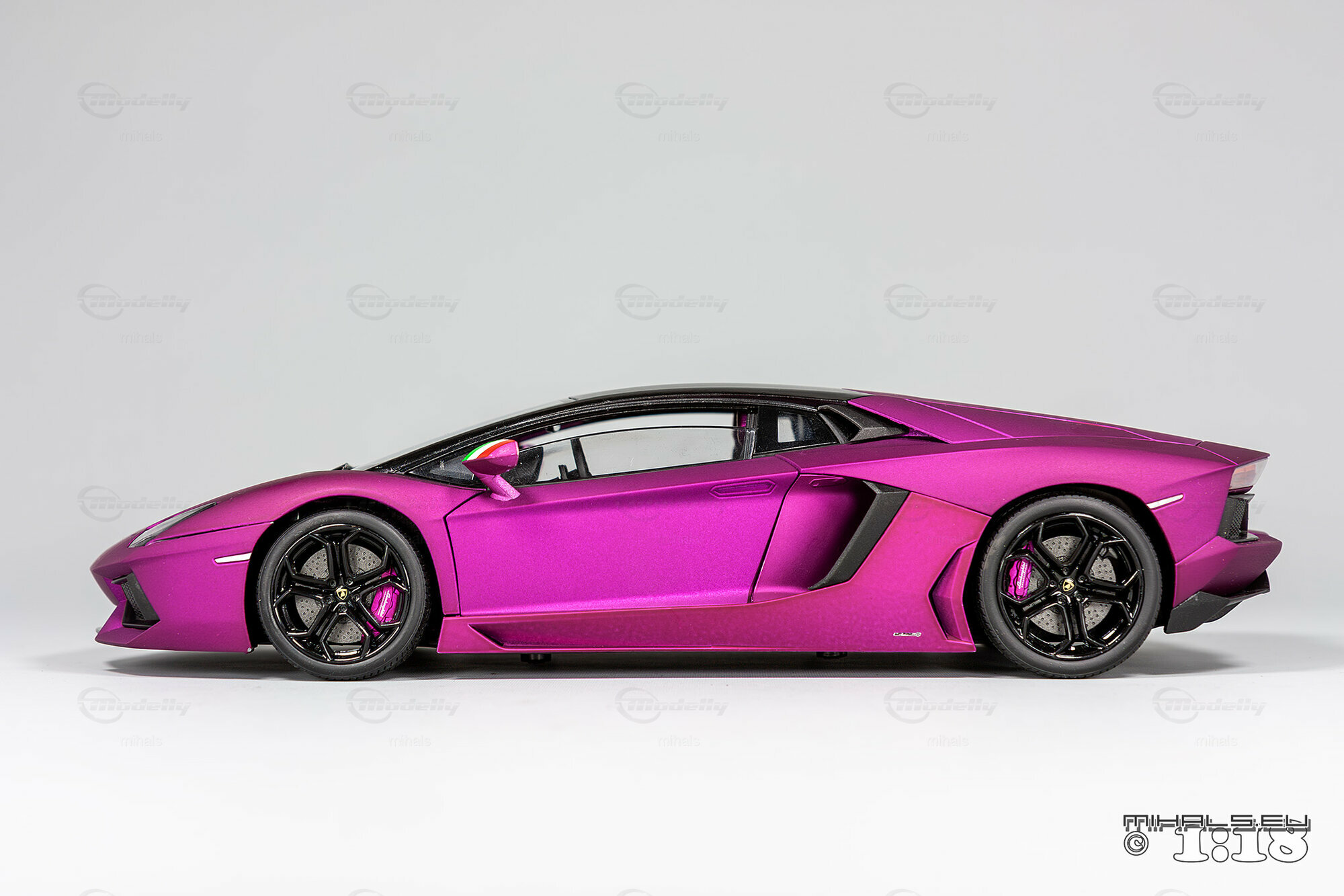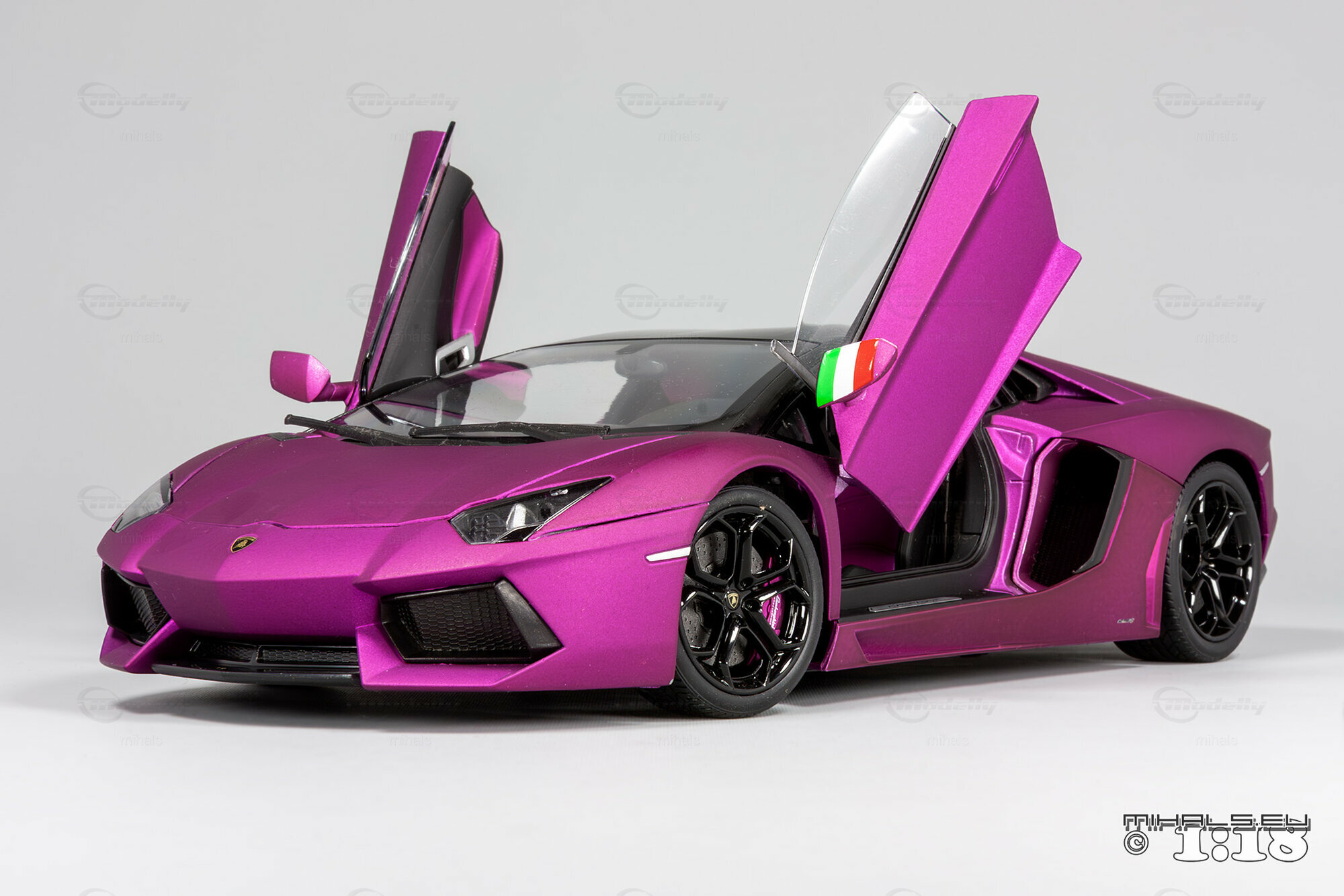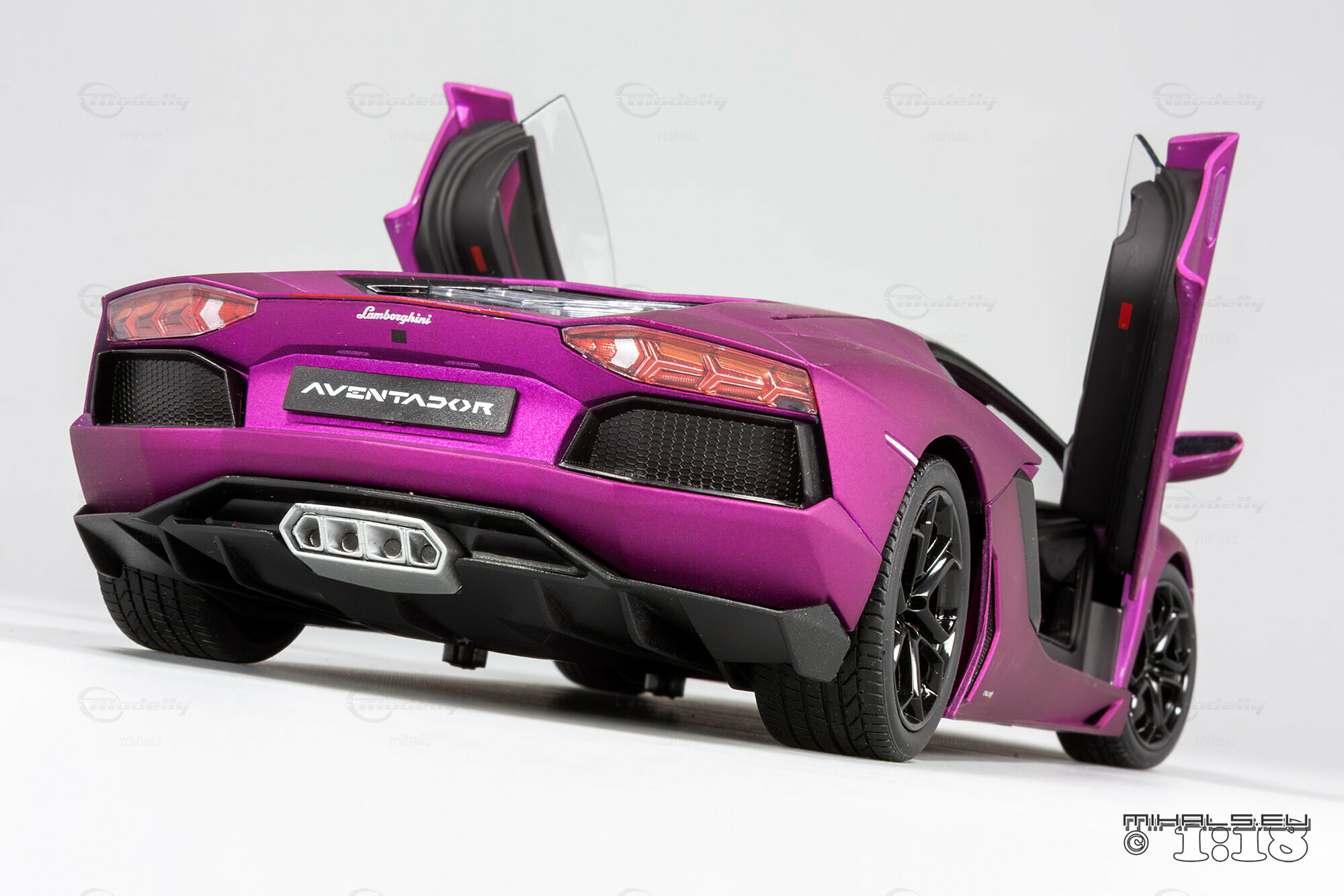 The color is a violet-magenta metallic with a black roof. The gloss and metallic flakes highlight panel edges and shape changes. On the mirrors there’s a decal in green, white and red, hinting at the Italian tricolore. The badge on the nose is gold. The wheels are glossy black; the tires have a tread profile. The gaps on the opening parts are uniform for a diecast piece, and the doors stay open. The material is classic diecast, so the model has noticeable weight and a solid feel. For display I’d recommend a neutral, light base — the violet paint pops under direct light and shows the lines better. In the photos from “mihals” you can see how the front fender crease runs into the doors — a typical Aventador cue. If you want to add this model to a collection, pair it with other V12 Lamborghinis from the era, like a Murciélago as the predecessor or later Aventador S/SVJ models as evolution pieces. One more thing: the pictured miniature from Welly FX is in 1/18 scale, so it fits right in with other models from that brand. The visible details — scissor doors, large side intakes and black roof — make the miniature a faithful, compact representation of the original for your display case.