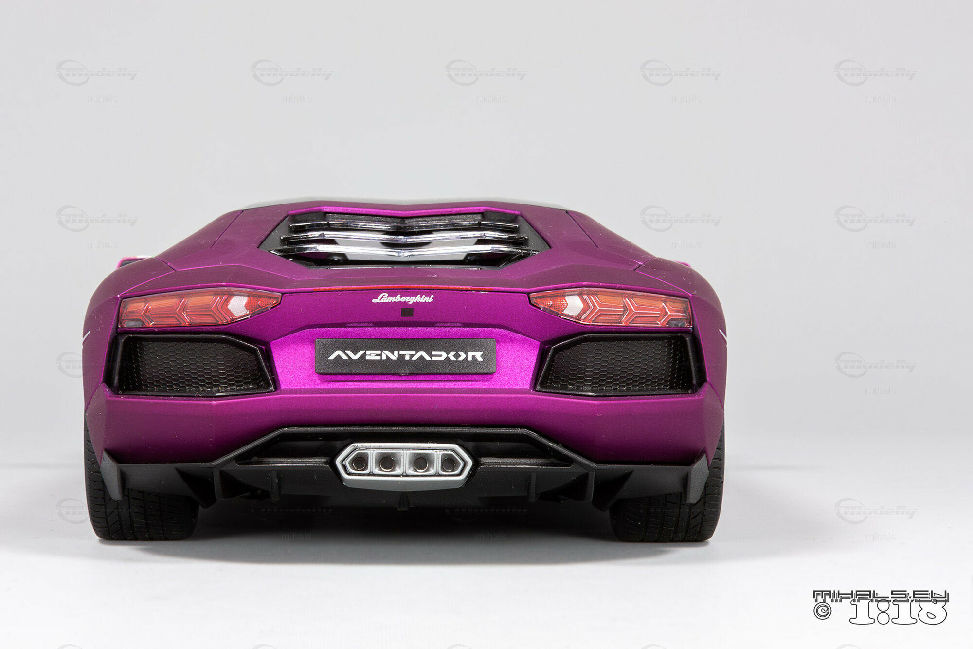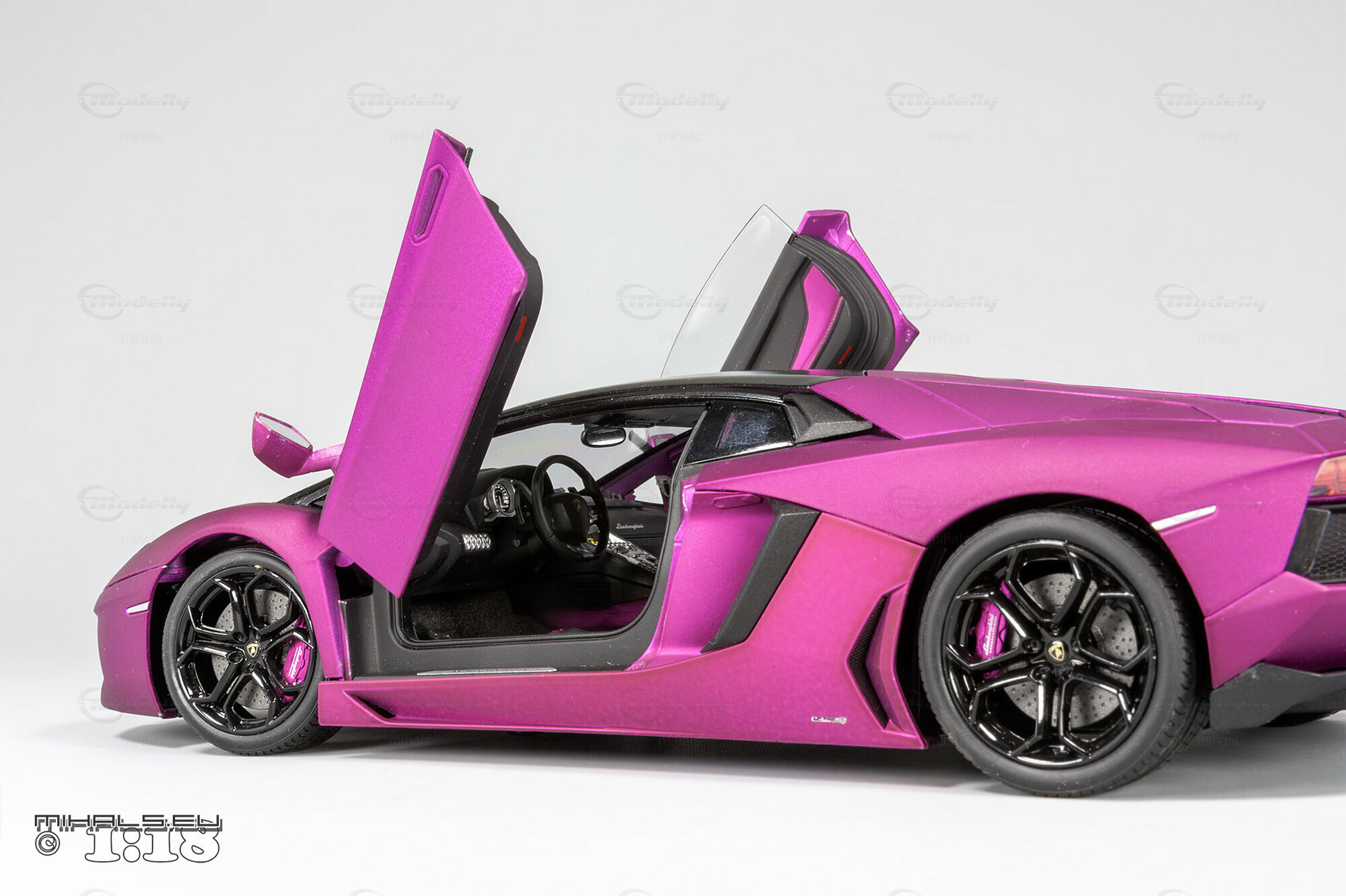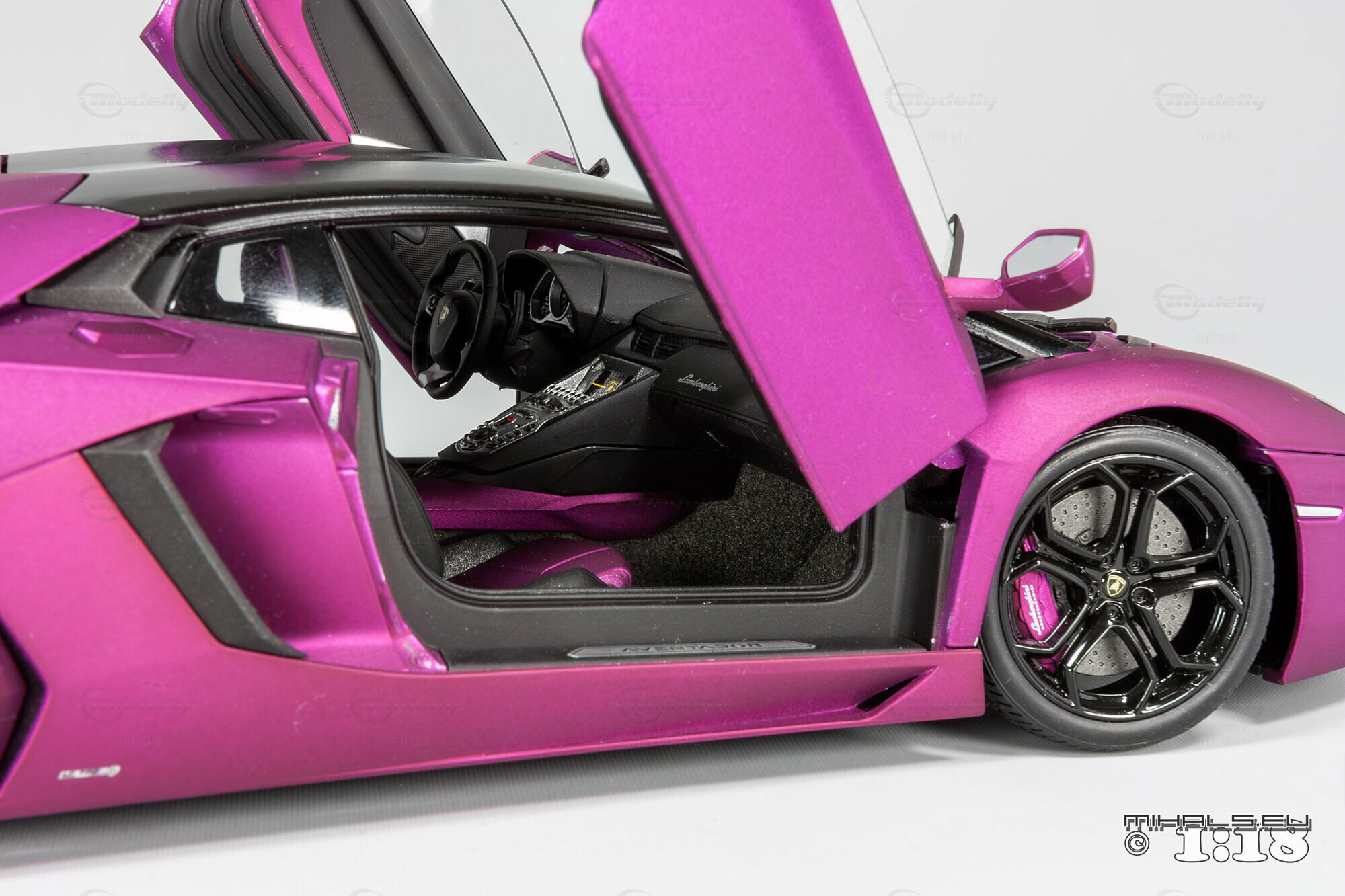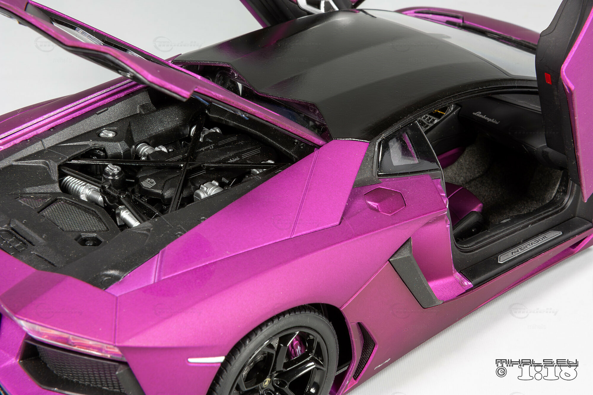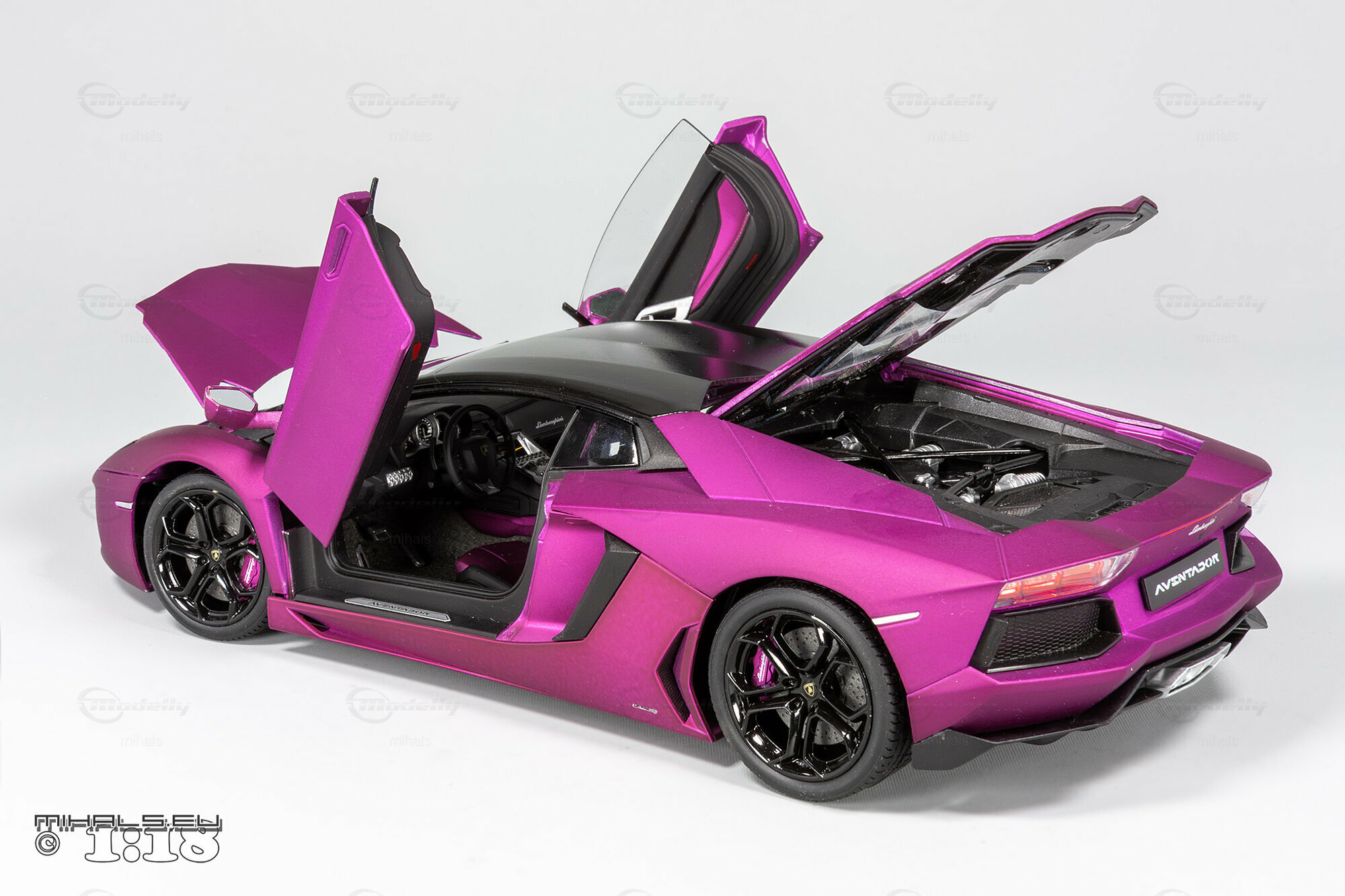 The color is a violet-magenta metallic with a black roof. The gloss and metallic flakes highlight panel edges and shape changes. On the mirrors there’s a decal in green, white and red, hinting at the Italian tricolore. The badge on the nose is gold. The wheels are glossy black; the tires have a tread profile. The gaps on the opening parts are uniform for a diecast piece, and the doors stay open. The material is classic diecast, so the model has noticeable weight and a solid feel. For display I’d recommend a neutral, light base — the violet paint pops under direct light and shows the lines better. In the photos from “mihals” you can see how the front fender crease runs into the doors — a typical Aventador cue. If you want to add this model to a collection, pair it with other V12 Lamborghinis from the era, like a Murciélago as the predecessor or later Aventador S/SVJ models as evolution pieces. One more thing: the pictured miniature from Welly FX is in 1/18 scale, so it fits right in with other models from that brand. The visible details — scissor doors, large side intakes and black roof — make the miniature a faithful, compact representation of the original for your display case.