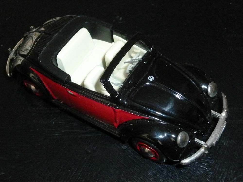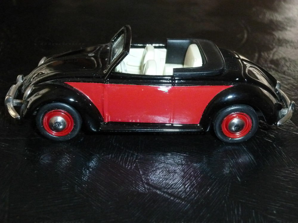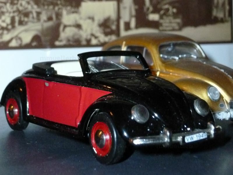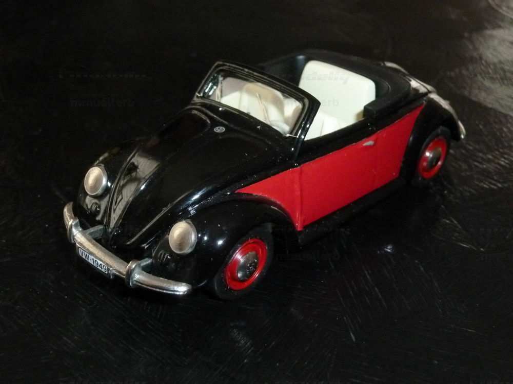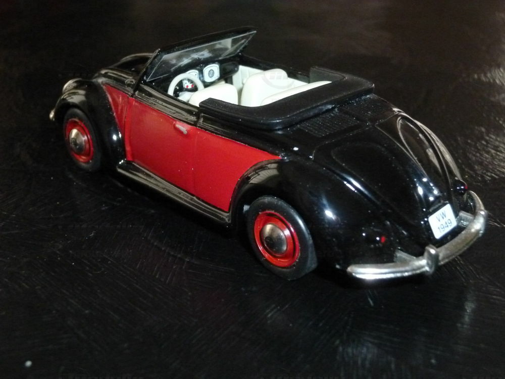 The model car shown in a 1/43 scale is a precise replica of the Beetle Convertible from the collection of Modelly member "mmuellerb". The model was manufactured by Century and stands out with its accurate representation. The model car's paintwork showcases an authentic two-tone combination of black and red. This color scheme strongly resembles the typical colors of the 1940s and 1950s, when the original vehicle was produced.
