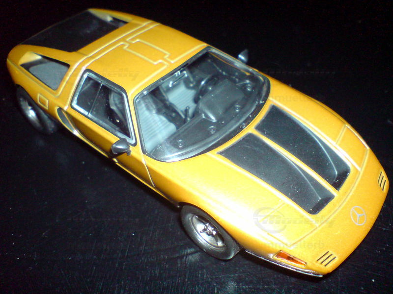 The 1/43 scale model car from IXO / Altaya is a detailed replica of the Mercedes C111 Version II. The model belongs to the collection of member "mmuellerb" on Modelly. The meticulous reproduction of the roof design, the striking gullwing doors, and the iconic star logo on the hood immediately catch the eye. The interior has been carefully crafted with all the important details, such as the visible dashboard and the stylish seats. The shiny yellow-orange paintwork with black accents has been perfectly executed, giving the model its characteristic look.