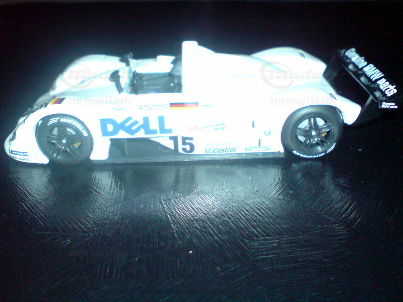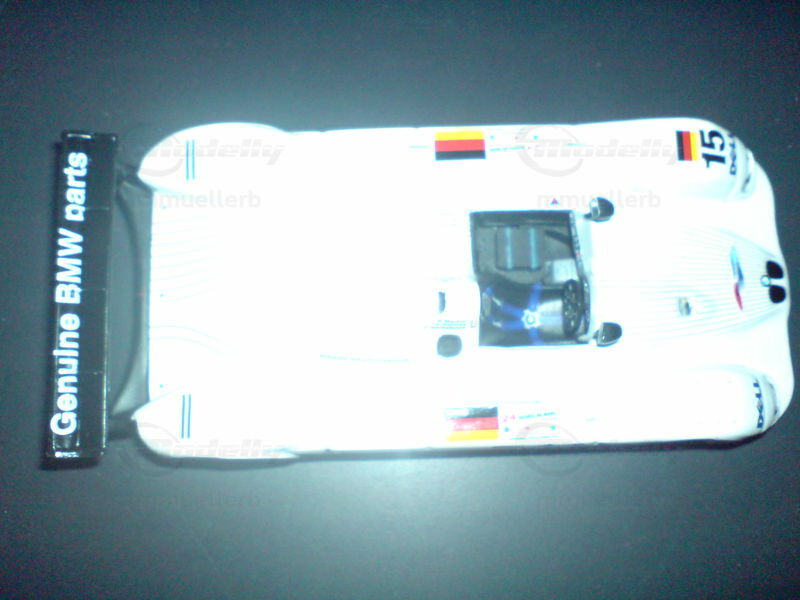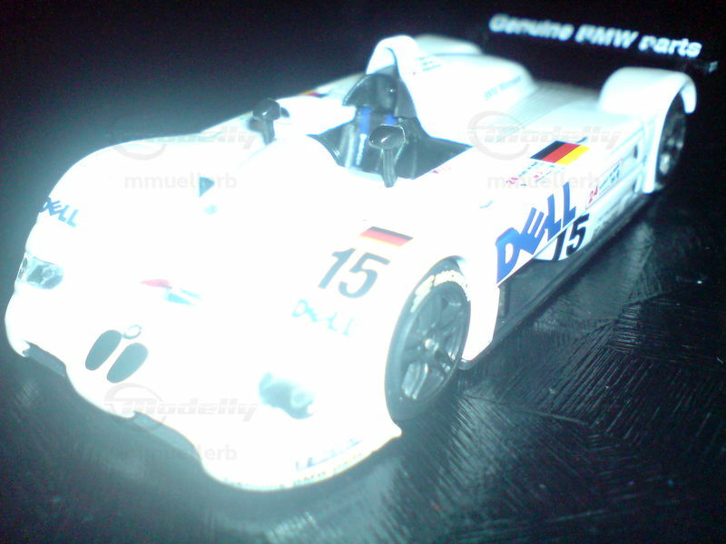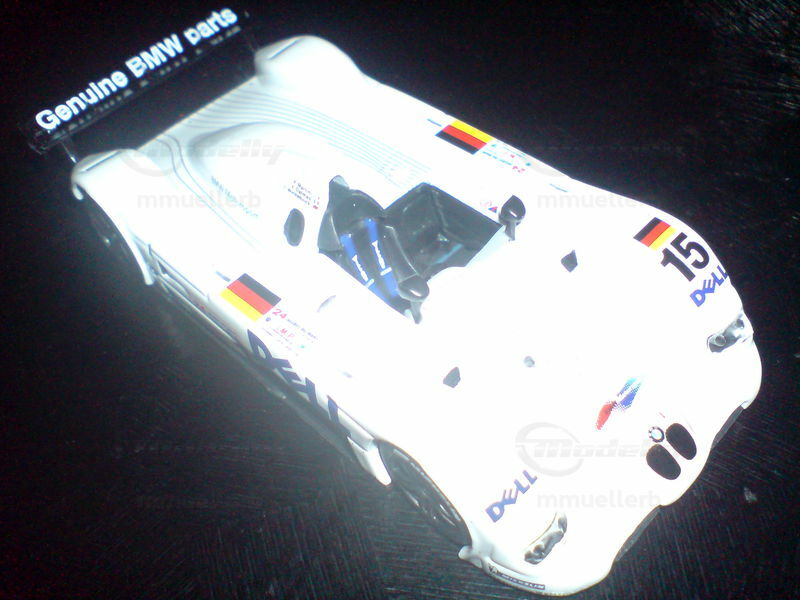 Upon viewing the model car, the high quality of craftsmanship is immediately apparent. The "Genuine BMW Parts" emblem on the rear wing and the Dell logo on the body are visible, giving the model an authentic racing look. Individual design elements like the air intakes, mirrors, and the distinctive front end with the BMW kidney grille are accurately replicated. This 1/43 scale model is a must-have for collectors and brings the glamour and racing history of the BMW V12 LMR to any display shelf.