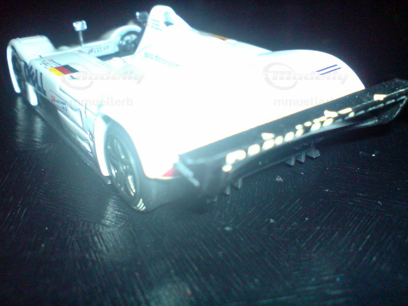 The model car depicted here is a scale replica of the BMW V12 LMR in the scale of 1/43, manufactured by IXO. The model car stands out for its accurate attention to detail and is part of the collection of Modelly member mmuellerb. The white livery, with the distinctive lines and sponsor decals of Dell and Genuine BMW Parts, is faithfully reproduced. Even the small details like the driver cockpit area, the wheels, and the tires are impressively modeled. It's a model car that highlights both the aesthetics and technical finesse of the original.