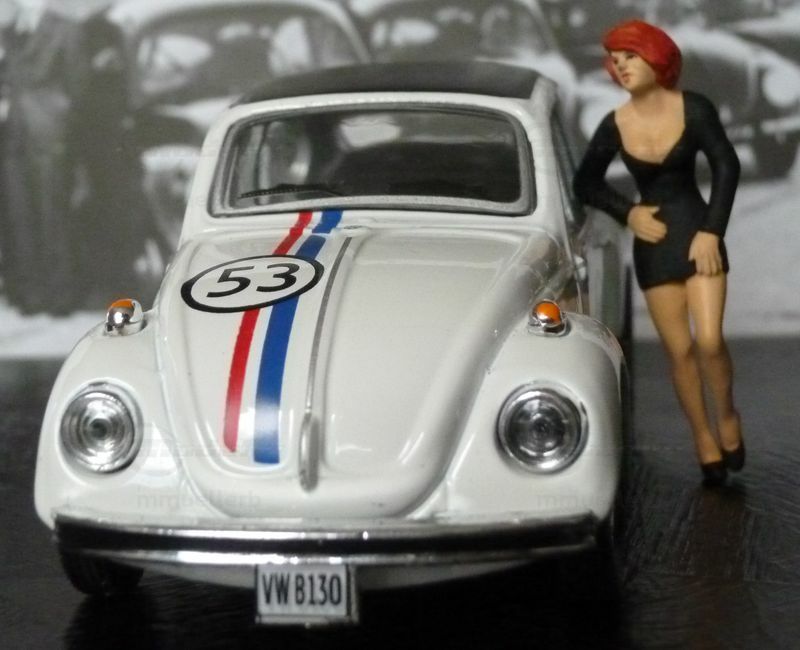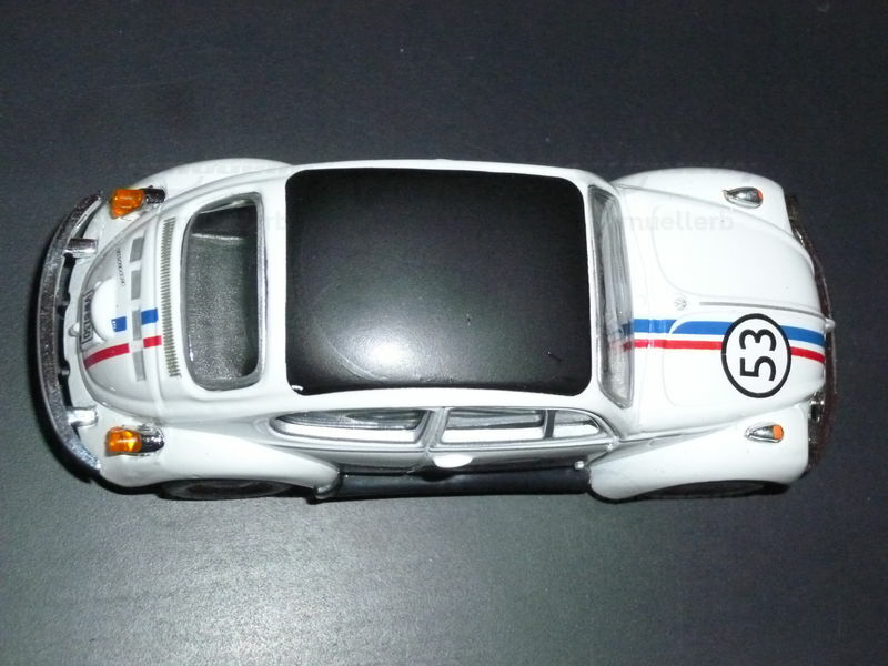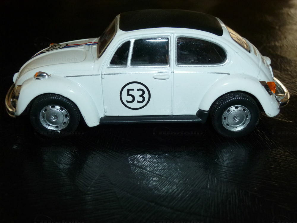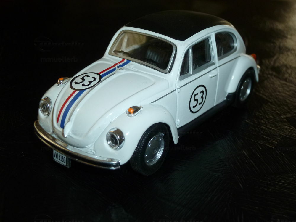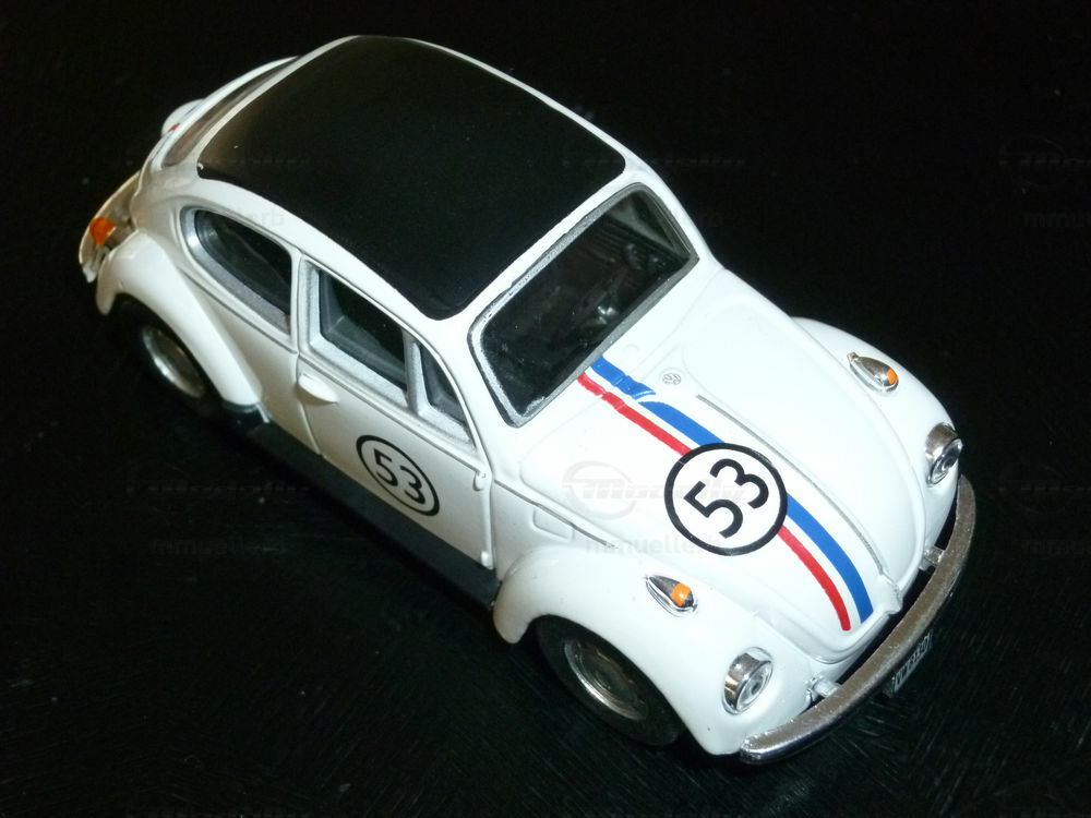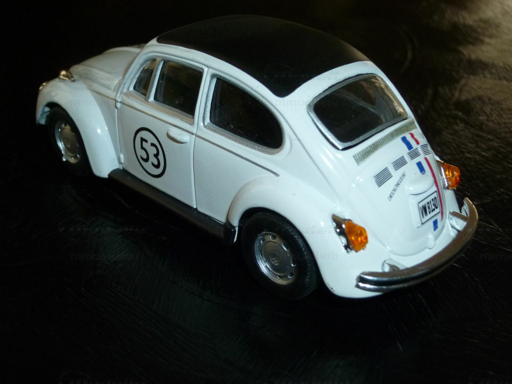 The 1/43 scale model car produced by Oxford Diecast represents the Volkswagen Beetle in its classic look. This model, part of the collection of Modelly member "mmuellerb," is an excellent example of detailed miniatures. In the photos, it is seen in a white color, adorned with racing stripes in blue and red, as well as the iconic number 53 on the hood and doors. The paintwork and decals are cleanly and precisely applied, contributing to a realistic appearance. The model also showcases the small and compact style of the original Volkswagen Beetle, including the distinctive headlights and characteristic shapes.