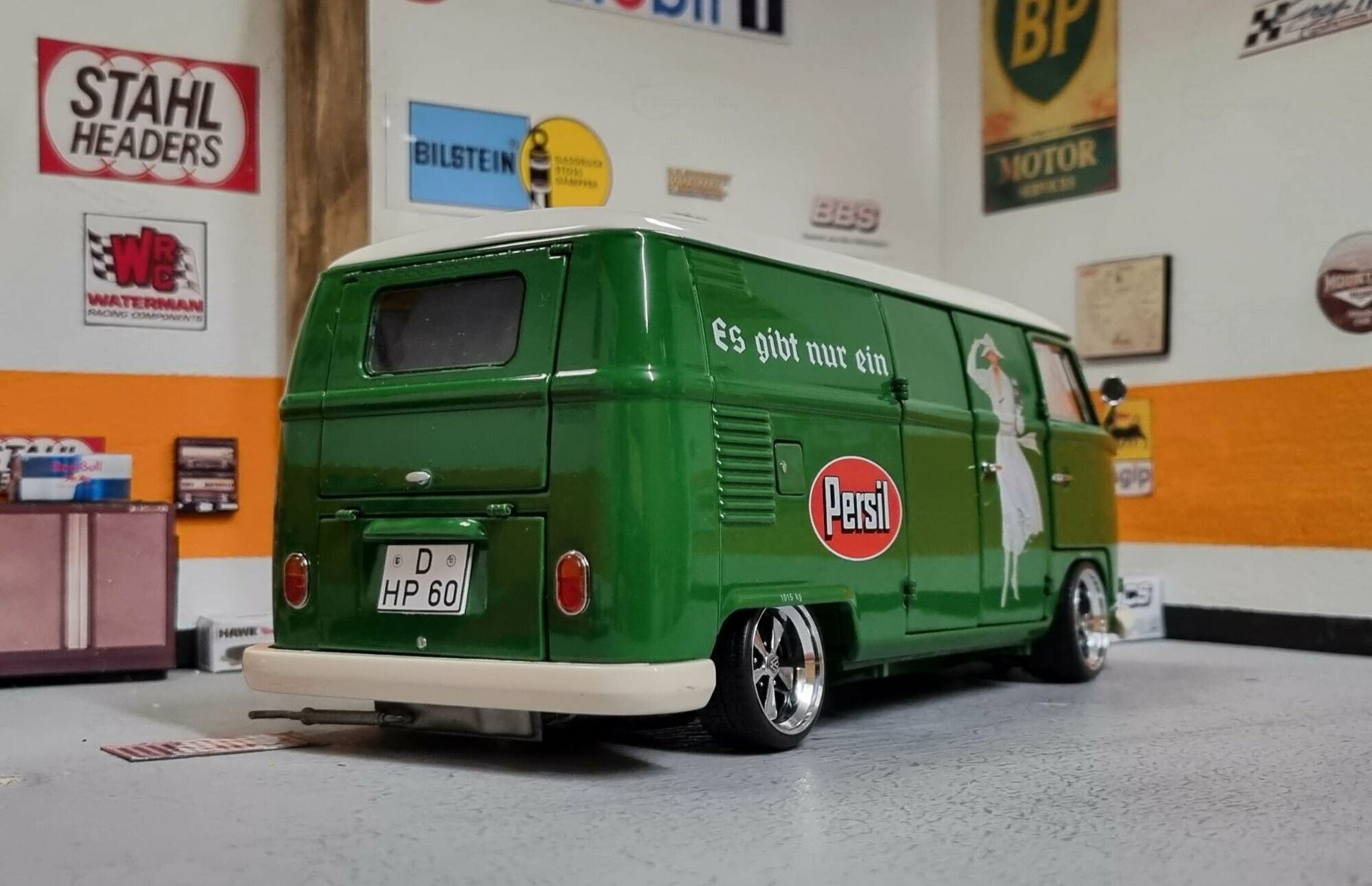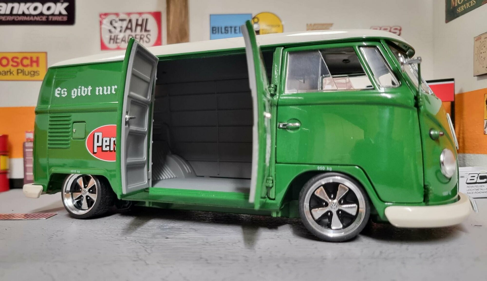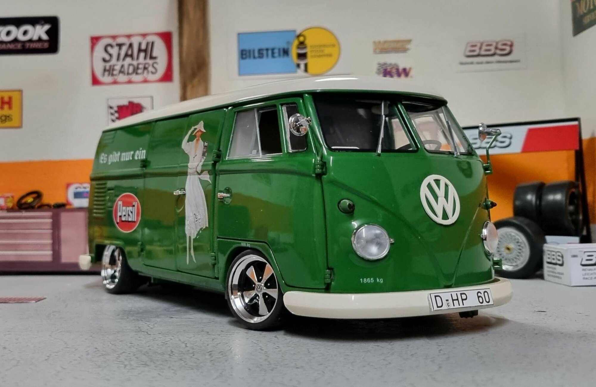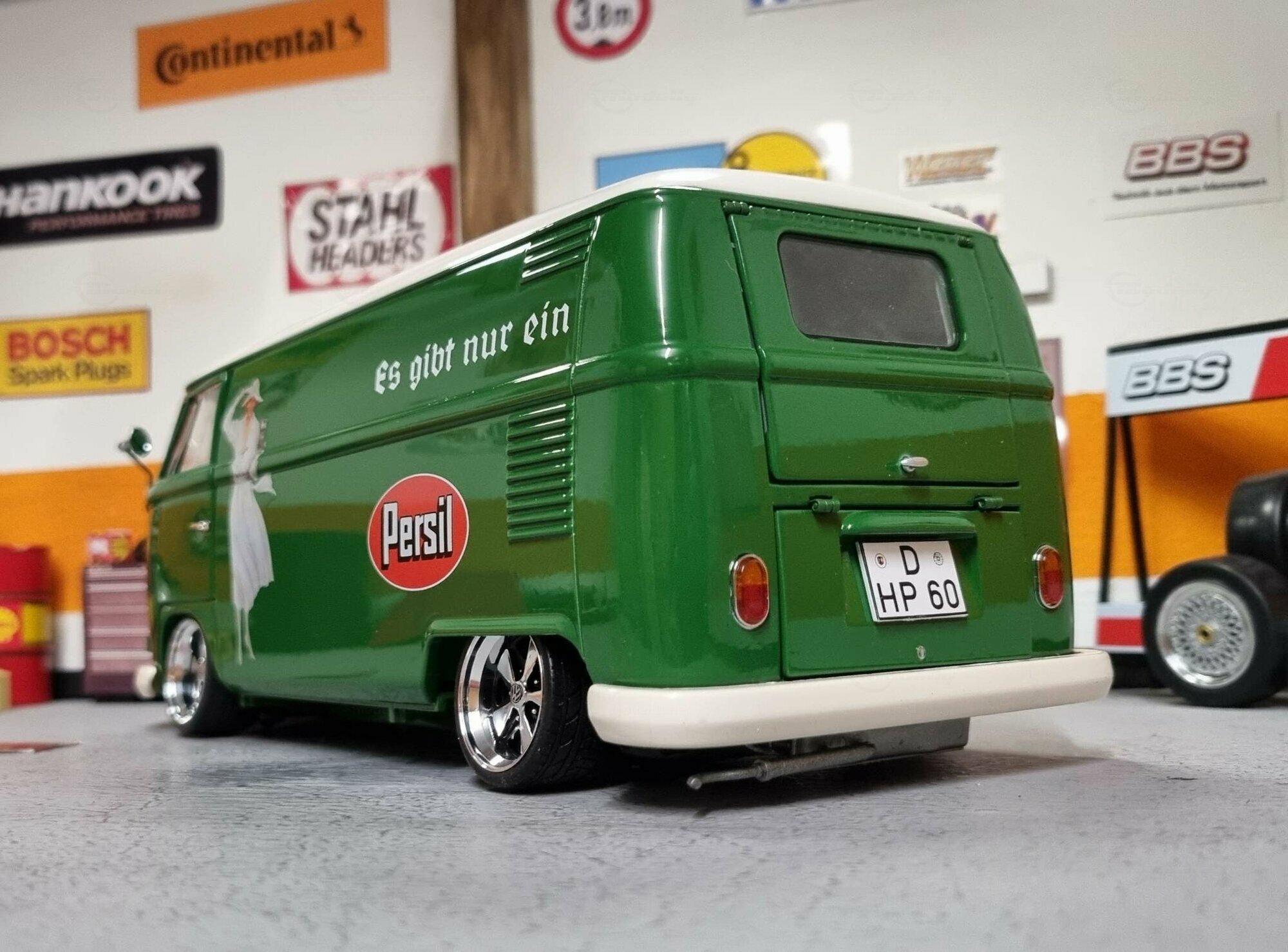 The special customization of the model includes not only the color adaptation but also changes to the wheels. The model features sporty, chrome-shining rims that emphasize the dynamism and performance of the Volkswagen T1. Unfortunately, the manufacturer of the wheels cannot be clearly identified in the pictures. An interesting detail is the authentic license plate reading "D-HP 60", indicating the production year of 1960. The detailed replication of the headlights and taillights exemplifies high-quality model craftsmanship. Additionally, various scattered logos in the background of the workshop create a genuine workshop ambiance.