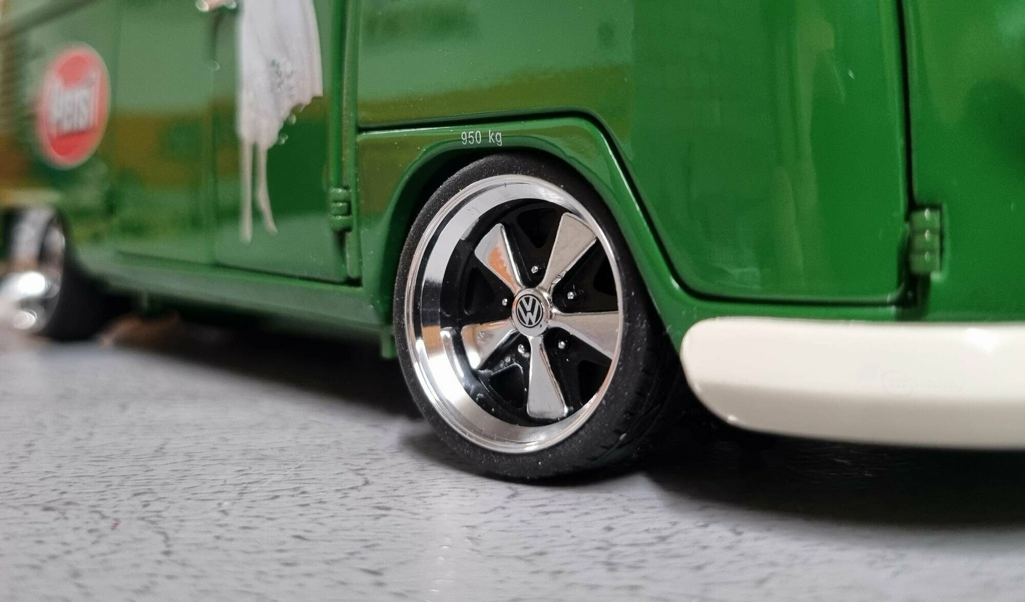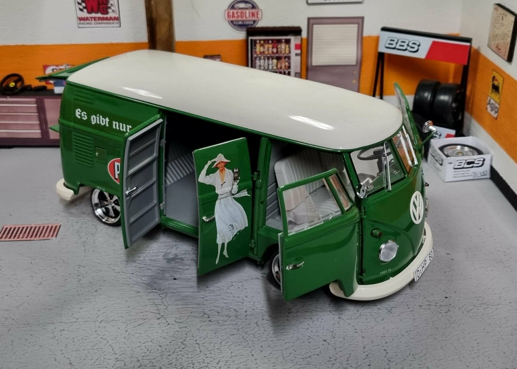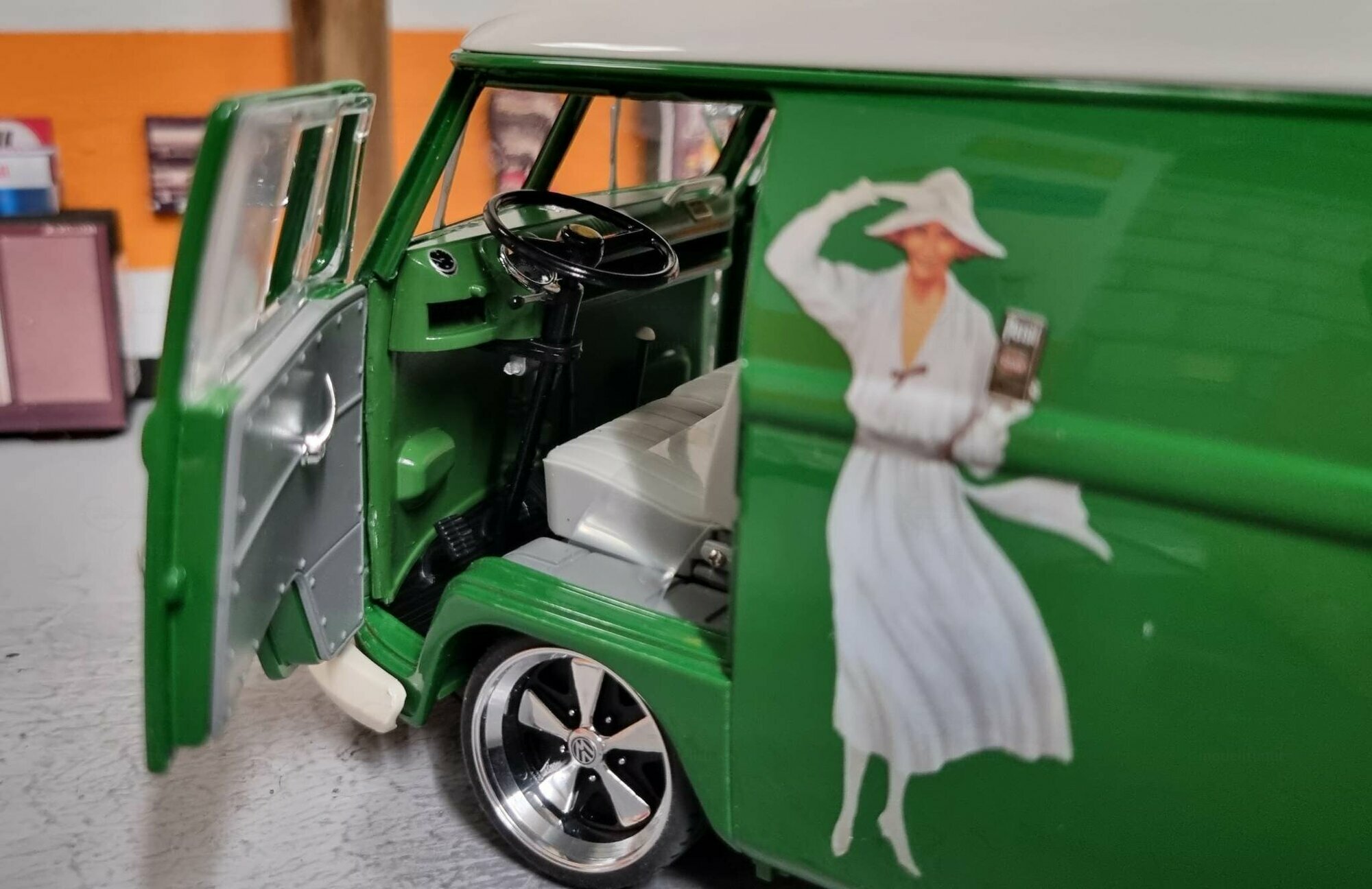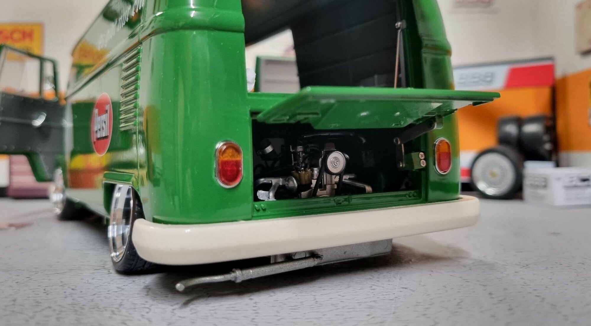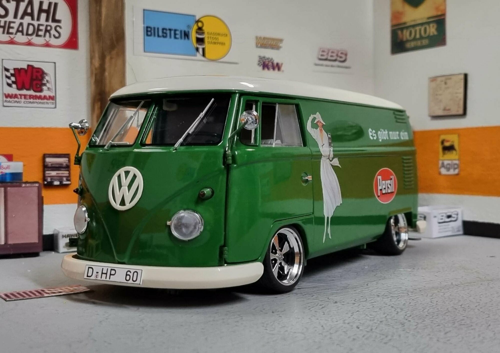 The special customization of the model includes not only the color adaptation but also changes to the wheels. The model features sporty, chrome-shining rims that emphasize the dynamism and performance of the Volkswagen T1. Unfortunately, the manufacturer of the wheels cannot be clearly identified in the pictures. An interesting detail is the authentic license plate reading "D-HP 60", indicating the production year of 1960. The detailed replication of the headlights and taillights exemplifies high-quality model craftsmanship. Additionally, various scattered logos in the background of the workshop create a genuine workshop ambiance.