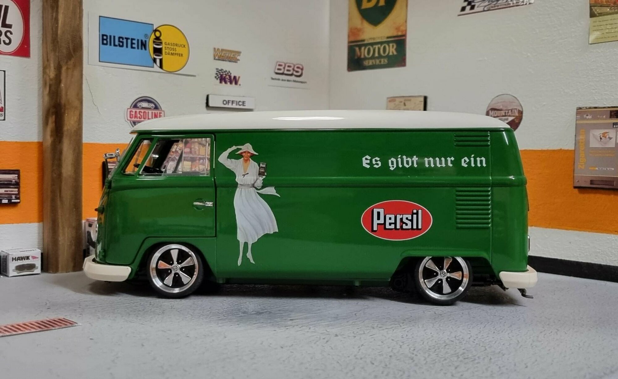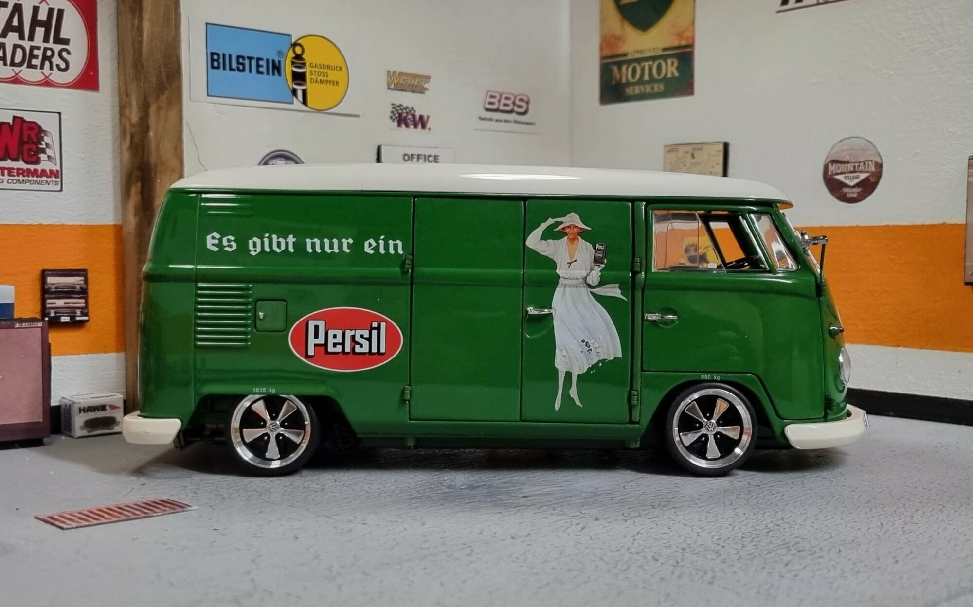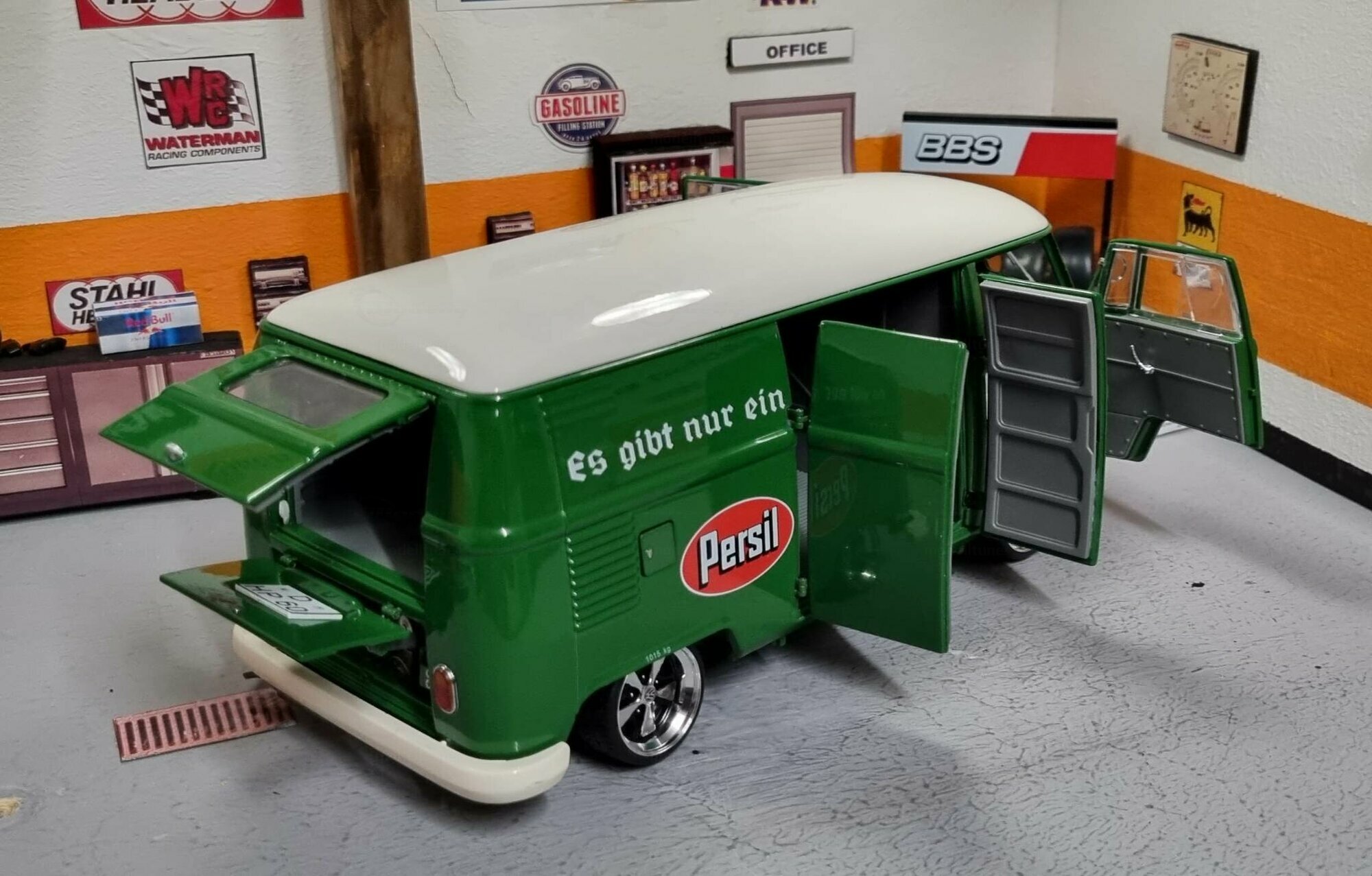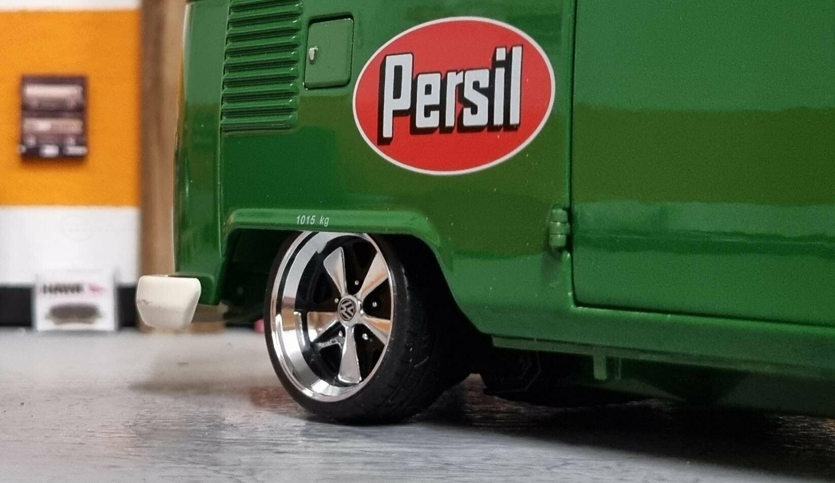 The model displayed is a 1/18 scale replica, meticulously crafted by Schuco using diecast material. It is a modified version and not the original product manufactured by Schuco. This model was customized by a member of the model car community, "modelltuner". The model showcases a detailed design that does justice to the original in many aspects. The striking, glossy green color of the model corresponds to the original marketing colors of the Persil campaign, demonstrating the creativity and skill of the model builder. Adorned with a retro advertising motif and the inscription "There is only one...", the model highlights the historical and cultural value of the Volkswagen T1.