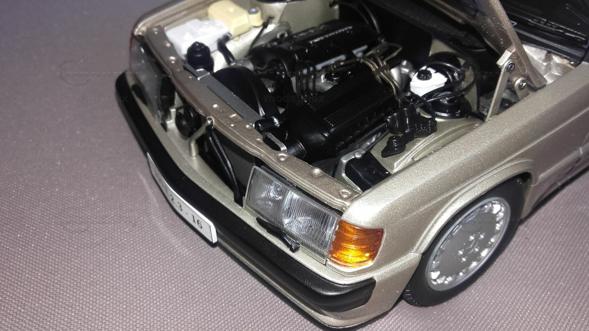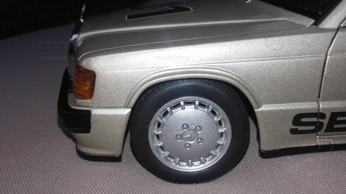 The model version of the Mercedes-Benz 190E 2.3-16V shown here was manufactured by AUTOart in a 1/18 scale. This model is an extremely precise replica, captivating with its detailed execution. The model is made of diecast material and features a silver paint finish with the characteristic "Senna" decal on the windshield and sides. Black numbers on the hood and rear harken back to the car's historic racing legacy. The tiny engine bay is accurately replicated, showcasing even the smallest details like hoses and engine covers.