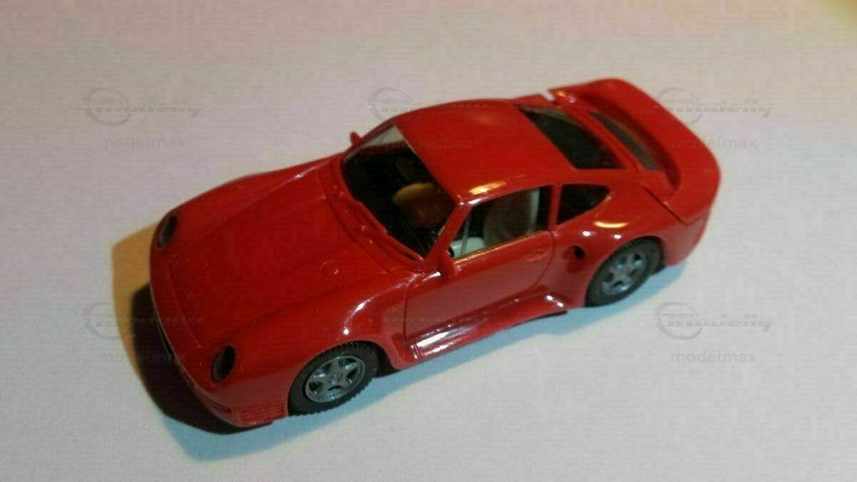 The overall impression is convincing: the silhouette of the Porsche 959 is well captured at this tiny scale, with a recognizable roofline, pronounced wheel arches and subtly hinted aero parts. The red paint is applied evenly; there are no separate printed badges or model name — the shape and the intake details do the identification work. On the driver’s side the window is shown slightly open, which lets you peek into the cockpit and breaks up the scale visually. The wheels fill the arches nicely without sticking out. For dioramas this one works great with late-1980s street scenes thanks to its neutral rolling axles. For collectors the important bit is the consistent 1/87 scale and compatibility with the usual Herpa system, so the model mixes well with other H0 vehicles. As part of “modelmax”’s collection this is a neat example of how a technically important real car gets reduced to a compact, tidy model: small footprint, plastic build, red paint and a faithful line treatment that avoids over-the-top accessories while keeping the car’s key tech traits visible. If you’re searching for “Herpa 1/87 Porsche 959 model car,” this gives you a clear reference: compact dimensions, plastic construction, red finish and a shape that’s true to the original without being overloaded.