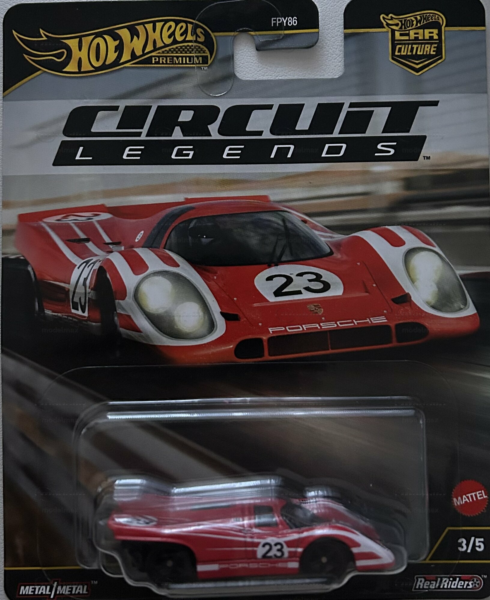 For collectors, the place within the Car Culture lineup matters: “Circuit Legends” is printed in a large font on the card, “Hot Wheels Premium” sits at the top left, and the “Car Culture” logo is at the top right. At the bottom, “Metal/Metal” and “Real Riders” are listed, and the set number 3/5 appears on the right. The item code FPY86 is visible near the top of the card. All of that makes this miniature in “modelmax”’s collection easy to identify. The blister shows the vehicle in side view, which makes the race number, side line, and wheelbase easy to see. The wheels look black and don’t have any flashy trim rings, which fits a race car from that era. The transparent cockpit cover is shown in a dark tint, which supports the closed prototype character. Based on the photo, the build looks clean; the tampo printing is visible on the front and sides, and the card artwork adds a dynamic view of the real car. For searches around Hot Wheels Porsche 917, Car Culture Circuit Legends, Le Mans 1971, and premium 1/64 models, this piece gives a very clear theme match without relying on made-up naming.