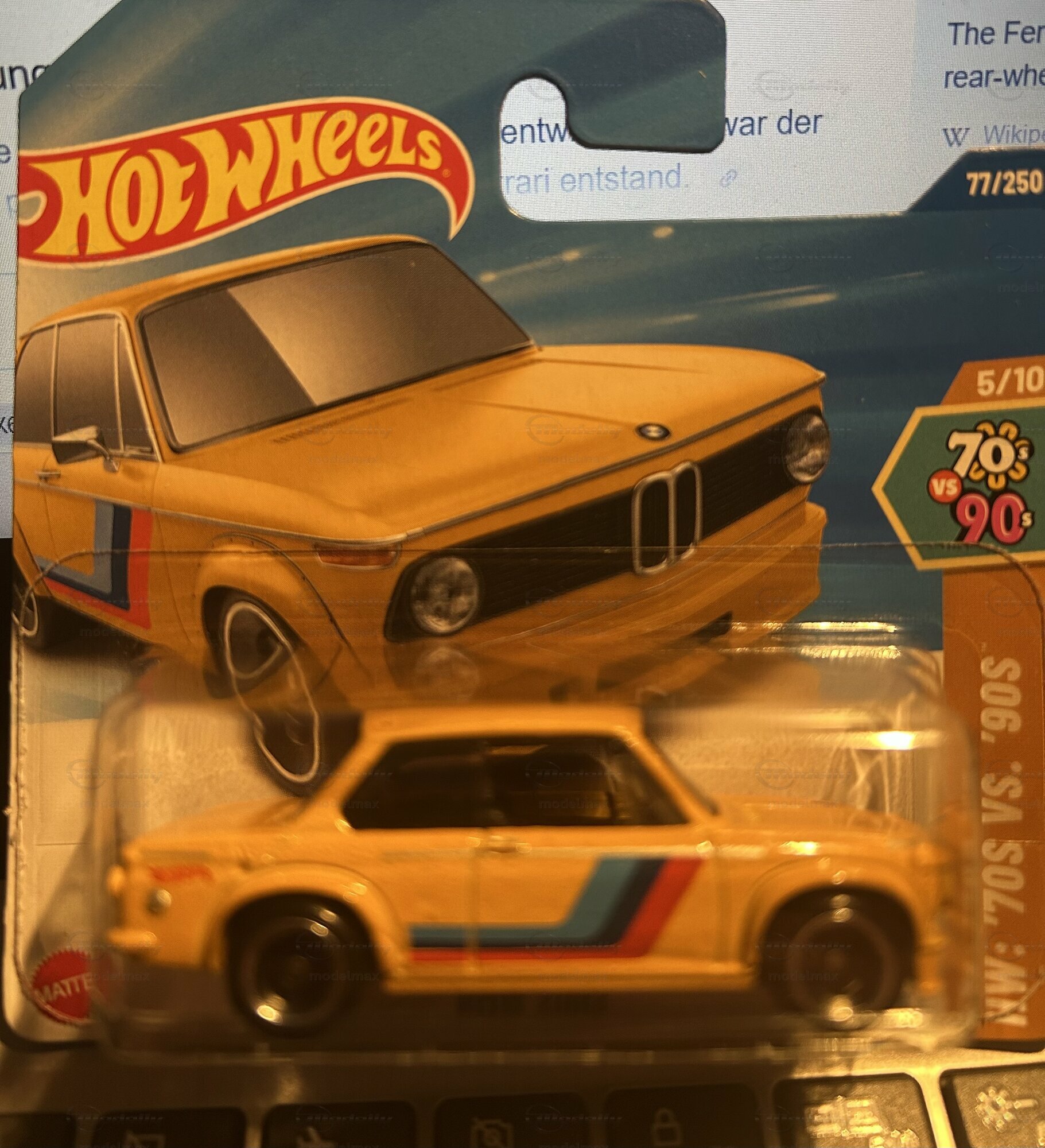 The pictured miniature is a diecast model in 1/64 scale from Hot Wheels, part of modelmax’s collection. Photos show a yellow body with side stripe graphics in light blue, dark blue and red — visually referencing the BMW Motorsport GmbH color scheme. There’s a BMW roundel on the hood, a black grille with a silver-framed twin-kidney motif and printed round headlights up front. The package card notes “70’s vs 90’s” and the series position “5/10,” suggesting a themed release. The body is diecast metal paired with a plastic chassis and a black interior. The windows look slightly tinted. The wheels are black multi-spoke style; no real-world wheel brand is obvious. Scale-wise, a real BMW 2002 at about 4.23 m (166.5 inches / 13.9 ft) translates to approximately 66 mm (2.6 inches) in 1/64 scale, which matches the shown model well. The finish shows clean tampo prints on the front and sides; the underside is fairly plain, typical of this casting’s simplifications.