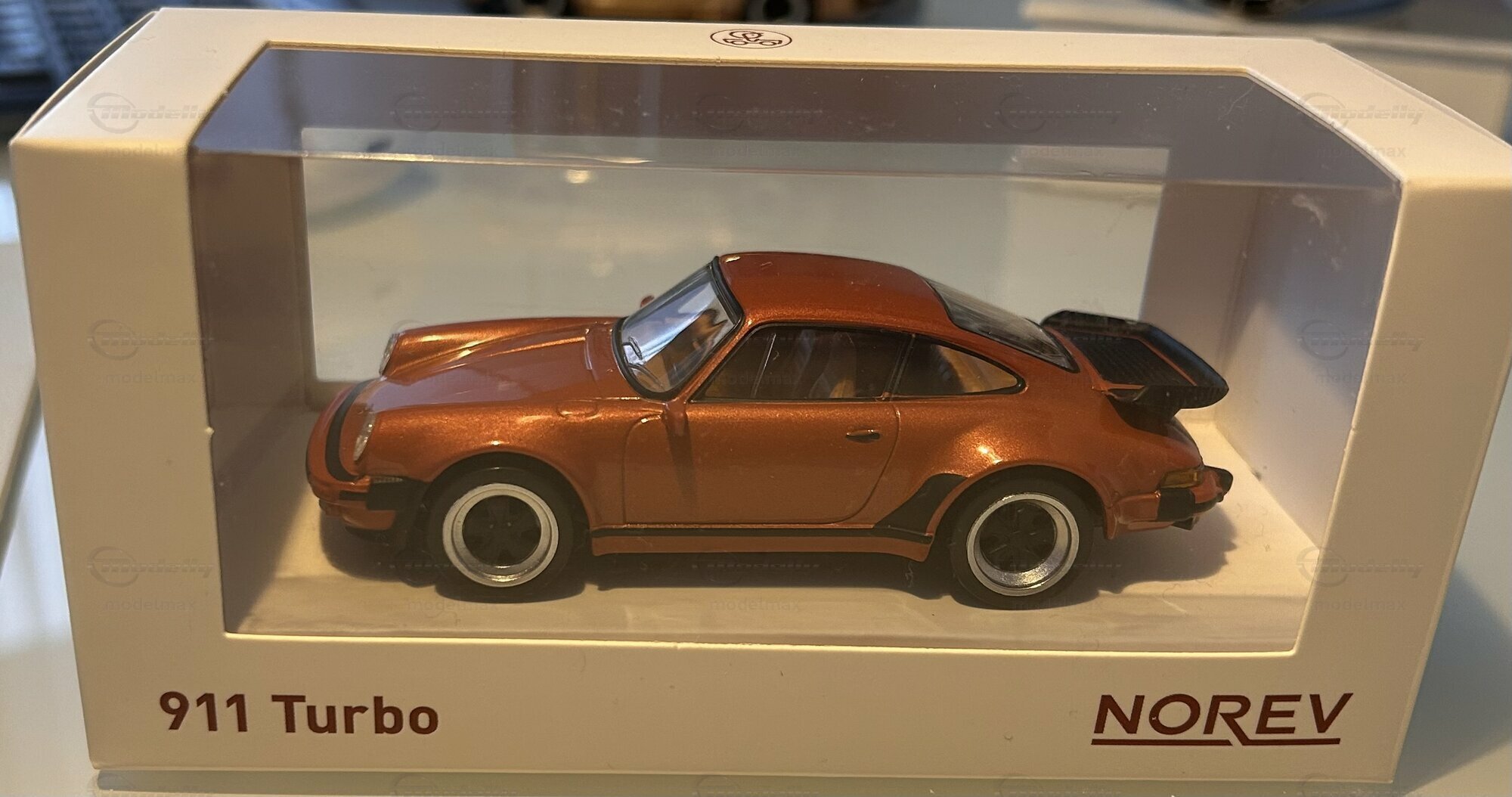 The miniature shown belongs to collector “modelmax” and represents the Porsche 911 Turbo in the common display scale 1/43. It’s a diecast body, which gives a nice solid feel and good surface finish. The photos show a copper‑brown metallic paint that looks like period Porsche colors (think “Copper Brown Metallic”). The metallic flakes and gloss bring out the 930’s lines: the rounded front fenders, the pronounced rear haunches and the black “whale tail” spoiler. Front and rear bumpers have black rubber trims like the real deal. The wheels mimic the Fuchs look with a black center and polished rim — a signature 930 touch. Behind the clear windows you can spot a dark‑brown interior with front seats, a rear bench and a dashboard. Overall the scale looks consistent: short overhangs, a low hood, the gently sloping roof and the steep rear deck. The model comes in a white display box with a clear window; the base is labelled “911 Turbo” and the maker Norev is printed on it.