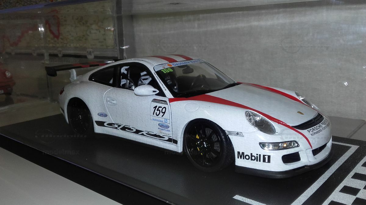 The pictured collectible is a 1/18 scale model from Welly and belongs to the collector “modelmax.” Made of diecast metal, it captures the 997’s typical silhouette with the wide rear, large multi-bolted rear wing and the oval headlights. The paint is white with two red stripes: one runs down the center of the hood, the other follows the fender and door back toward the rear. The GT3 RS badge appears as a dark decal on the side skirts; black wheels with an “RS” marking and yellow brake calipers add contrast. At the front the bumper has small extra lights and the racing number 159 sits on the door. You can spot sponsor logos like Mobil 1 on the front splitter and the “Porsche Zentrum Nürnberg-Fürth-Erlangen” decal on the rear. The windshield has a race number sticker as you’d expect in club or one-make races. Inside you can see the white roll cage, a racing bucket seat, harness guides and the stripped-down dash. The taillights are done in red-transparent plastic, the panel gaps on doors and hoods are even; the crest on the front is cleanly applied. All in all the model looks honest and well-proportioned and conveys the technical cues of the real car. This 1/18 Welly model is a nice display piece next to other 997 variants thanks to its visible racing components.