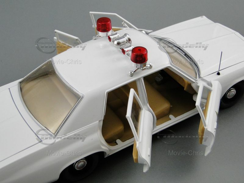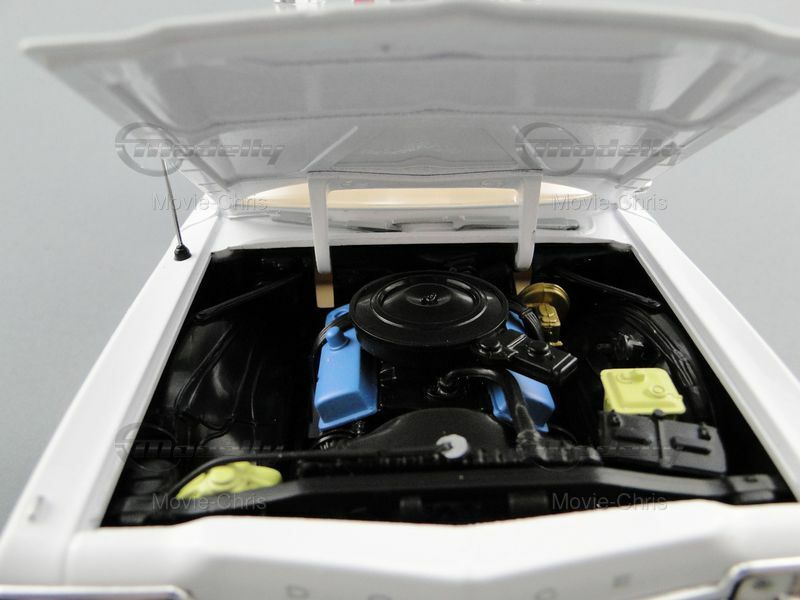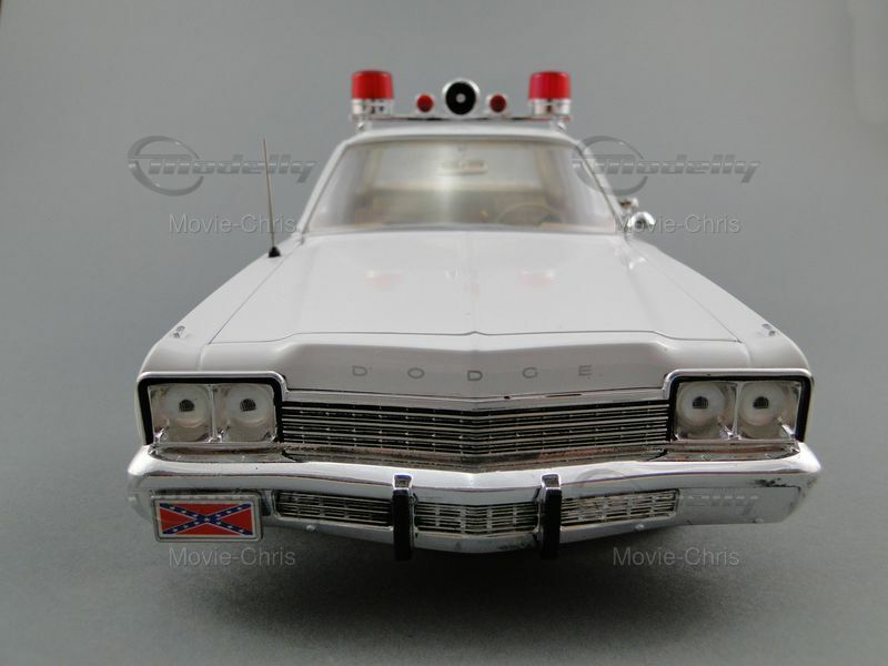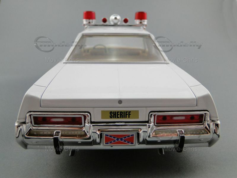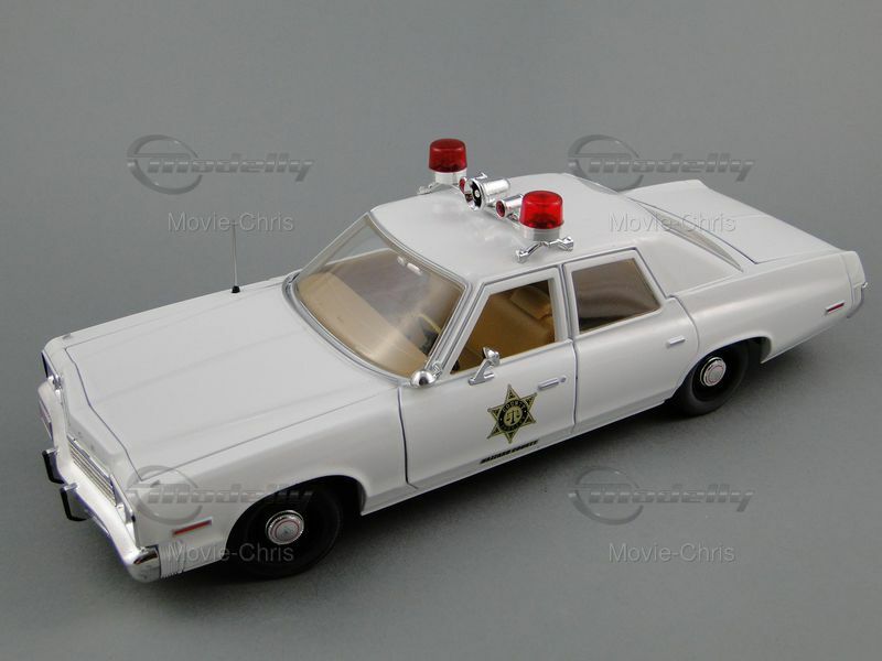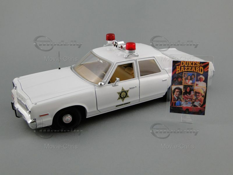 The 1/18 miniature of the Dodge Monaco by Ertl stands out for its attention to detail and meticulous craftsmanship. For model enthusiasts like "Movie-Chris," this model is an outstanding example of the fusion of nostalgia and precision. The printed box with a picture of the main characters from "The Dukes of Hazzard" complements the set, making it a special piece in any collection. The model car body includes fine lines and contours that are also recognizable in the 1/18 scale. The detailed police emblems and the red painted sirens make this model a must-have for any collector of movie and TV vehicles.