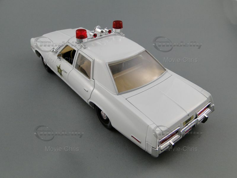 The 1/18 scale miniature by Ertl is an accurate replica of the Dodge Monaco police car. The model showcases a white police-like livery with decals and insignia of the Hazzard County Sheriff Department. The red sirens lights on the roof are positioned correctly, adding to the authenticity of this model. Even the small details like side mirrors, door handles, and rims have been faithfully reproduced. The interior is in beige color, depicting a detailed replica of the original cockpit and seats.