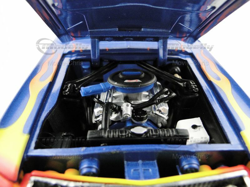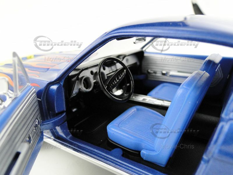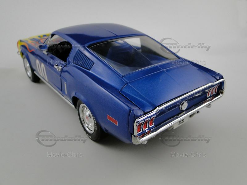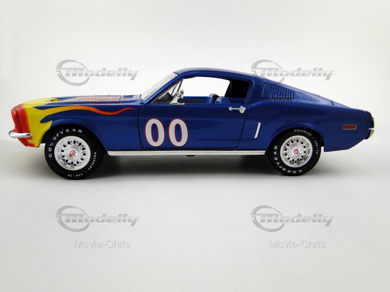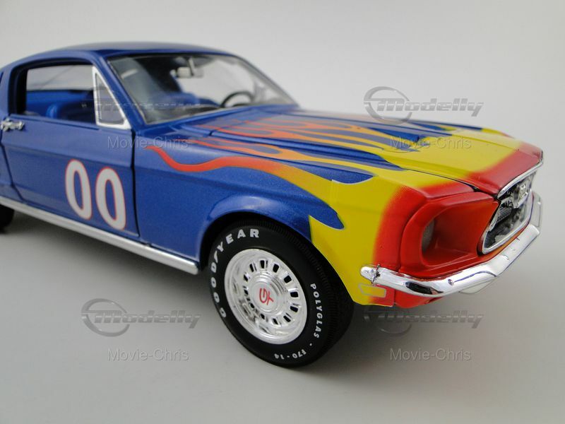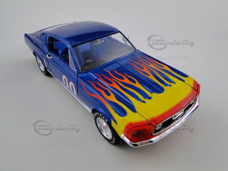 This detailed scale model in 1/18 scale was manufactured by Ertl and represents an exact replica of the Ford Mustang GT. It is part of the collection of Modelly member "Movie-Chris" and is instantly recognizable by its striking paint job. The model features a vibrant flame design on the hood surrounded by a bold blue color. The race number "00" is displayed on the doors, giving the model an authentic racing look. Attention to detail is also evident in the realistically designed wheels, sporting Goodyear tires, and standing out with their precise replication. The iconic Mustang emblem is clearly visible on the front of the model, while the distinctive air intakes and the curved body shapes emphasize the unmistakable appearance of the Mustang GT. The model comes with realistic features like steerable front wheels, opening doors, and hood, making it a high-quality piece for collectors.