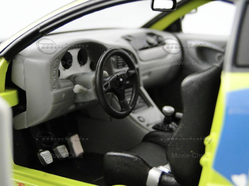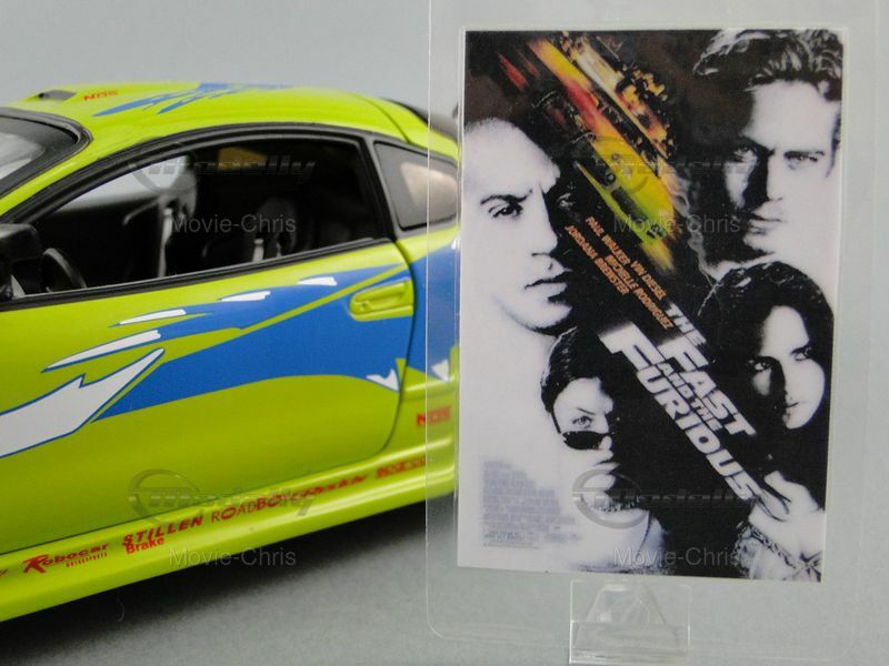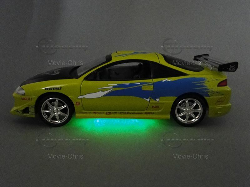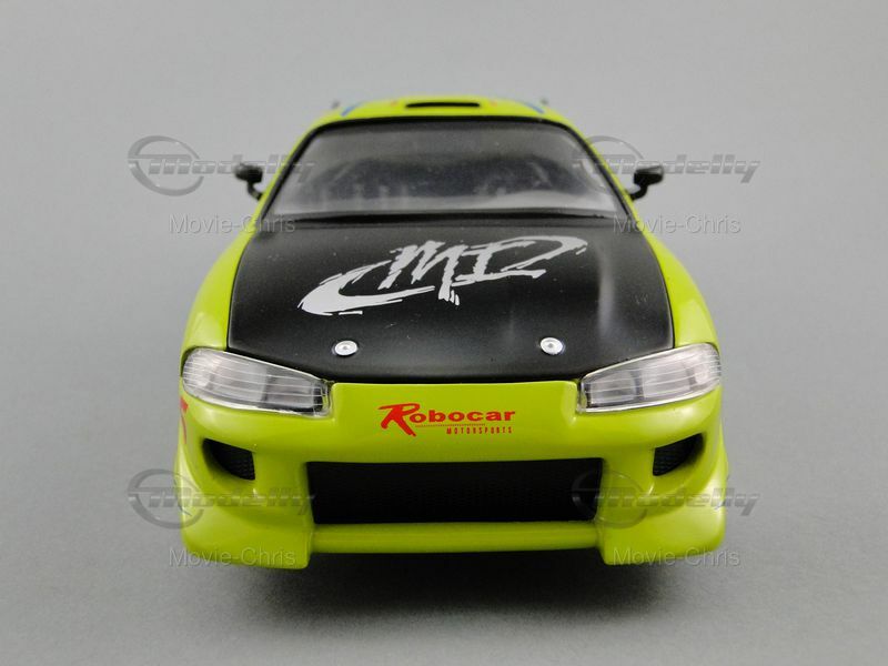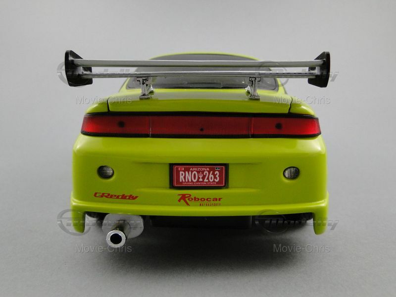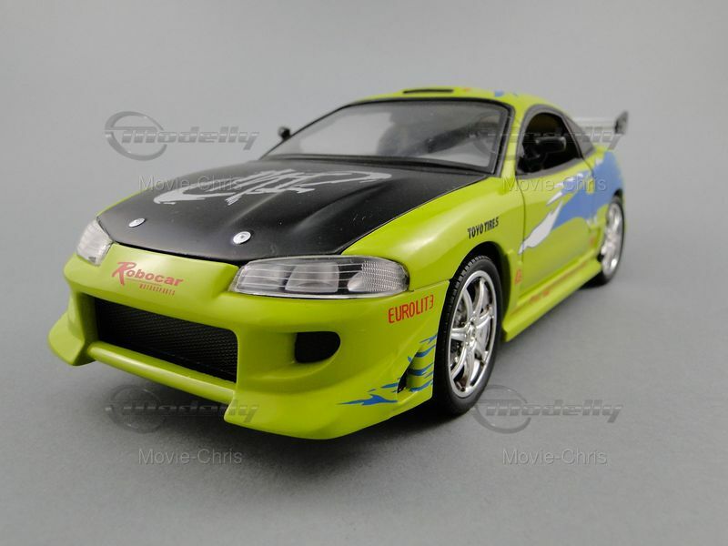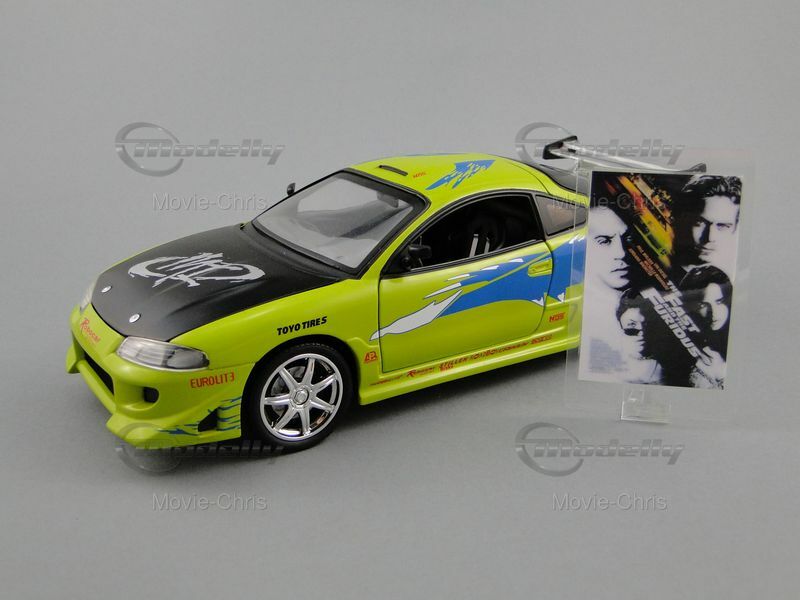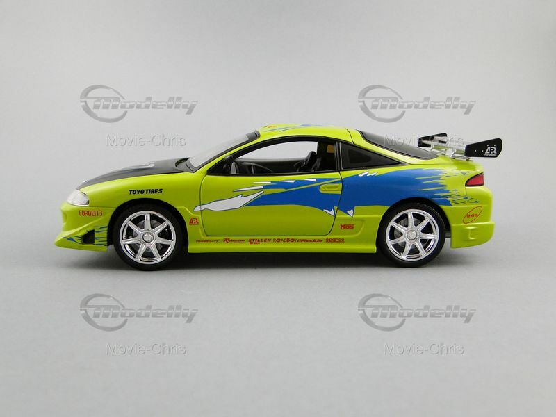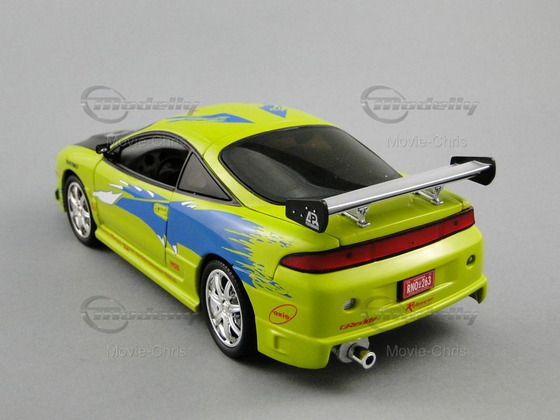 The model car depicted here represents the Mitsubishi Eclipse Coupe from the successful film The Fast and the Furious. In this movie, the character Brian O'Conner, played by Paul Walker, drives this car in the opening scenes. Brian is an undercover cop investigating the illegal street racing scene in Los Angeles. The car is shown in a dramatic race scene where Brian competes against Dominic Toretto, played by Vin Diesel. The eye-catching paintwork and numerous sponsor decals, like Toyo Tires and AEM, make the model an instantly recognizable icon for film and car fans.