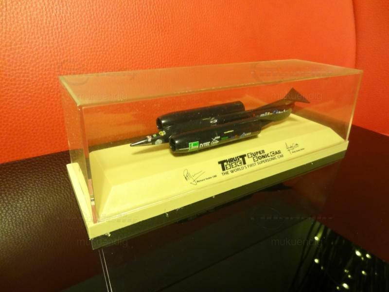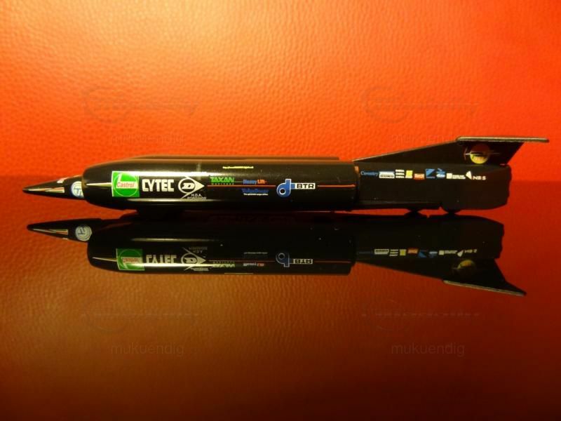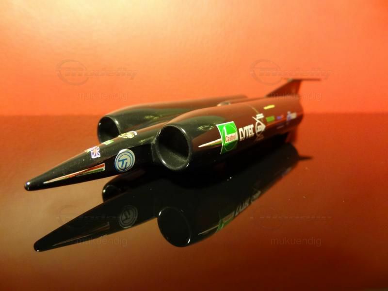 The 1/43 diecast miniature by Lledo impresses with its glossy and bold black finish. Numerous logos and decals, including those of Castrol and Cytec, are visible on the model, just like they are prominently displayed on the original. The exceptional shape of the Thrust SSC, including the pointed front and wide stabilizing rear wheels, is carefully and accurately replicated. The collector Mukuendig has in this miniature a piece of automotive history in his collection, which stands out not only for its historical significance but also for its remarkable attention to detail and quality.
